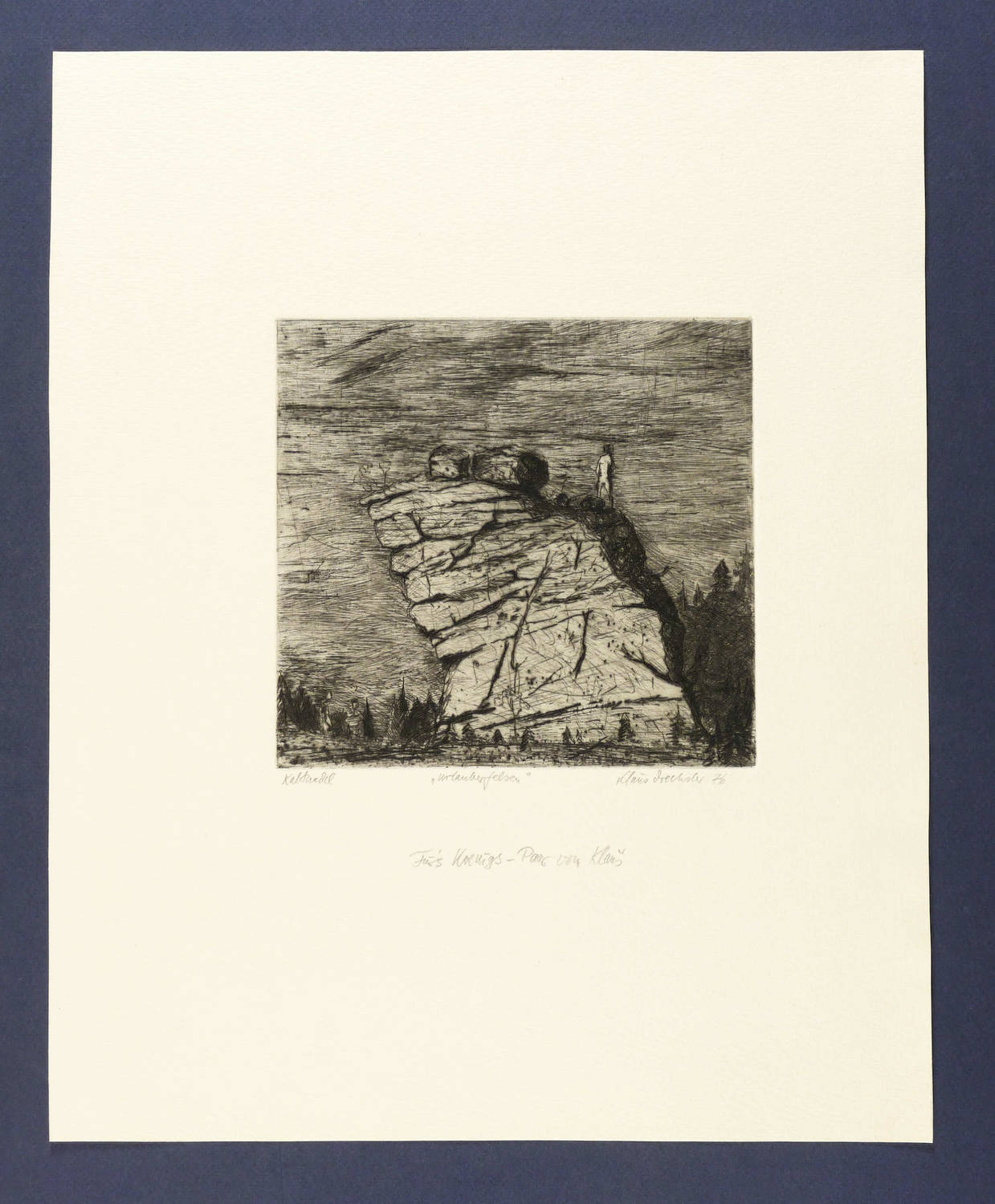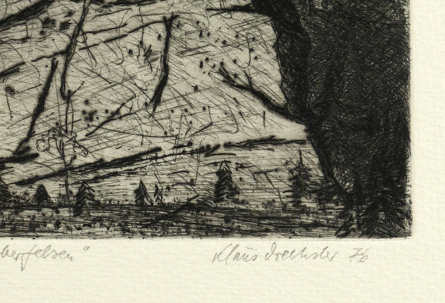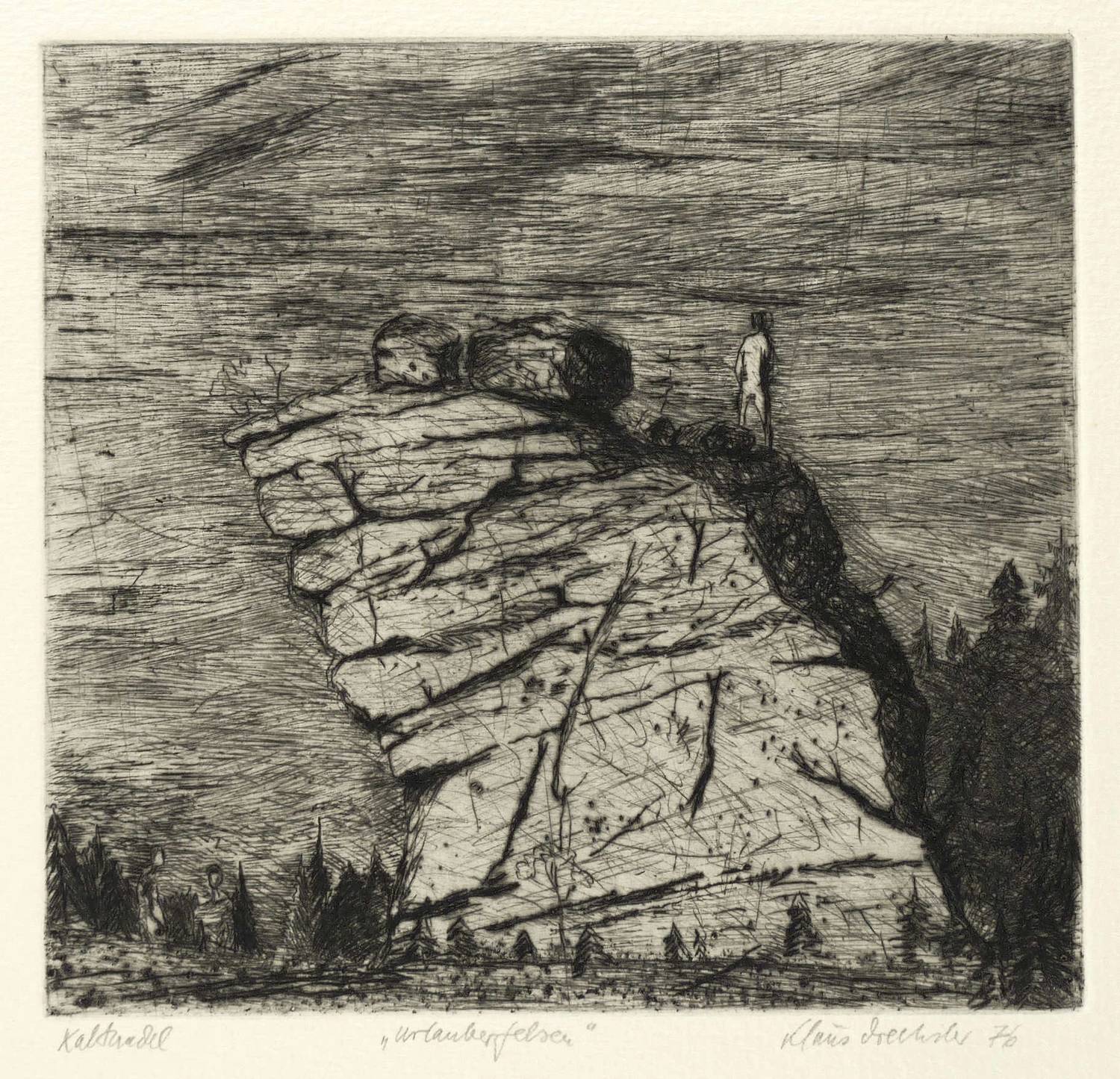 1976. Radierung / Kaltnadel, in Schwarz, auf hartem hellgelbem Maschinenpapier. – Originale Künstlergrafik, von Klaus Drechsler. – 17,1 x 18,1 cm (Darstellung / Platte), 41,5 x 33 cm (Blatt).
