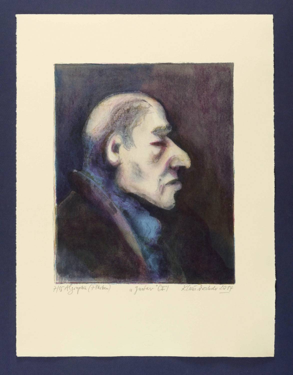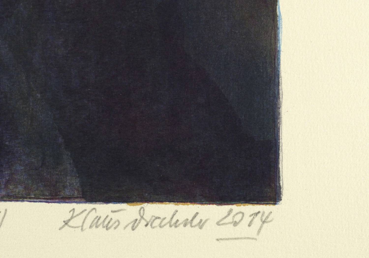 2014. Farbalgrafie / Pinselalgrafie, in 7 Farben, auf schwerem gelbem Hahnemühle-Bütten. – Originale Künstlergrafik, von Klaus Drechsler. – Auflage Exemplar Nr. 7/15. – 34,2 x 28,0 cm (Darstellung / Druckbild), 53,5 x 40,5 cm (Blatt).