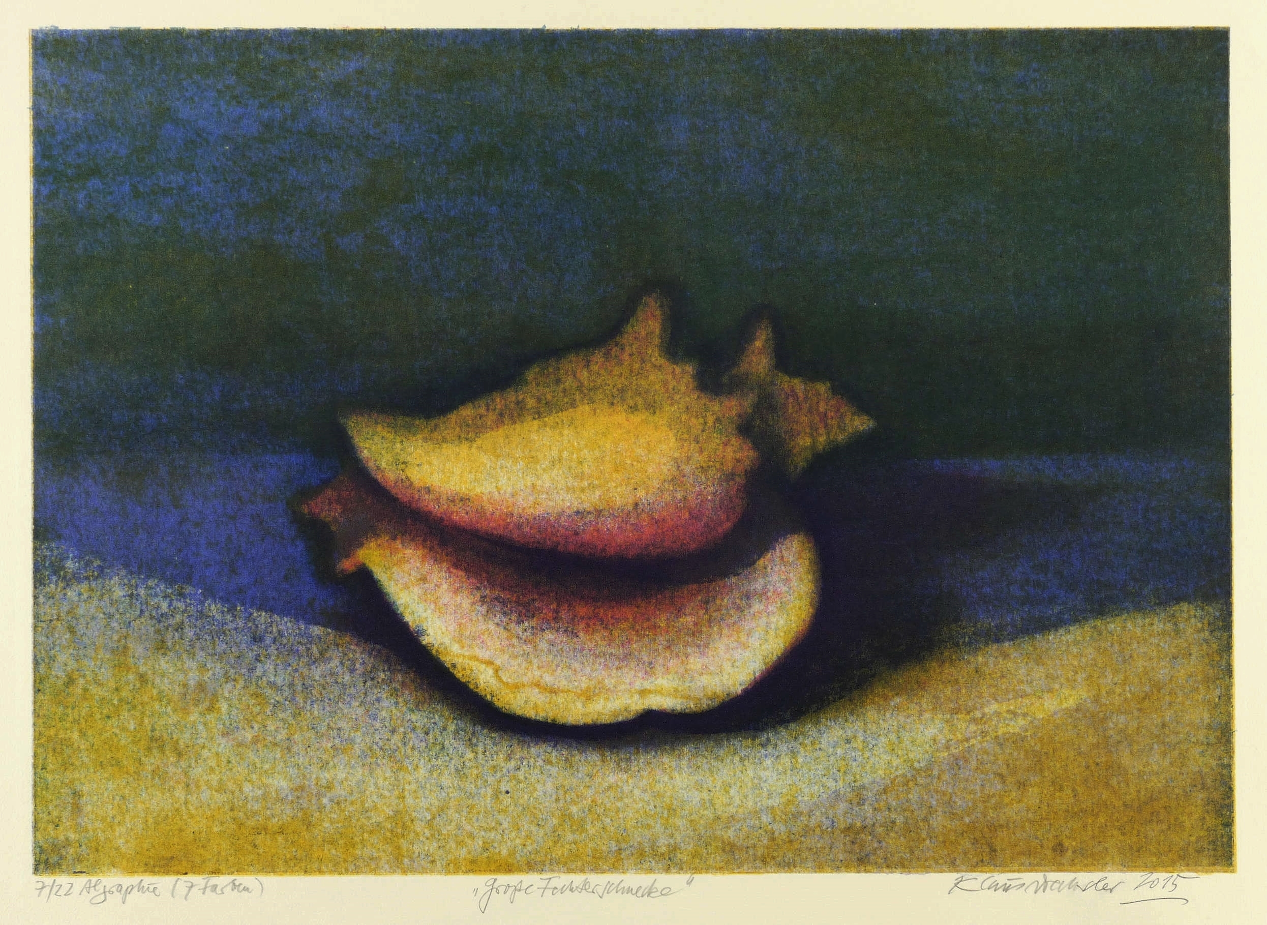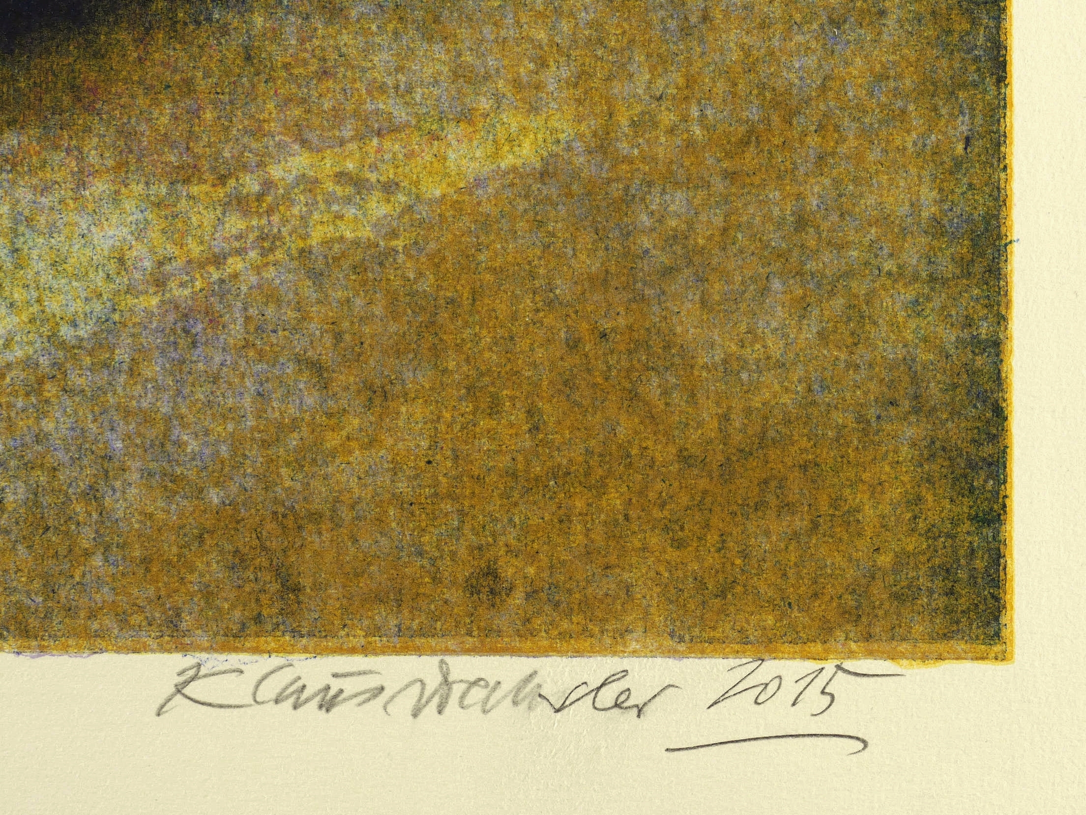 2015. Farbalgrafie / Pinselalgrafie, in 7 Farben, getupft, auf schwerem gelbem Hahnemühle-Bütten. – Originale Künstlergrafik, von Klaus Drechsler. – Auflage Exemplar Nr. 7/22. – 43,0 x 61,0 cm (Darstellung / Druckbild), 53,5 x 79 cm (Blatt).