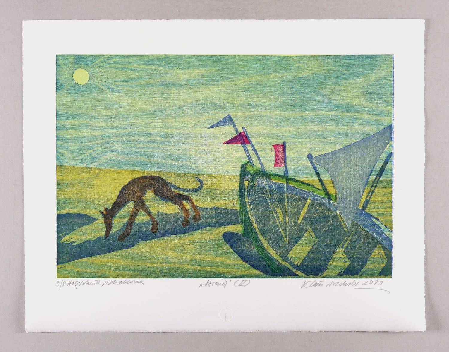 2021. Farbholzschnitt, mit Pochoir, in 4 Farben, auf weißem Zerkall. – Originale Künstlergrafik, von Klaus Drechsler. – Auflage Exemplar Nr. 3/8. – 30,1 x 45,3 cm (Darstellung / Druckbild), 43 x 54 cm (Blatt).