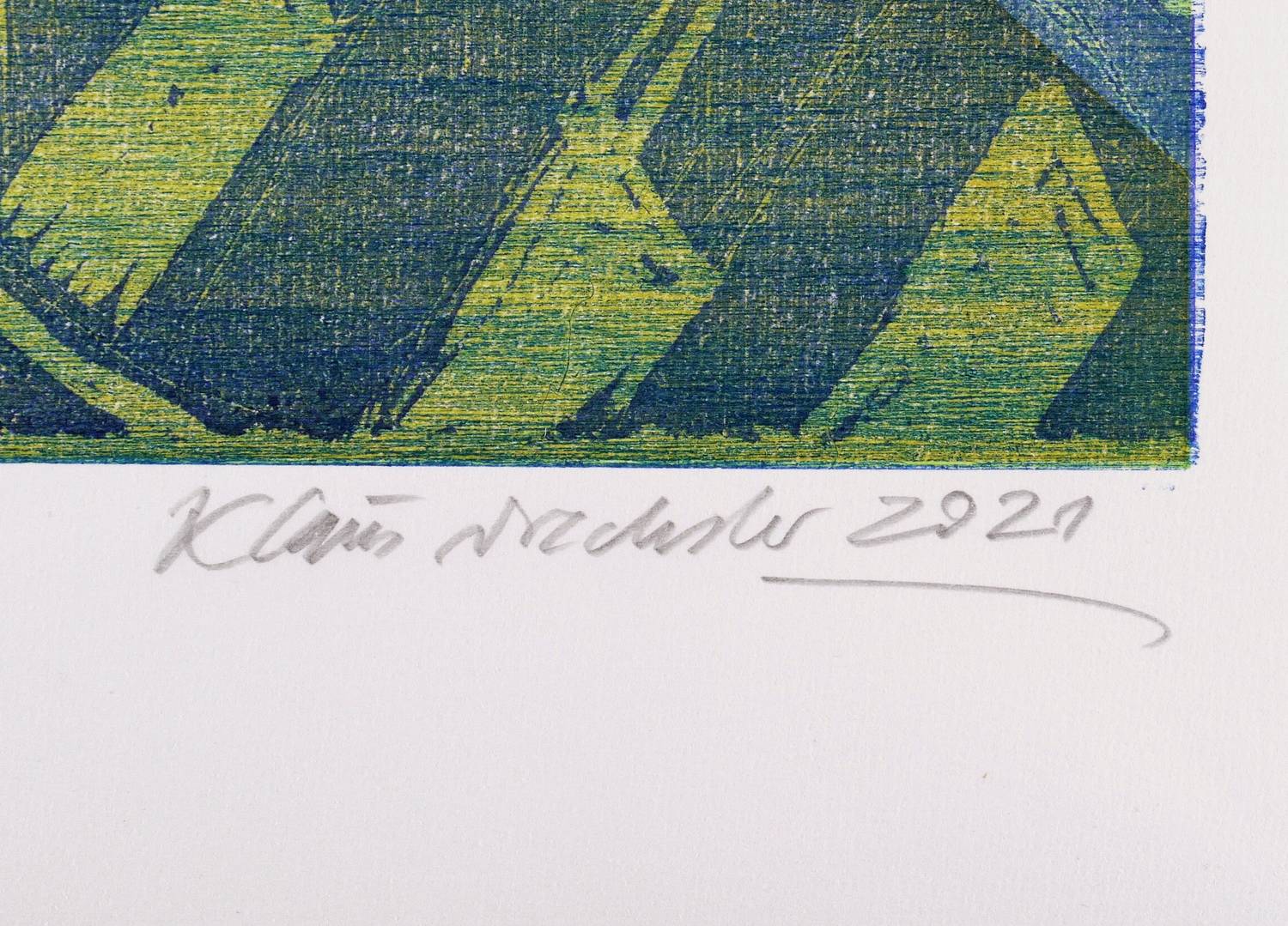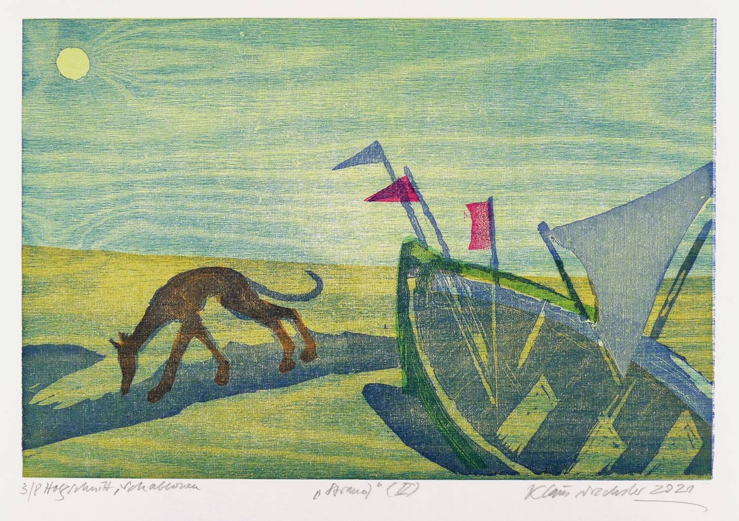 Rechts unten in Bleistift signiert und datiert: ″Klaus Drechsler 2021″. Links Auflagen- und Technikbezeichnung: ″3/8 Holzschnitt, Schablonen″. Mittig Titel: ″Strand (II)″. Trockenstempel der Grafikwerkstatt Dresden. – Sehr guter Zustand.