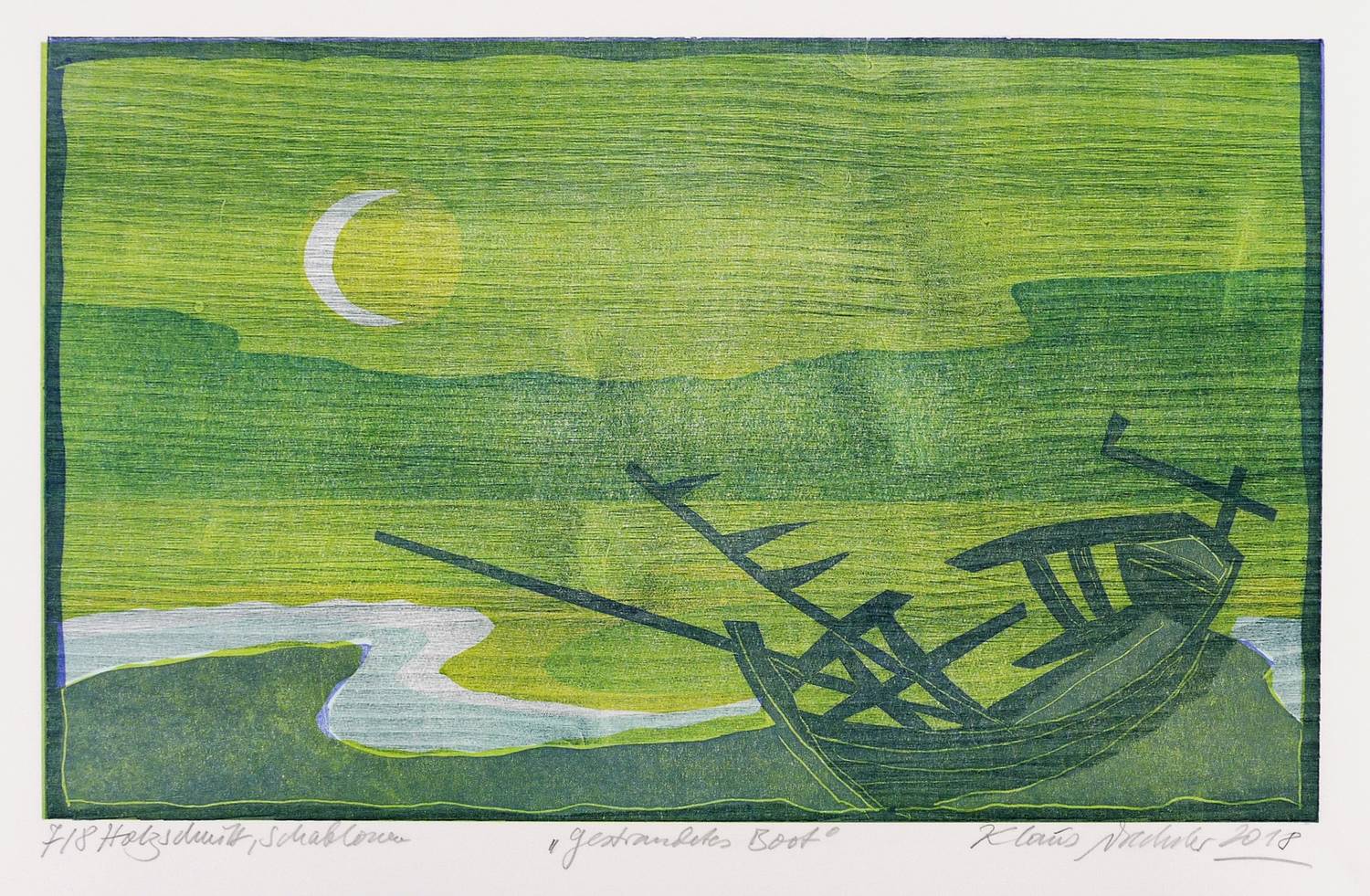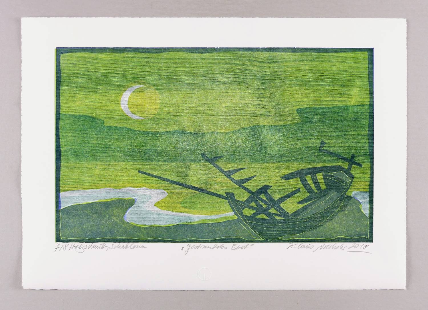 Rechts unten in Bleistift signiert und datiert: ″Klaus Drechsler 2018″. Links Auflagen- und Technikbezeichnung: ″7/8 Holzschnitt, Schablonen″. Mittig Titel: ″Gestrandetes Boot″. Trockenstempel der Grafikwerkstatt Dresden. – Sehr guter Zustand.