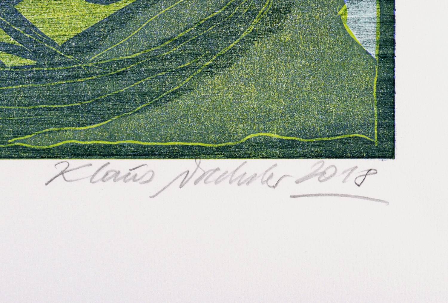 2018. Farbholzschnitt, mit Pochoir, in 3 Farben, auf weißem Zerkall. – Originale Künstlergrafik, von Klaus Drechsler. – Auflage Exemplar Nr. 7/8. – 27,3 x 44,6 cm (Darstellung / Druckbild), 39 x 54 cm (Blatt).