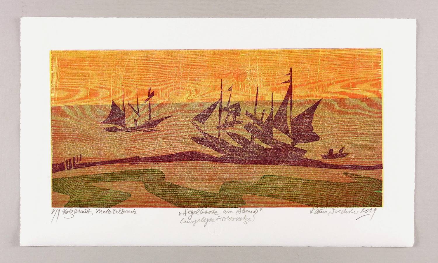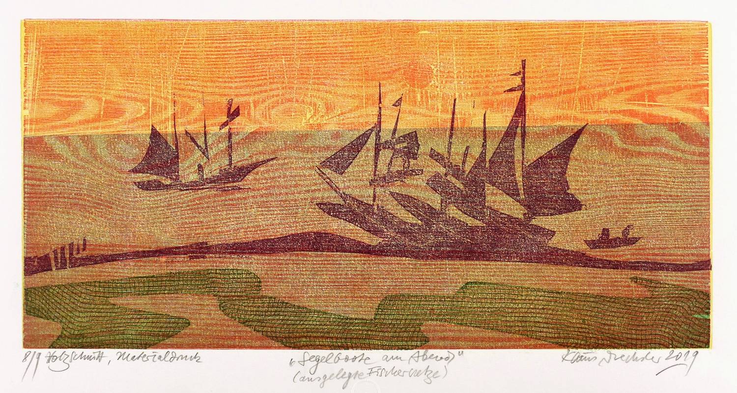 Rechts unten in Bleistift signiert und datiert: ″Klaus Drechsler 2019″. Links Auflagen- und Technikbezeichnung: ″8/9 Holzschnitt, Materialdruck″. Mittig Titel: ″Segelboote am Abend (ausgelegte Fischernetze)″. Trockenstempel der Grafikwerkstatt Dresden. – Sehr guter Zustand.