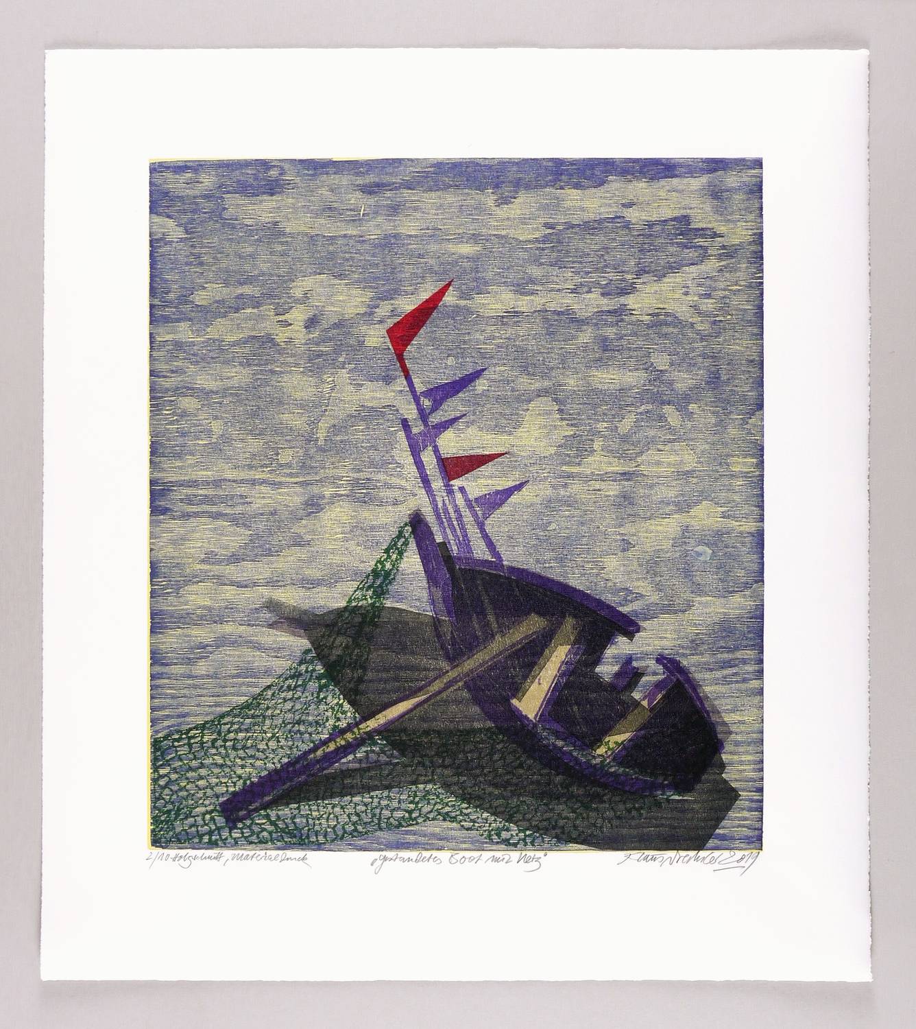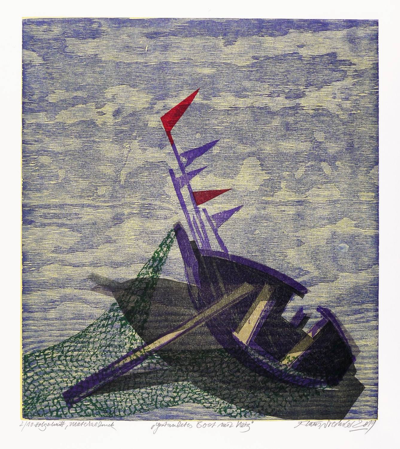 Rechts unten in Bleistift signiert und datiert: ″Klaus Drechsler 2019″. Links Auflagen- und Technikbezeichnung: ″2/10 Holzschnitt, Materialdruck″. Mittig Titel: ″Gestrandetes Boot mit Netz″. Trockenstempel der Grafikwerkstatt Dresden. – Sehr guter Zustand.