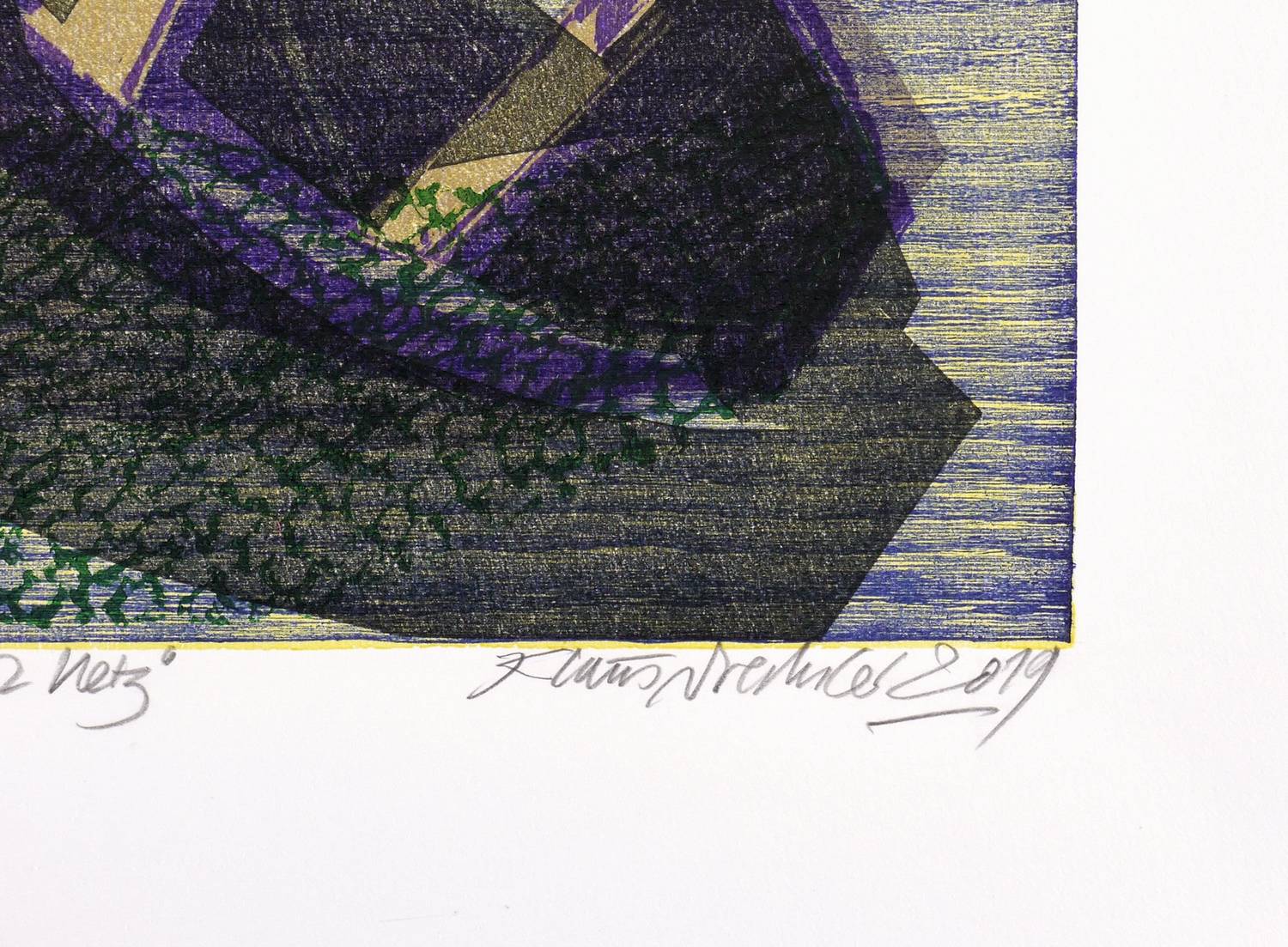 2019. Farbholzschnitt, mit Materialdruck, in 7 Farben, auf weißem Zerkall. – Originale Künstlergrafik, von Klaus Drechsler. – Auflage Exemplar Nr. 2/10. – 44,8 x 39,9 cm (Darstellung / Druckbild), 61 x 54 cm (Blatt).