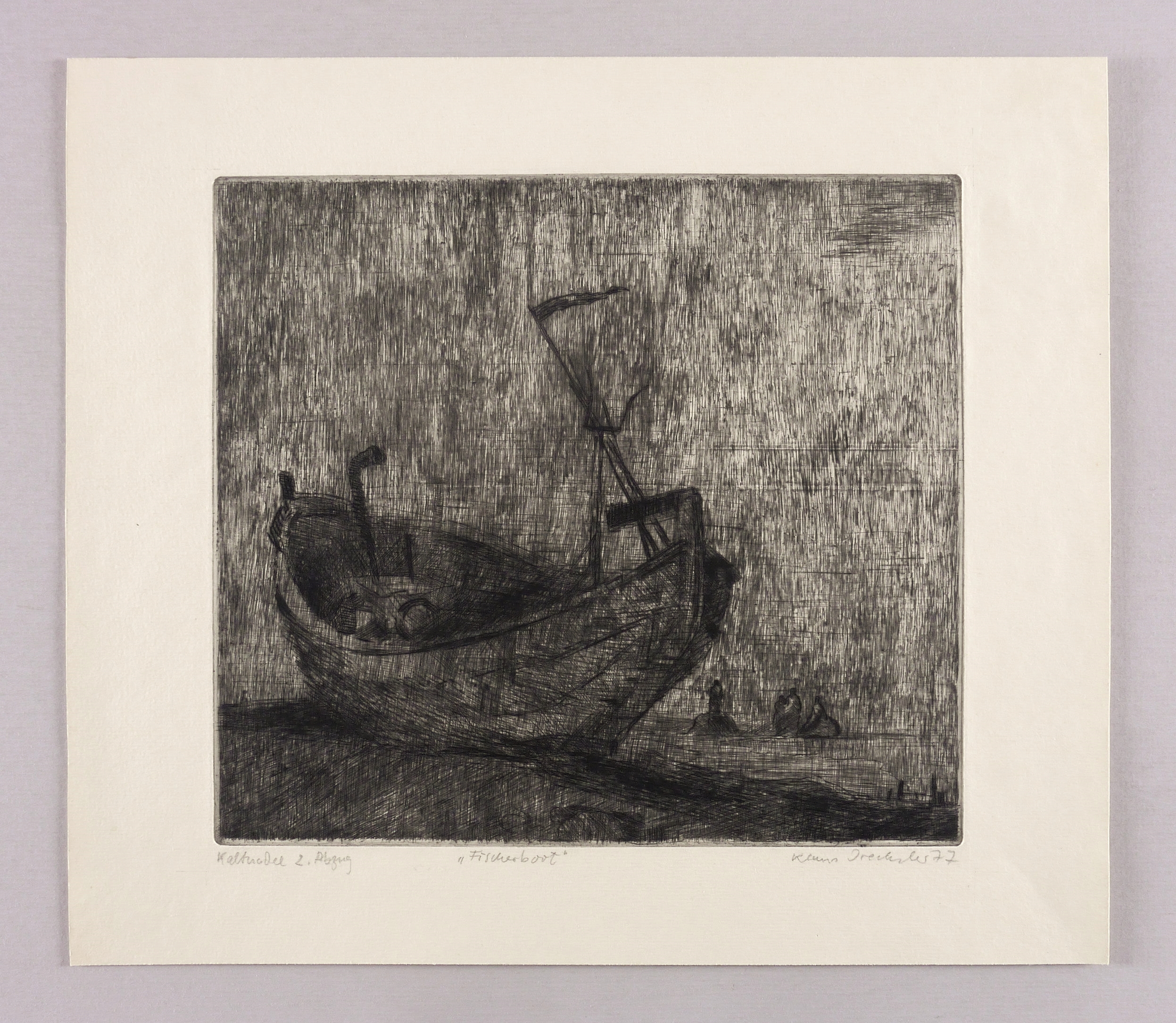 Rechts unten in Bleistift signiert und datiert: ″Klaus Drechsler 77″. Links Technik- und Auflagenbezeichnung sowie Titel: ″Kaltnadel 2. Abzug // Fischerboot″. – Provenienz: Sammlung Gerlint Söder und Erhard Frommhold, Dresden. – Sehr guter Zustand.