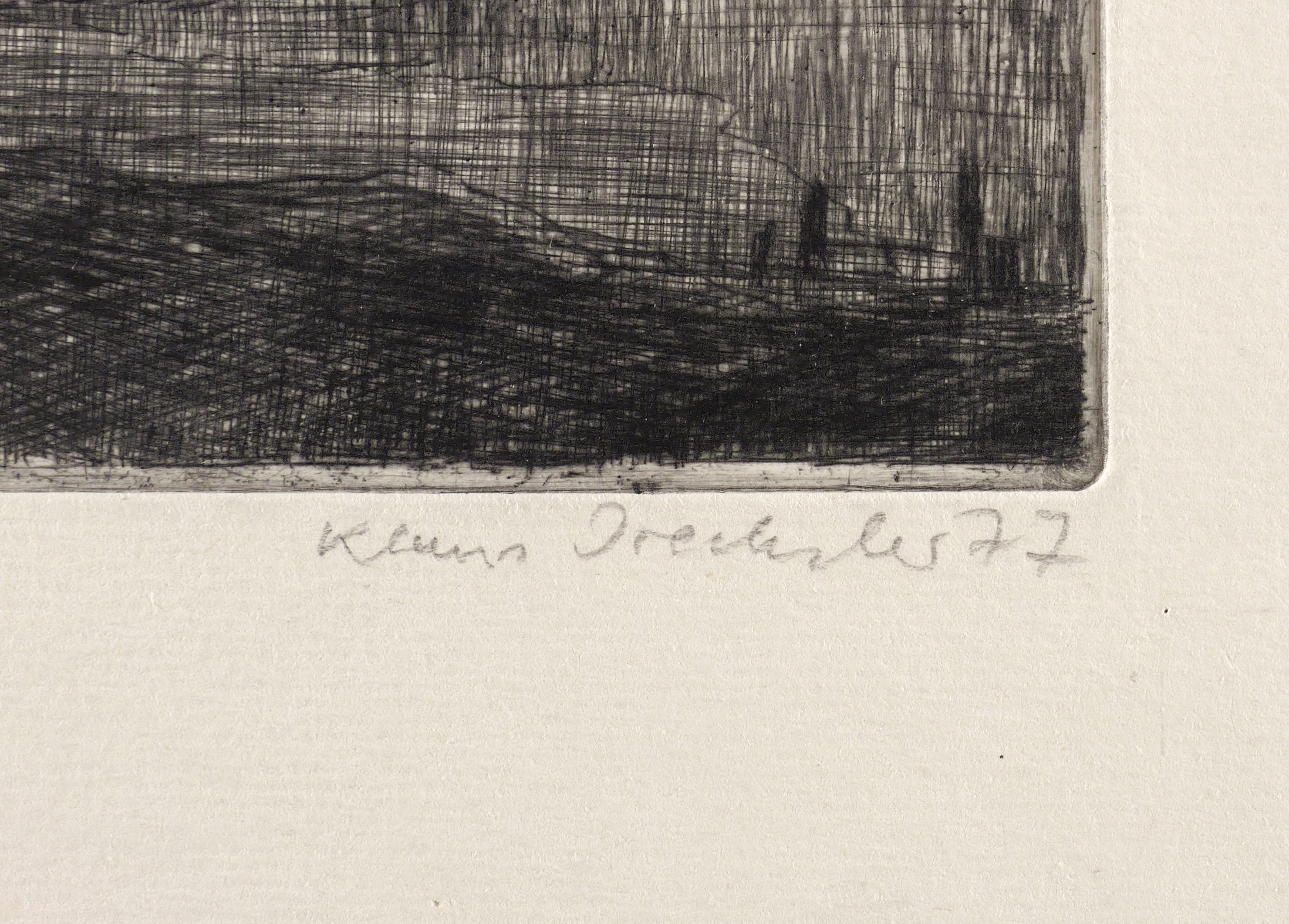 1977. Radierung / Kaltnadel, in Schwarz, auf hartem hellgelbem Maschinenpapier. – Originale Künstlergrafik, von Klaus Drechsler. – Auflage Exemplar Nr. 2. – 24,2 x 27,0 cm (Darstellung / Platte), 33 x 38 cm (Blatt).