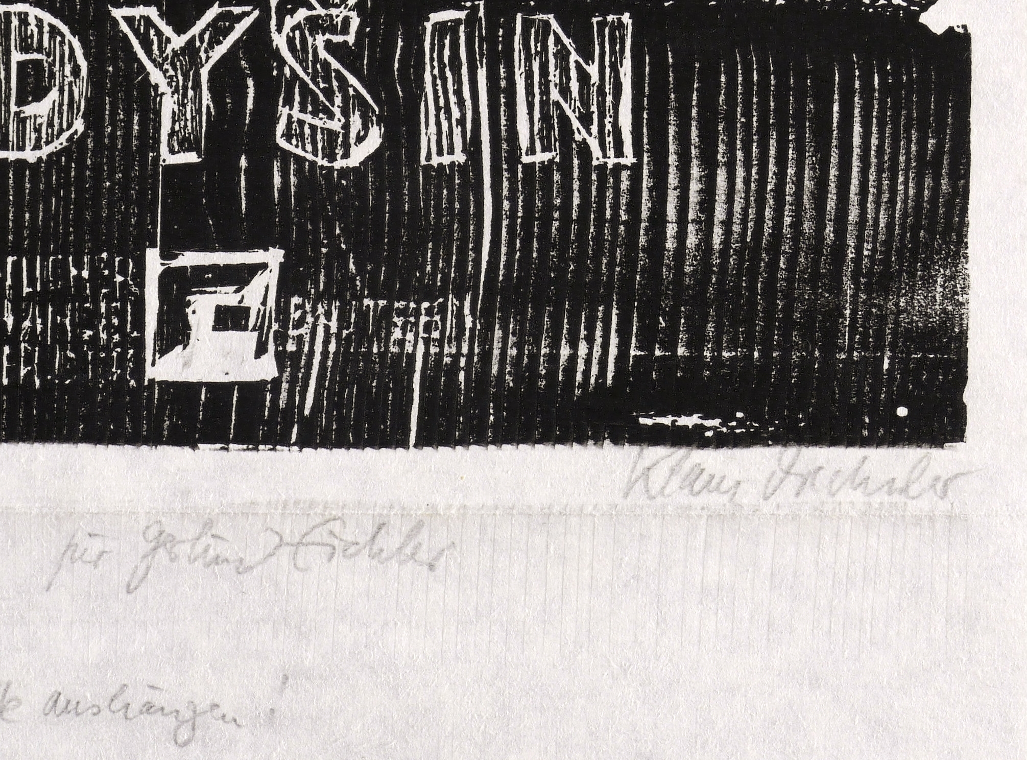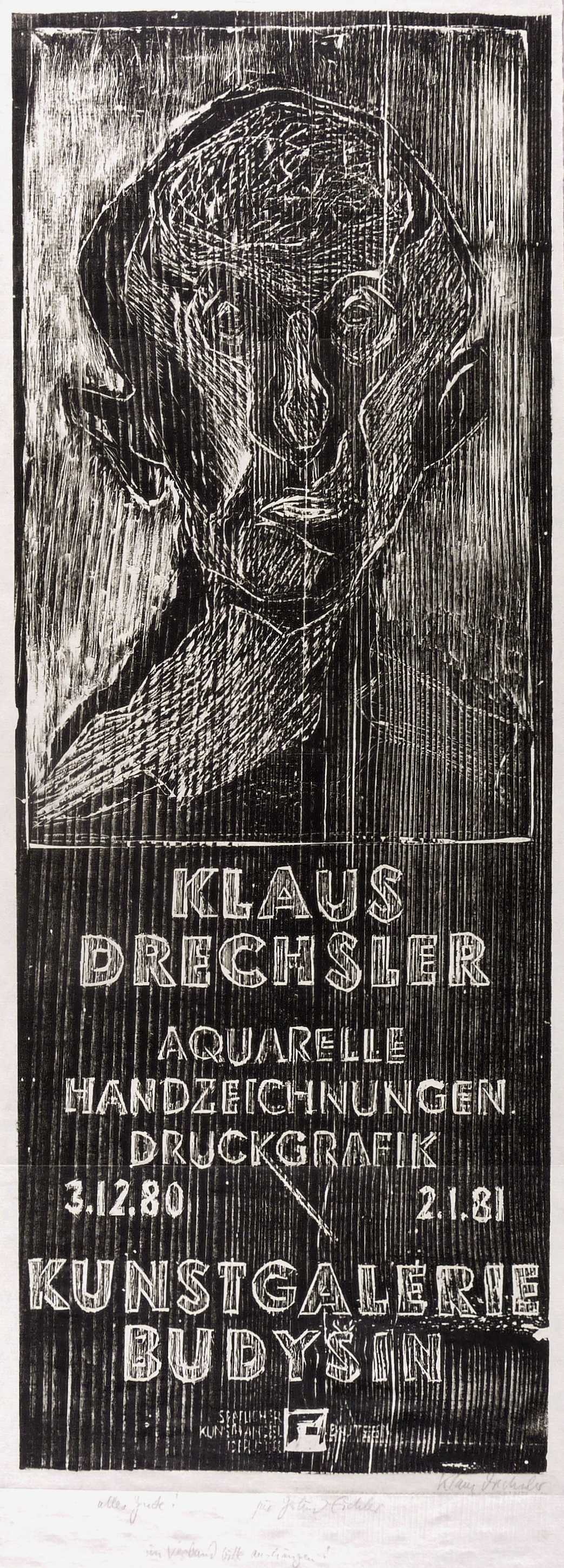 Rechts unten in Bleistift signiert: ″Klaus Drechsler″. Unterhalb bezeichnet: ″alles Gute! / im Verband bitte aushängen!″ Im Druckstock diverse Inschriften. – Originalgrafisches Künstler-Plakat zur Ausstellung ″Klaus Drechsler. Aquarelle, Handzeichnungen, Druckgrafik″ in der Kunstgalerie des Staatlichen Kunsthandels in Bautzen 3.12.1980-2.1.1981. – Provenienz: Sammlung Gerlint und Gert Söder, Dresden. – Ausgelegene Falten aus dem Versand. Guter Zustand.