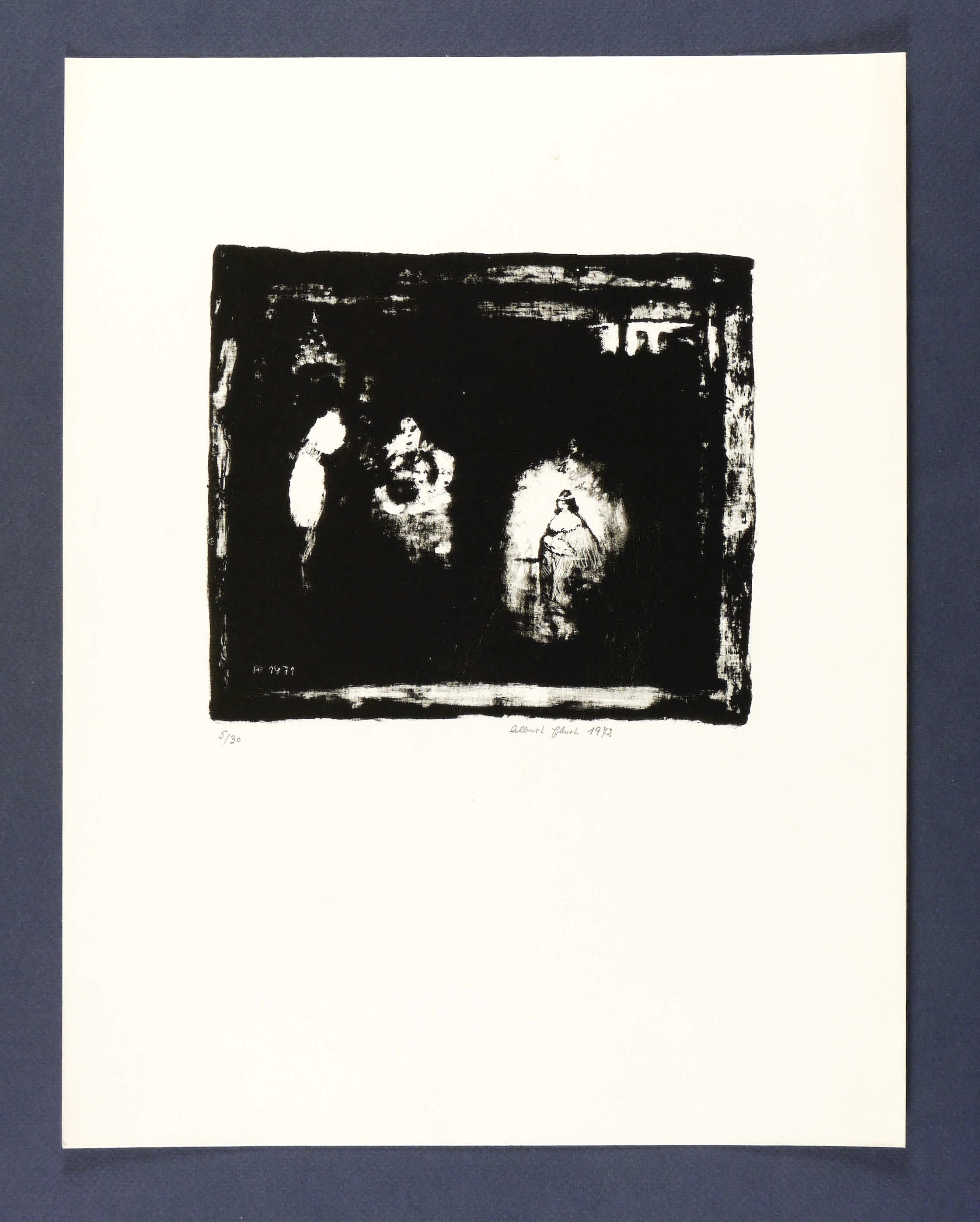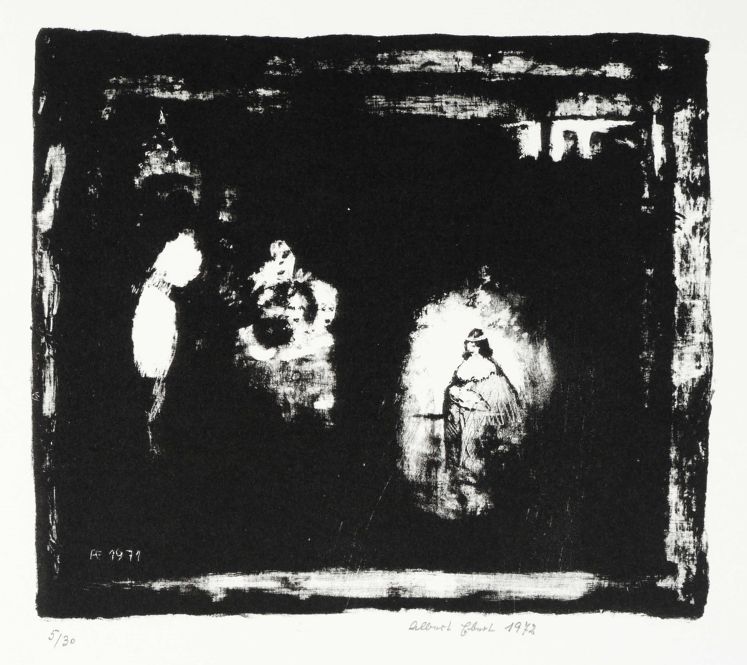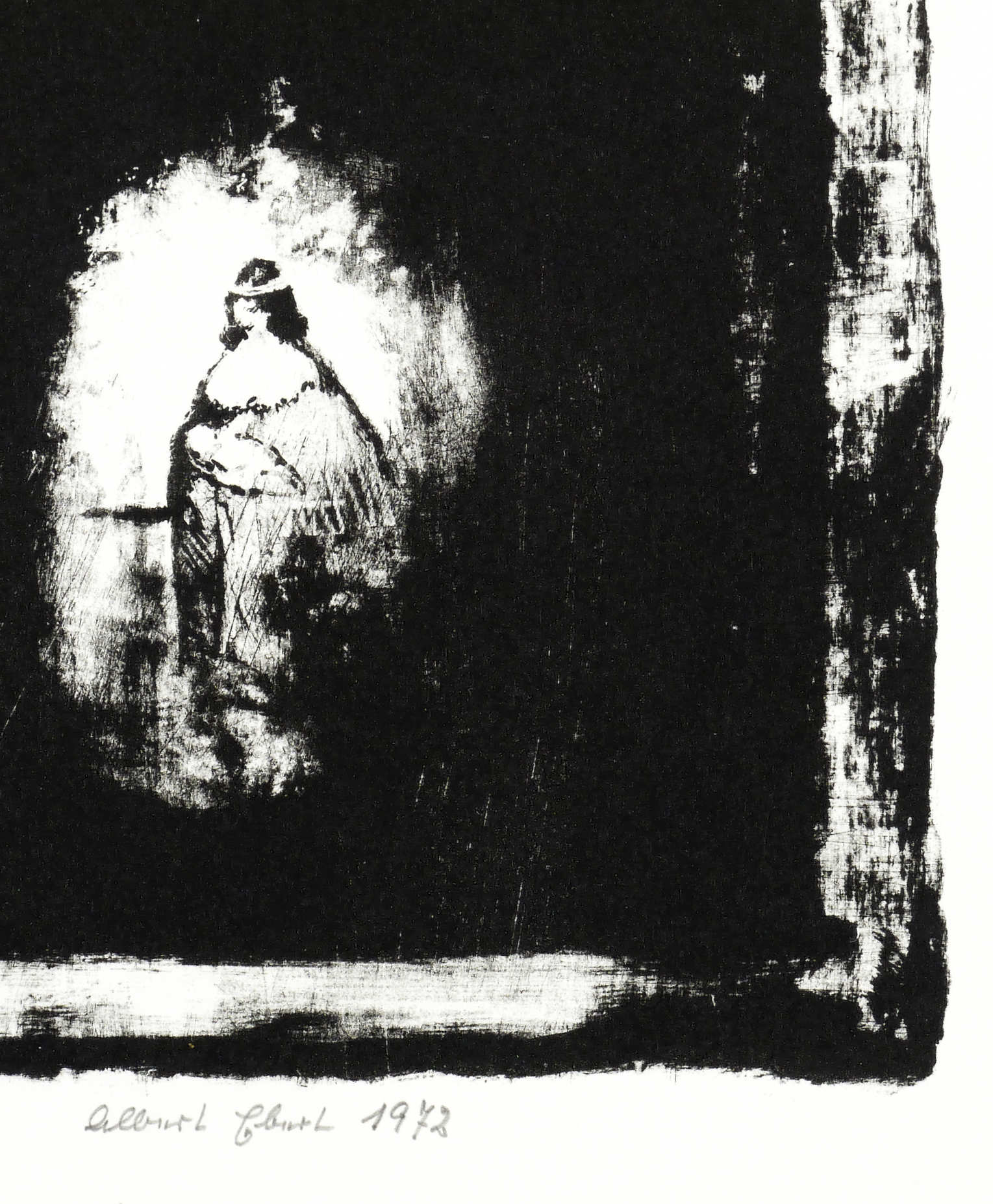1971. Lithografie / Pinsellithografie, partiell geschliffen & geschabt, in Schwarz, auf Karton. – Originale Künstlergrafik, von Albert Ebert. – Auflage Exemplar Nr. 5/30. – 15,3 x 17,5 cm (Darstellung / Druckbild), 35 x 27 cm (Blatt).