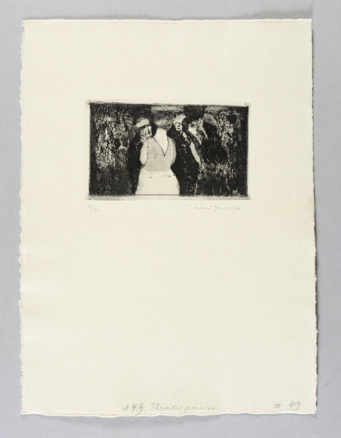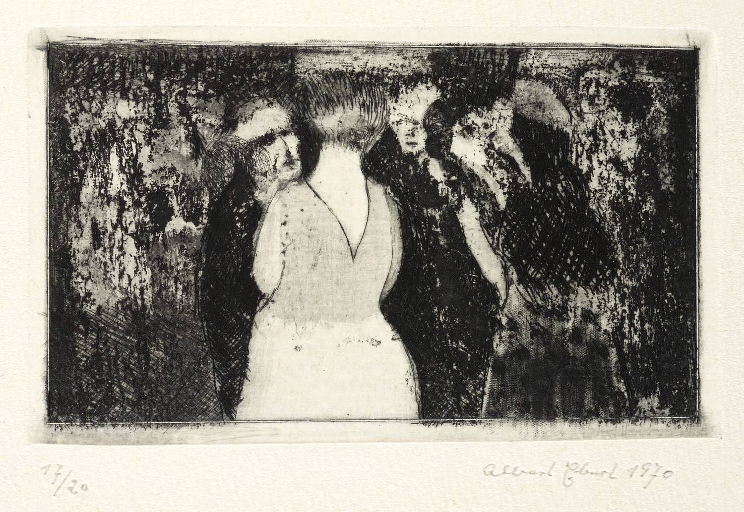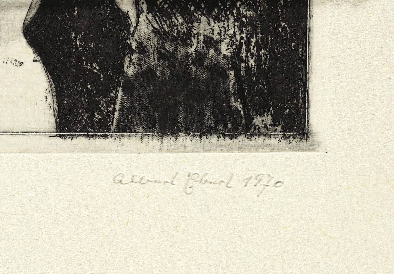 1970. Radierung / Reservage, Strichätzung & Roulette, partiell geschliffen, in Schwarz, auf schwerem gelbem Bütten. – Originale Künstlergrafik, von Albert Ebert. – Auflage Exemplar Nr. 17/20. – 6,9 x 11,2 cm (Darstellung / Platte), 27 x 20 cm (Blatt).