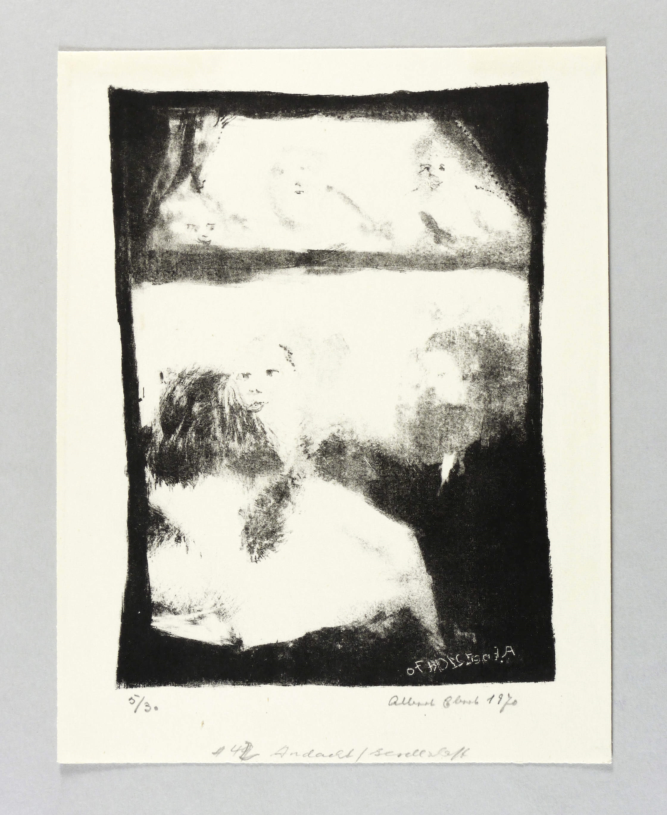 1970. Lithografie / Kreide- & Pinsellithografie, partiell gewischt & geschabt, in Schwarz, auf glattem Velin. – Originale Künstlergrafik, von Albert Ebert. – Auflage Exemplar Nr. 5/30. – 17,7 x 13,0 cm (Darstellung / Druckbild), 21 x 16 cm (Blatt).