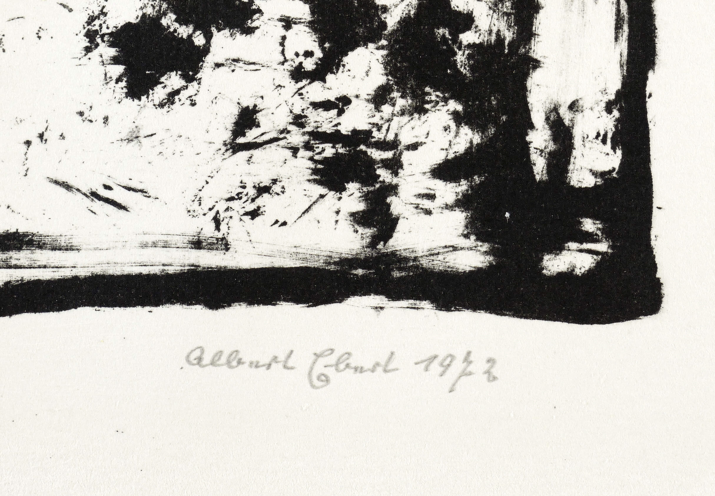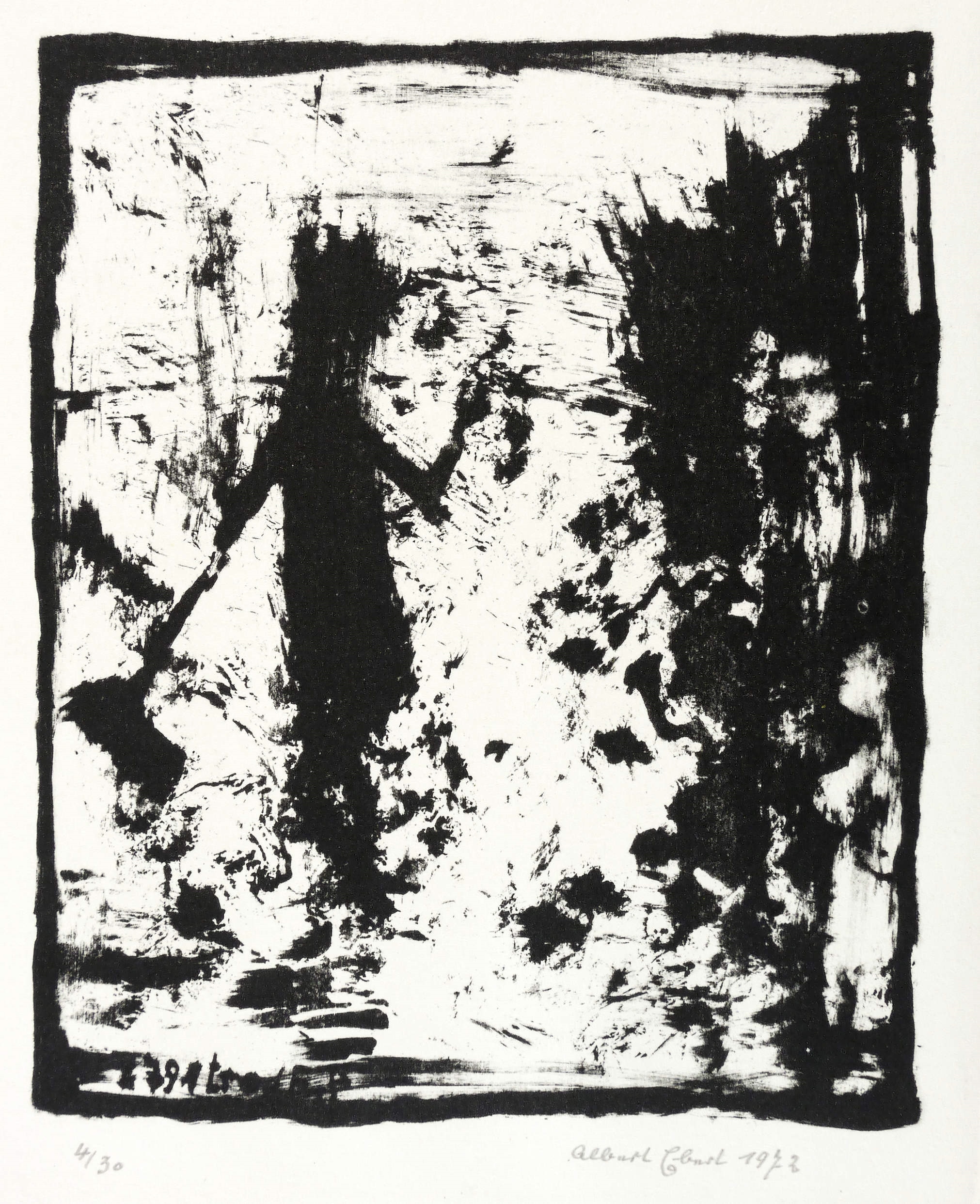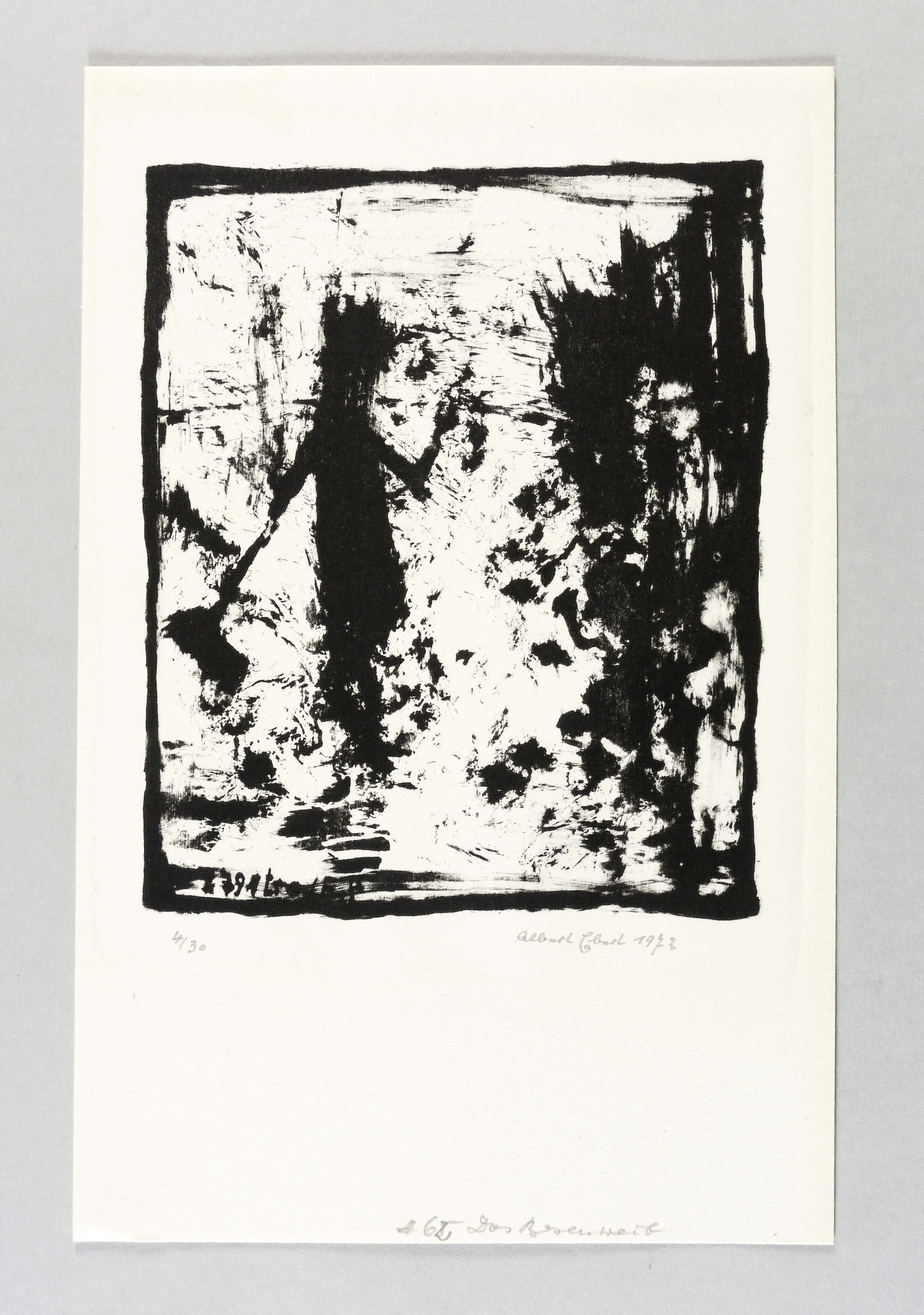1972. Lithografie / Pinsellithografie, partiell gewischt, in Schwarz, auf rauem Maschinenbütten. – Originale Künstlergrafik, von Albert Ebert. – Auflage Exemplar Nr. 4/30. – 16,5 x 13,5 cm (Darstellung / Druckbild), 26 x 17 cm (Blatt).