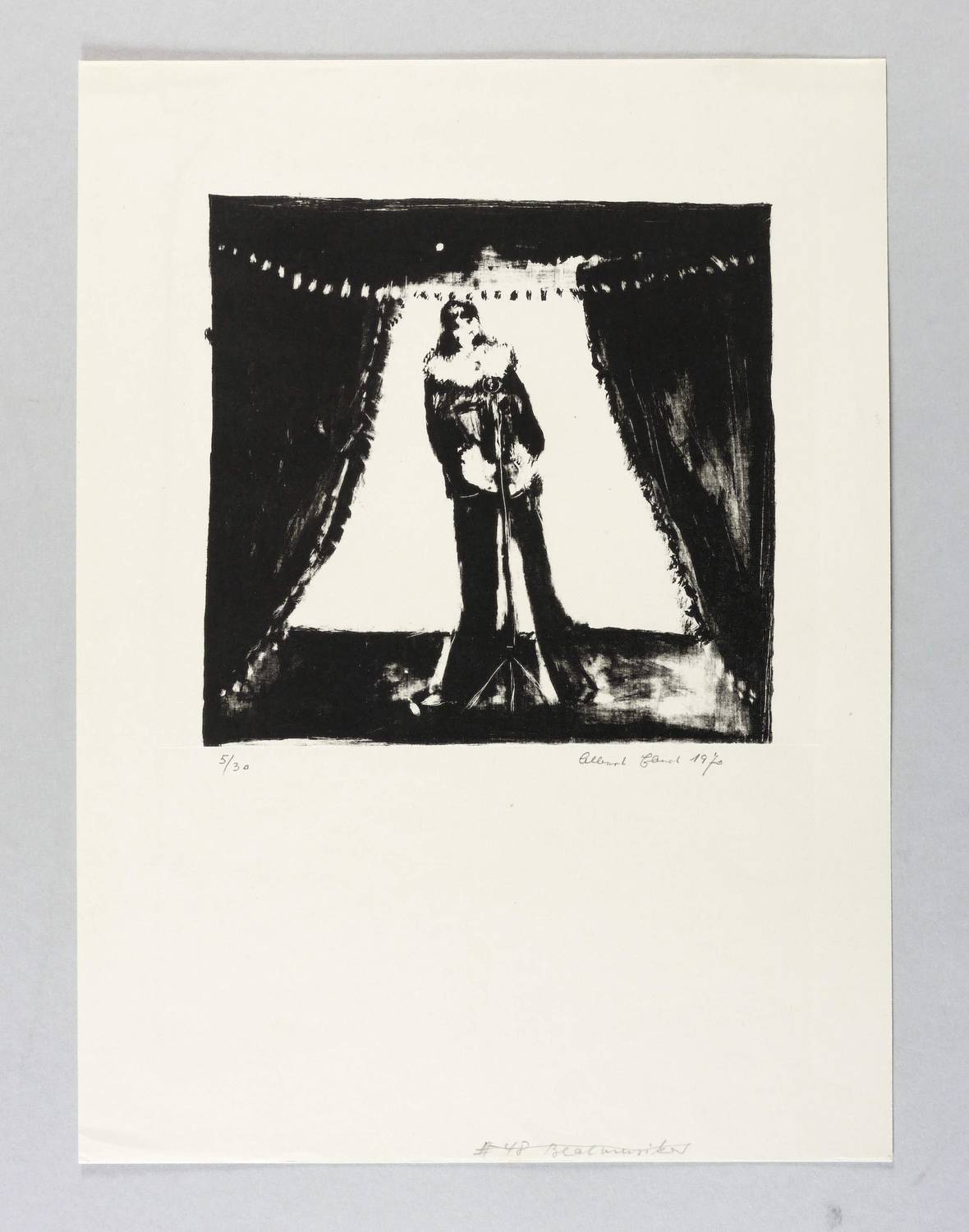 Brade-Stula L 55. – Rechts unten in Bleistift signiert und datiert: ″Albert Ebert 1970″. Links Auflagenbezeichnung. Am unteren Blattrand von fremder Hand Sammlungs-Nr. und etwas abweichender Titel: ″Beatmusiker″. – Provenienz: Sammlung Gottfried Müller (1921- 2013). 1974-2011 Inhaber der Evangelischen Buchhandlung und Antiquariat Max Müller in Chemnitz (Karl-Marx-Stadt). – Ohne Mängel. Sehr guter Zustand.