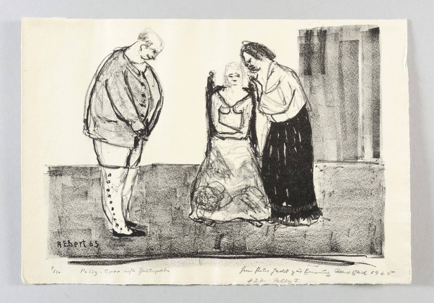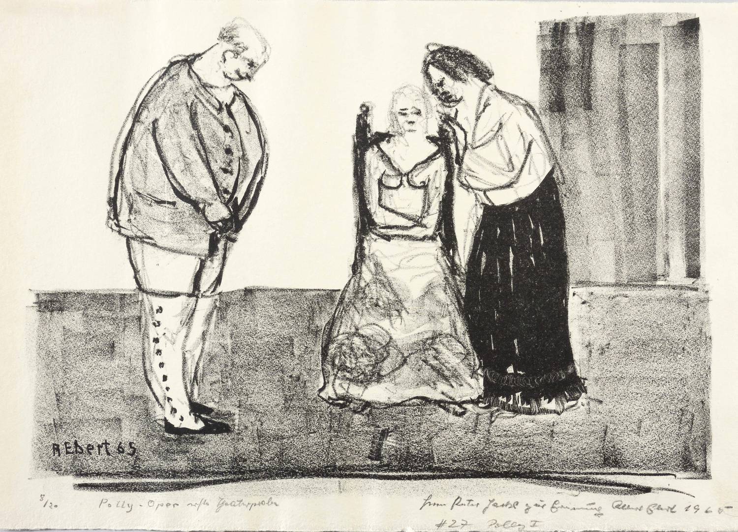 Brade-Stula L 5. – Rechts unten in Bleistift signiert und datiert: ″Albert Ebert 1965″. Links eigenhändige Auflagenbezeichnung. Daneben Titel: ″Polly-Oper erste Theaterprobe″. Weiter persönliche Widmung des Künstlers an Peter Jackl. Im Stein rechts unten signiert und datiert: ″A. Ebert 65″. Am unteren Blattrand von fremder Hand Sammlungs-Nr. sowie etwas abweichender Titel: ″Polly I″. – Zum Drama ″Polly oder Die Bataille am Bluewater Creek ″ von Peter Hacks. - Provenienz: Sammlung Gottfried Müller (1921- 2013). 1974-2011 Inhaber der Evangelischen Buchhandlung und Antiquariat Max Müller in Chemnitz (Karl-Marx-Stadt). – Tadellos erhalten. Sehr guter Zustand.