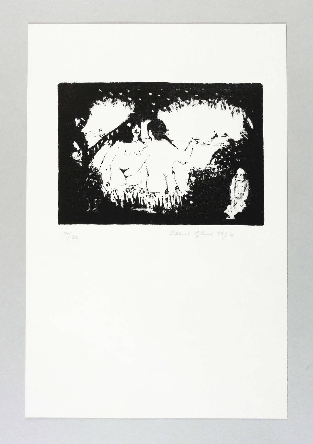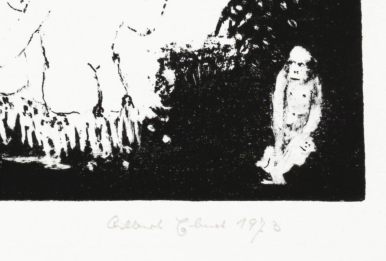 1973. Lithografie / Pinsellithografie, partiell gewischt & geschabt, in Schwarz, auf glattem Velinkarton. – Originale Künstlergrafik, von Albert Ebert. – Auflage Exemplar Nr. 11/30. – 11,3 x 16,2 cm (Darstellung / Druckbild), 31 x 21 cm (Blatt).