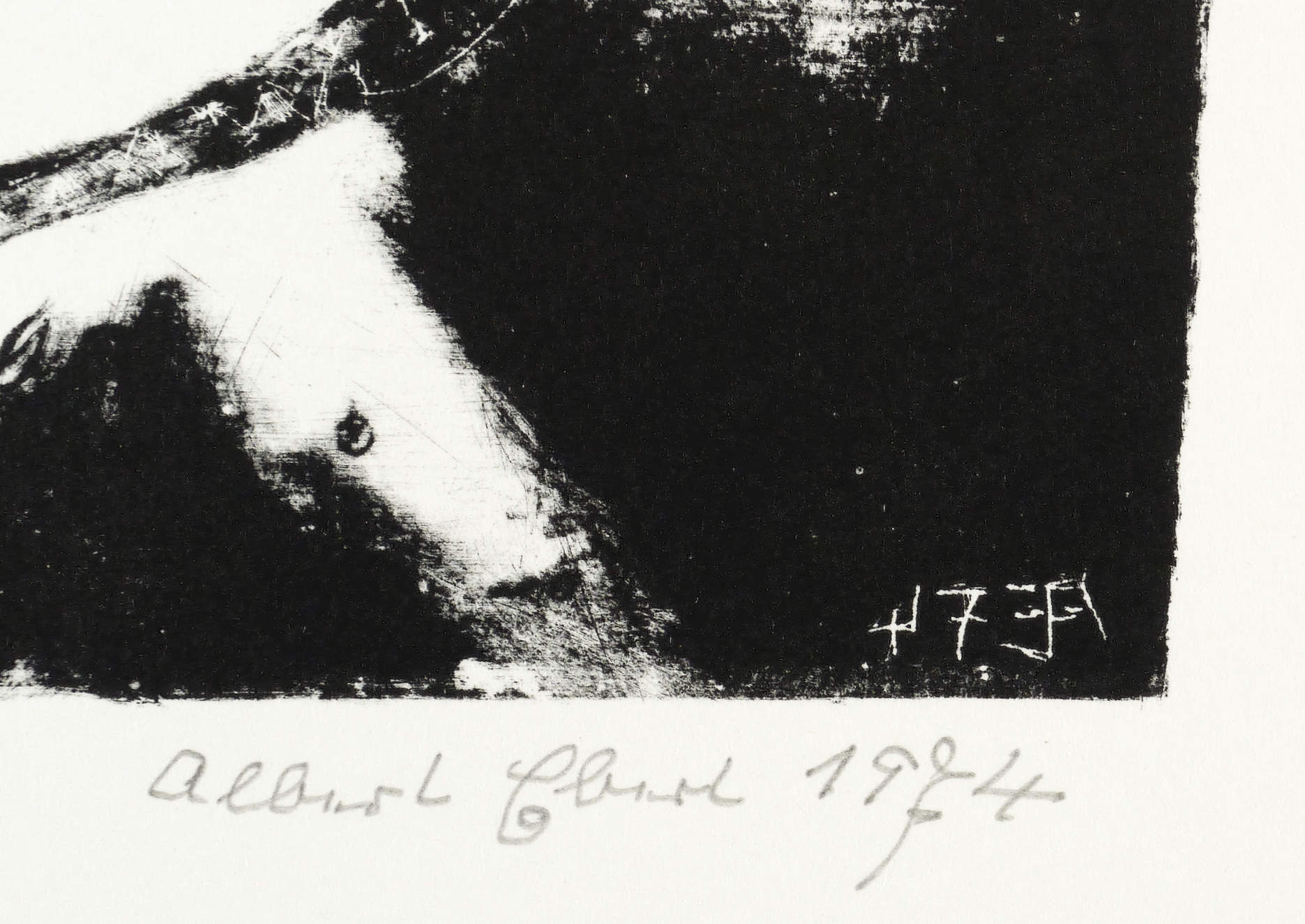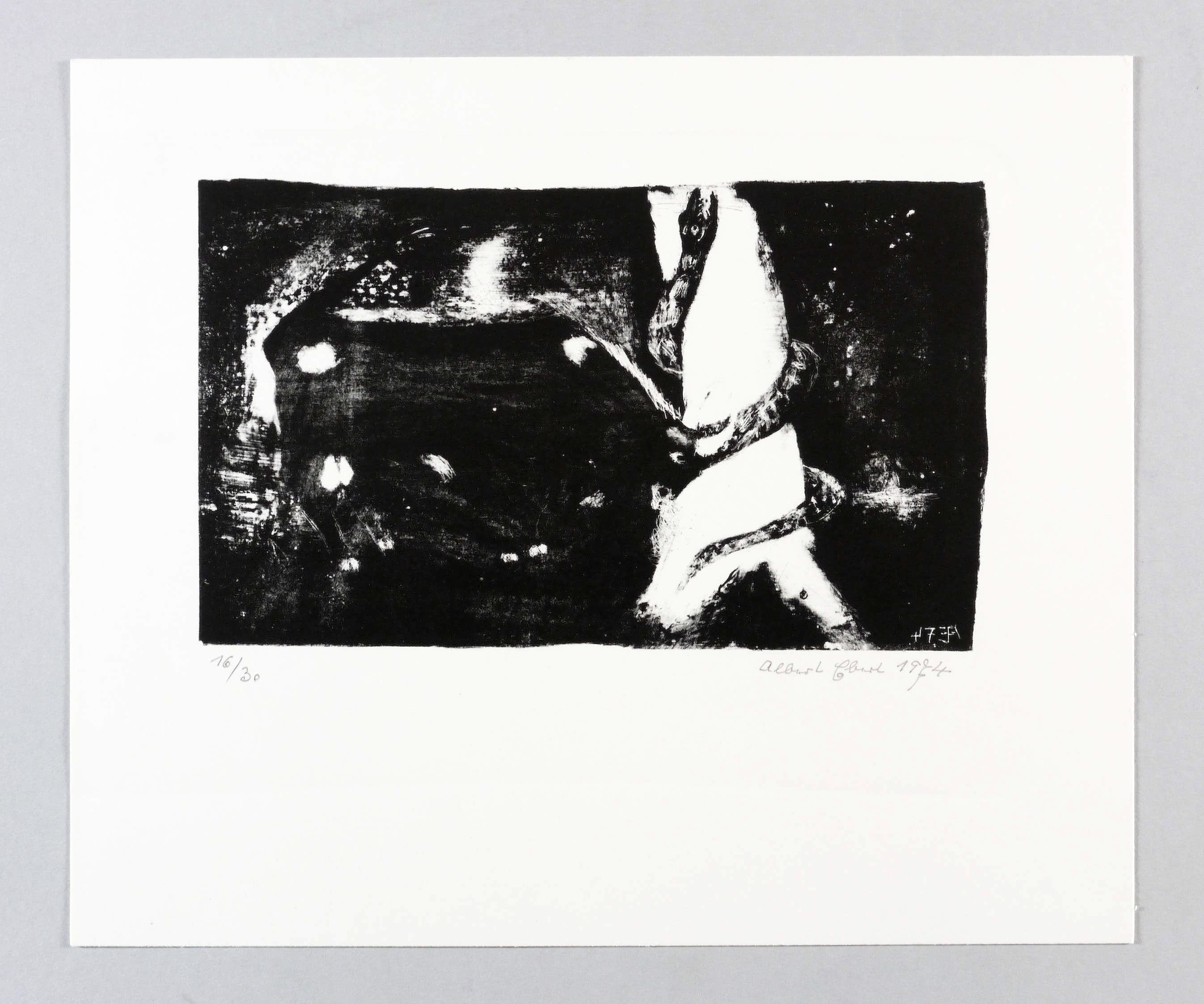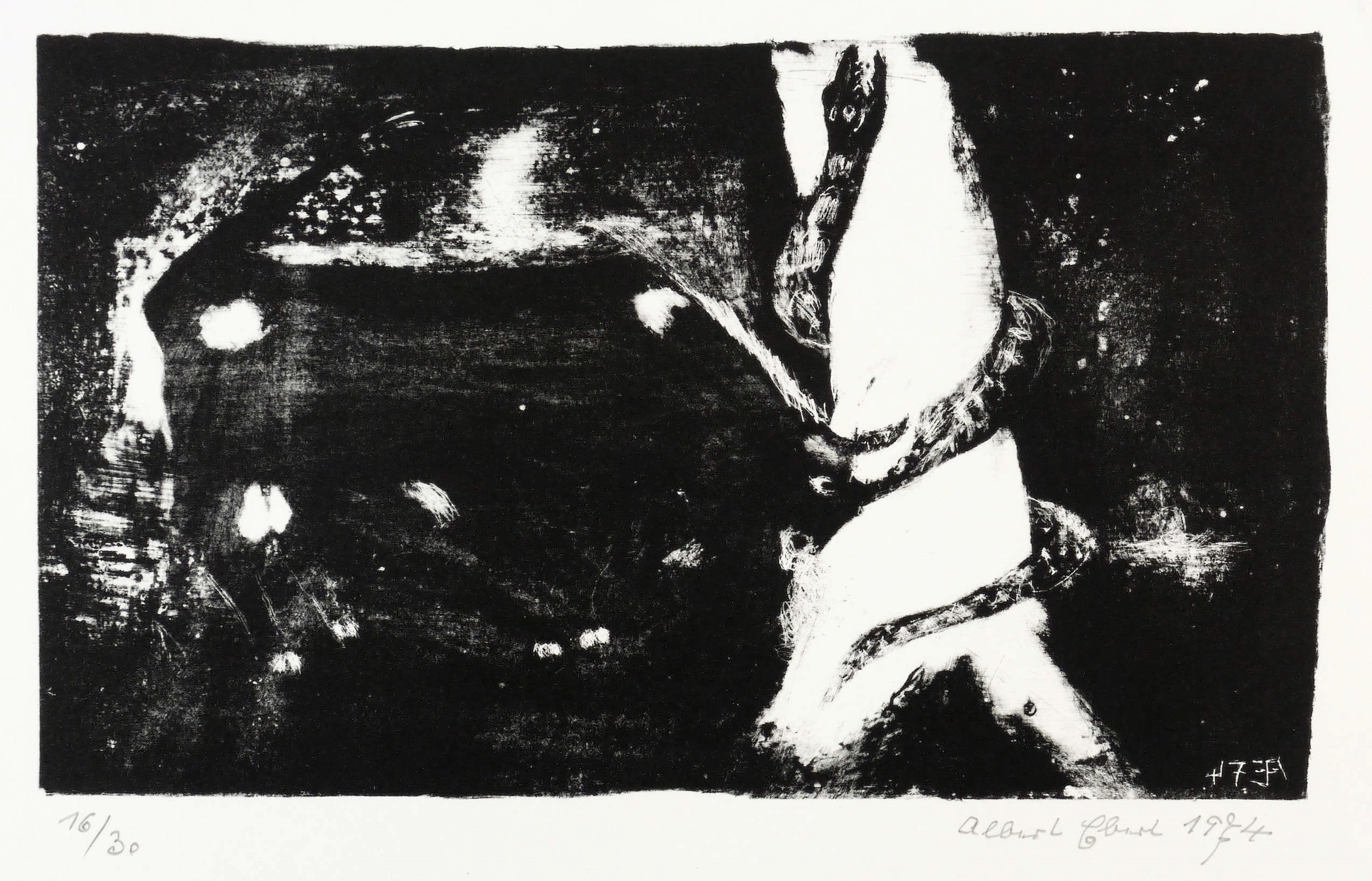 1974. Lithografie / Pinsellithografie, partiell gewischt & geschabt, in Schwarz, auf Velinkarton. – Originale Künstlergrafik, von Albert Ebert. – Auflage Exemplar Nr. 16/30. – 13,2 x 22,1 cm (Darstellung / Druckbild), 25 x 30 cm (Blatt).