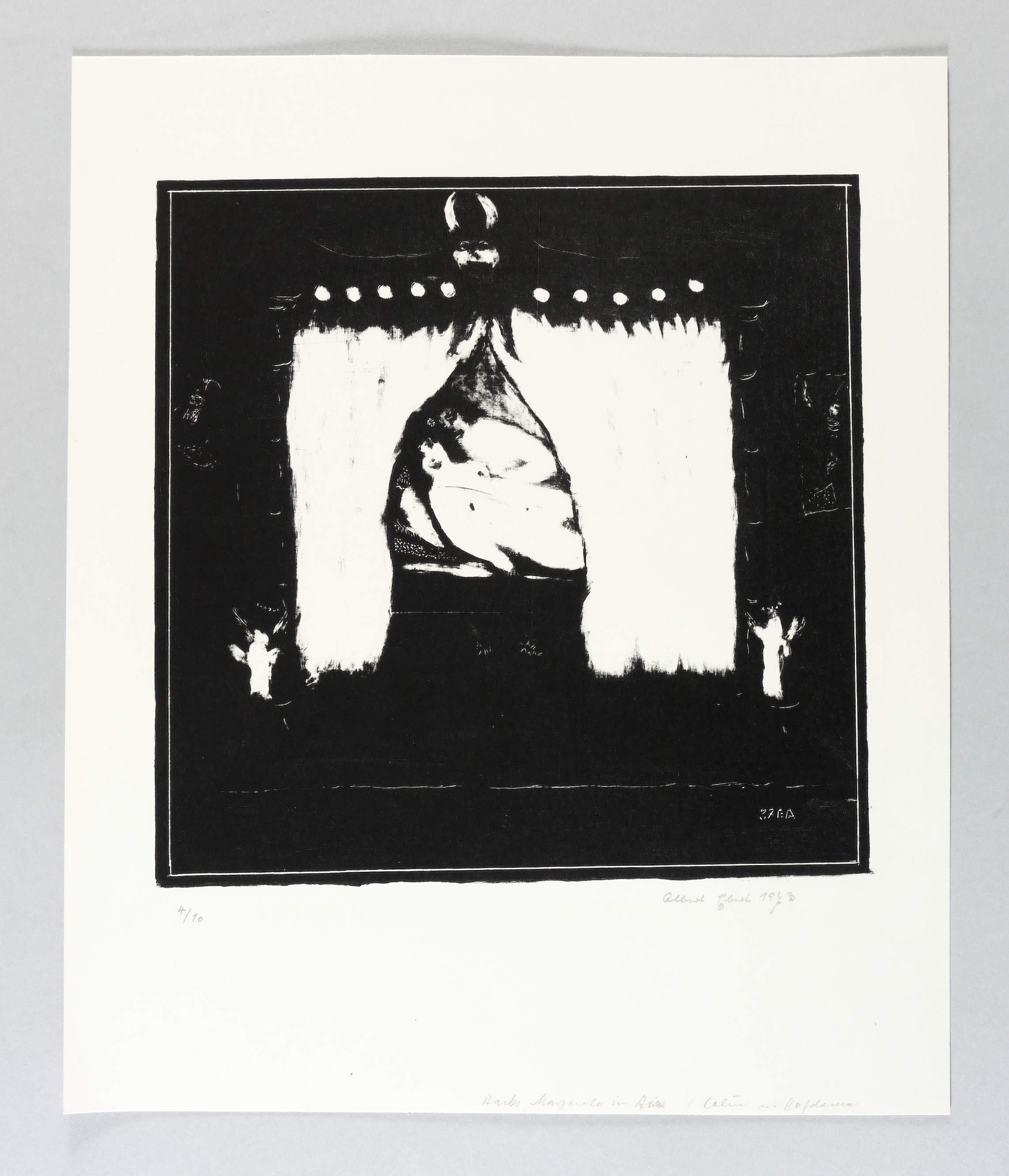 Brade-Stula L 84. – Rechts unten in Bleistift signiert und datiert: ″Albert Ebert 1973″. Links Auflagenbezeichnung. Im Stein rechts unten teilweise spiegelverkehrt Monogramm und Jahr: ″AE 73″. Am unteren Blattrand von fremder Hand Sammlungs-Nr. sowie etwas abweichender Titel: ″Hacks, Margarete in Aix (Colin u. Hofdame)″. – Zur Komödie ″Margarete in Aix″ von Peter Hacks. - Provenienz: Sammlung Gottfried Müller (1921-2013). 1974-2011 Inhaber der Evangelischen Buchhandlung und Antiquariat Max Müller in Chemnitz (Karl-Marx-Stadt). – Tadellos erhalten. Sehr guter Zustand.