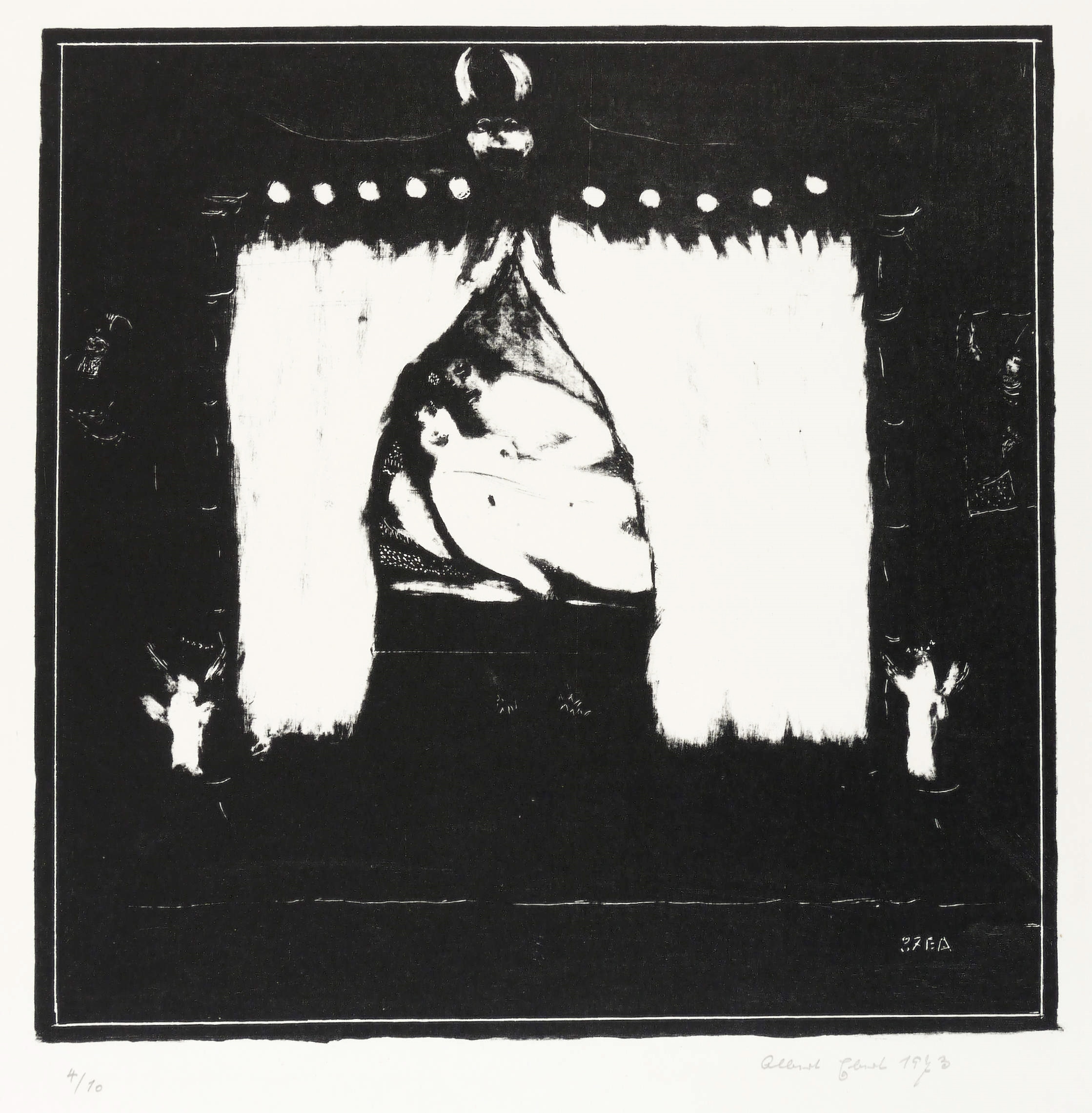 1973. Lithografie / Pinsellithografie, partiell geschabt, in Schwarz, auf Velinkarton. – Originale Künstlergrafik, von Albert Ebert. – Auflage Exemplar Nr. 4/10. – 24,9 x 25,0 cm (Darstellung / Druckbild), 37 x 31 cm (Blatt).