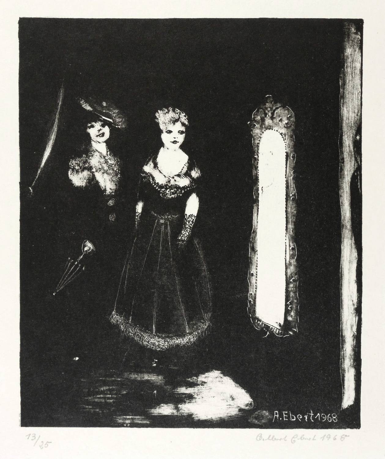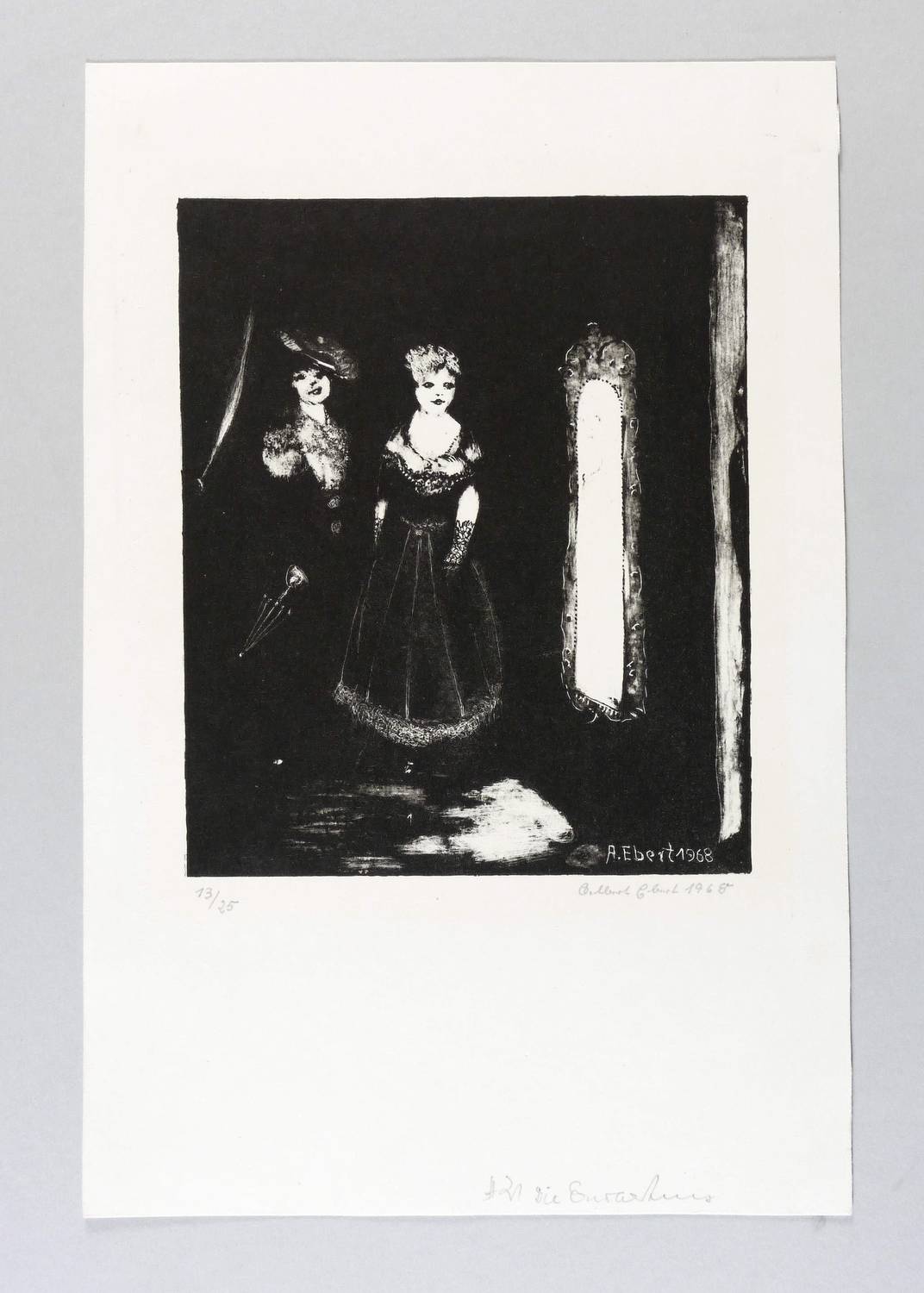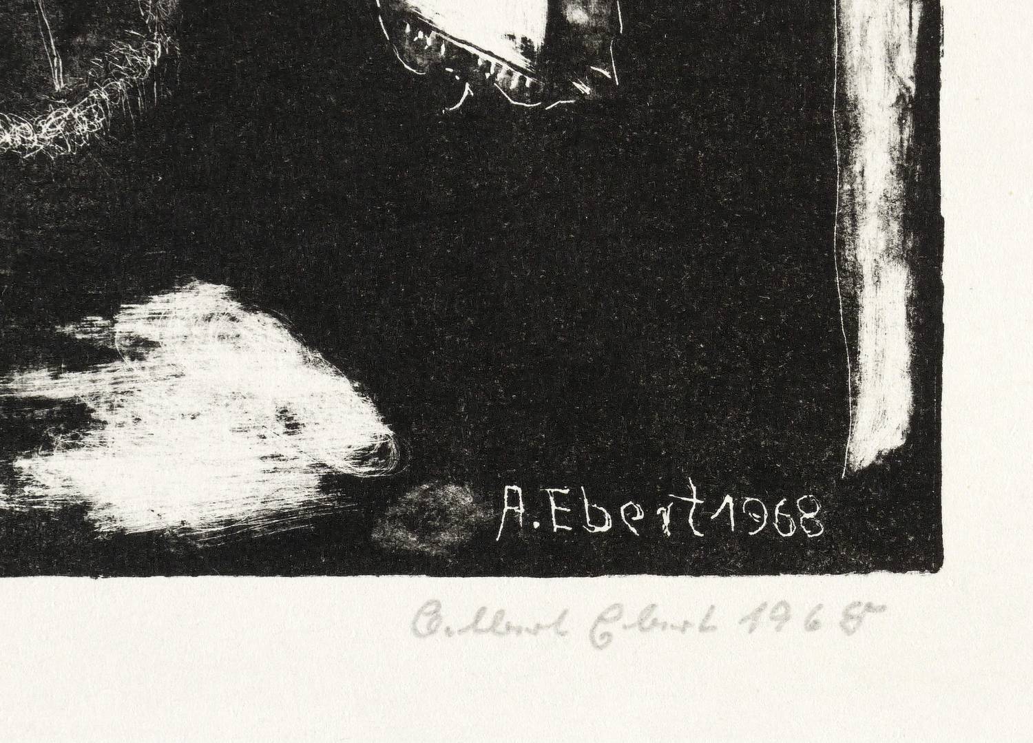 1968. Lithografie / Pinsellithografie, partiell gewischt & geschabt, in Schwarz, auf gelblichem Velin. – Originale Künstlergrafik, von Albert Ebert. – Auflage Exemplar Nr. 13/25. – 18,1 x 15,0 cm (Darstellung / Druckbild), 31 x 21 cm (Blatt).