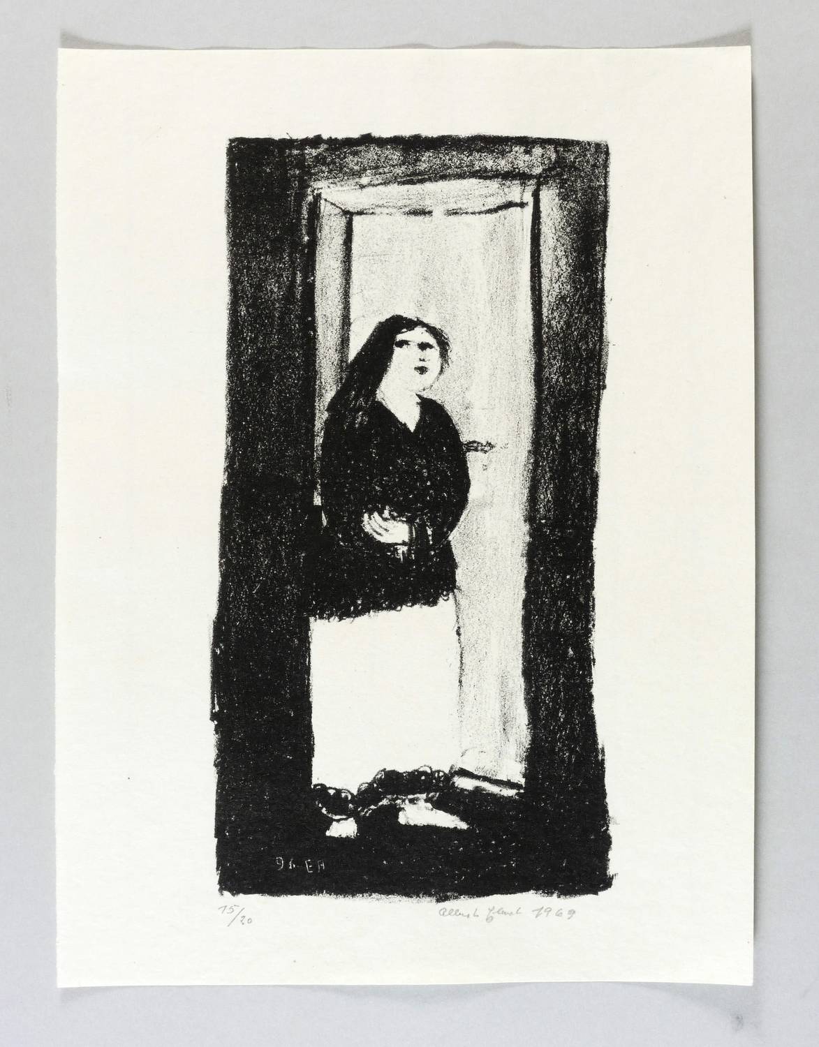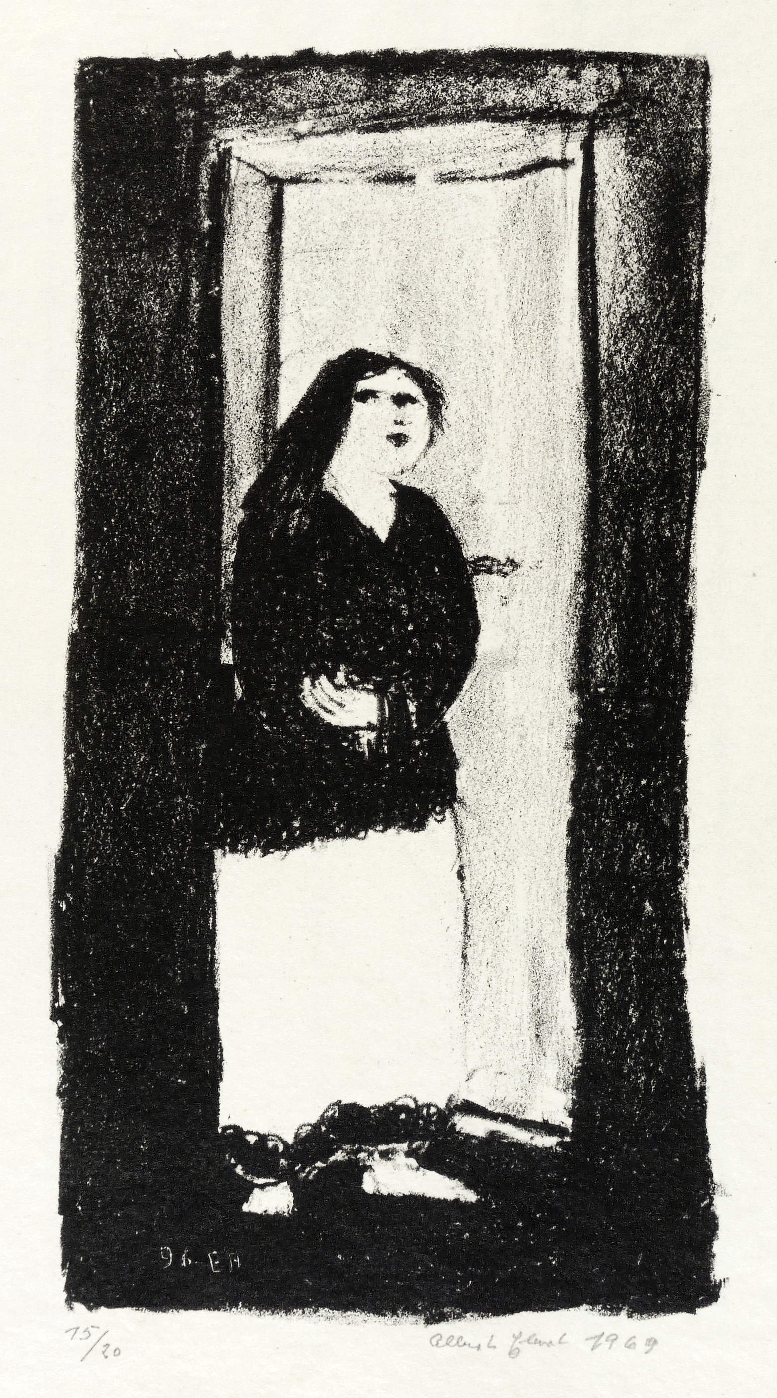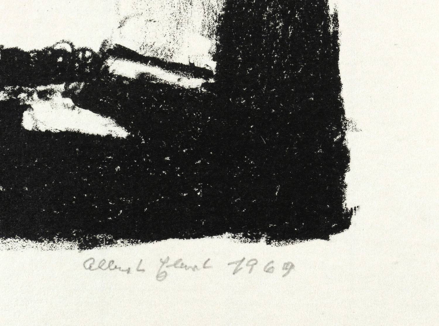 1969. Lithografie / Kreidelithografie, in Schwarz, auf glattem hellgelbem Maschinenbütten. – Originale Künstlergrafik, von Albert Ebert. – Auflage Exemplar Nr. 15/20. – 23,8 x 12,7 cm (Darstellung / Druckbild), 29 x 22 cm (Blatt).