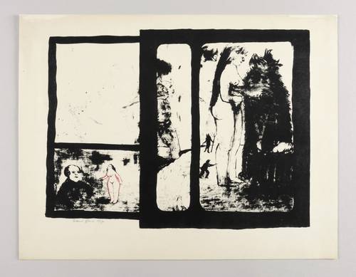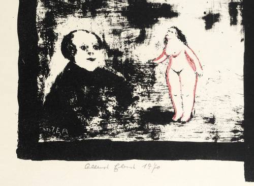 Brade-Stula L 53. – Links unten in Bleistift signiert und datiert: ″Albert Ebert 1970″. – Mehrteiliges Blatt auf einem Stein. Die Kontur des kleinen Aktes in rotem Wachsstift koloriert. – Papier in den äußeren Rändern leicht gegilbt. Sonst tadellos erhalten. Sehr guter Zustand.