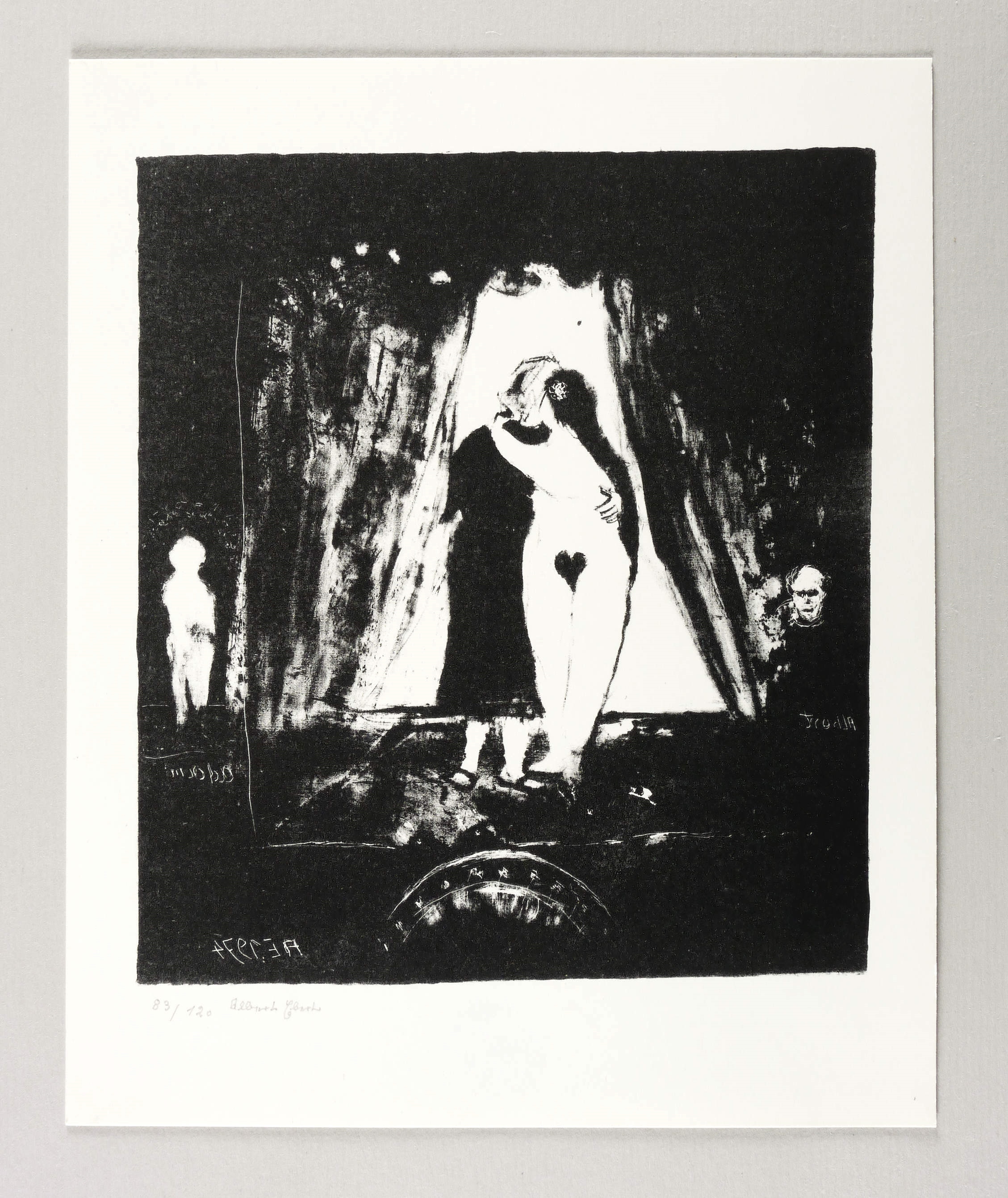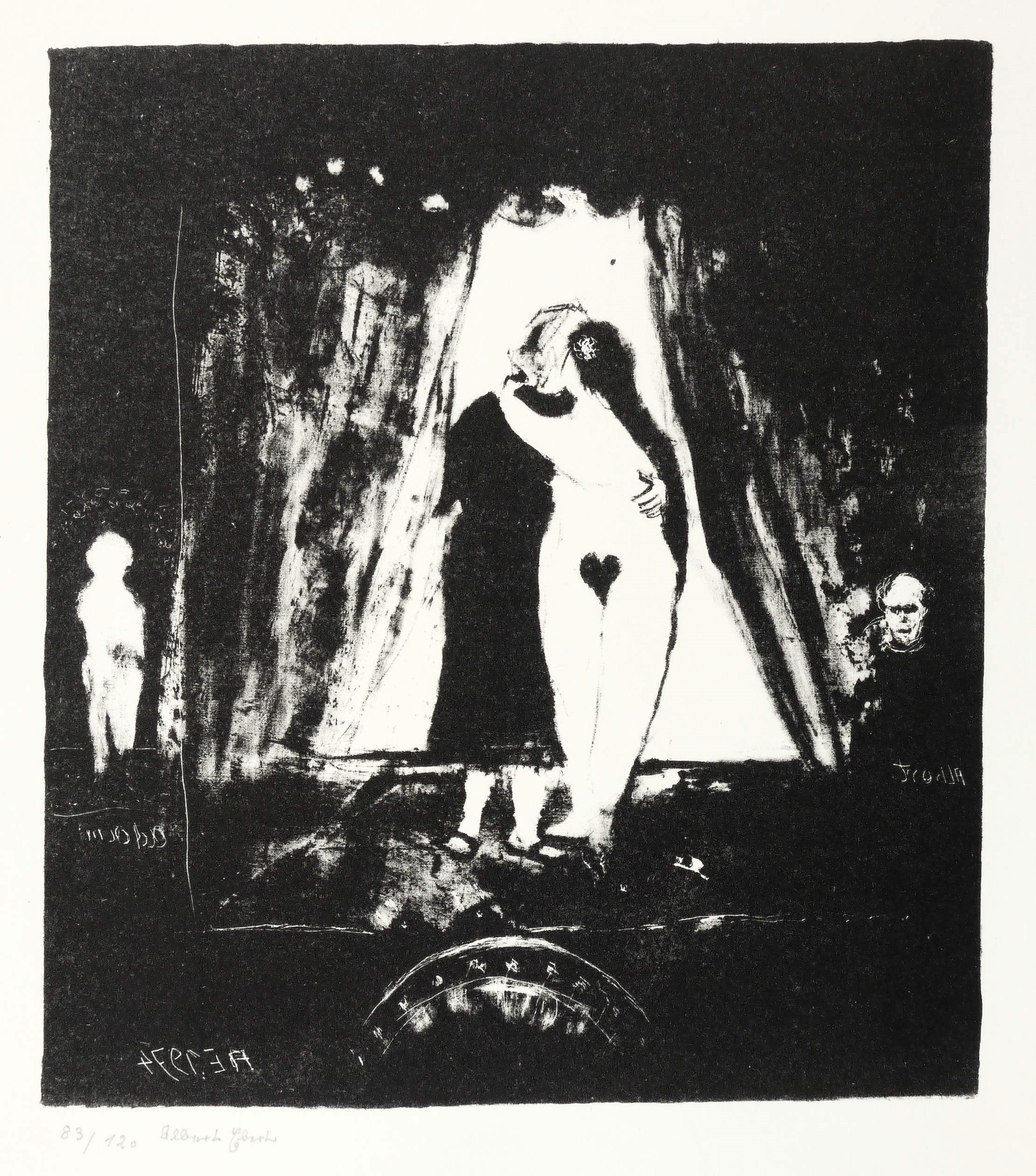 Brade-Stula L 99. – Links unten in Bleistift signiert: ″Albert Ebert″. Dazu Auflagenbezeichnung: ″83/120″. Im Stein spiegelverkehrt bezeichnet: ″Adam / Albert / E.A. 1974″. – Zu ″Adam und Eva″ von Peter Hacks. – Tadellos erhalten. Exzellenter Zustand.