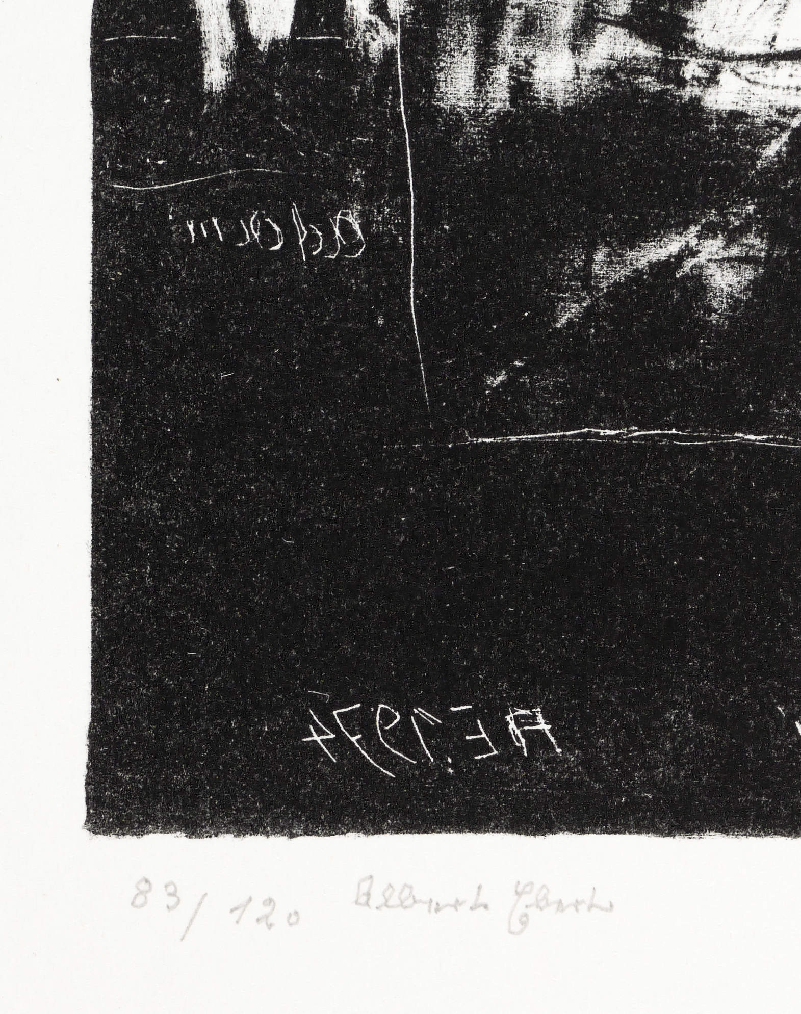 1974. Lithografie / Pinsellithografie, partiell geschabt, in Schwarz, auf hellem glattem Karton. – Originale Künstlergrafik, von Albert Ebert. – Auflage Exemplar Nr. 83/120. – 18,3 x 16,2 cm (Darstellung / Druckbild), 24 x 19 cm (Blatt).