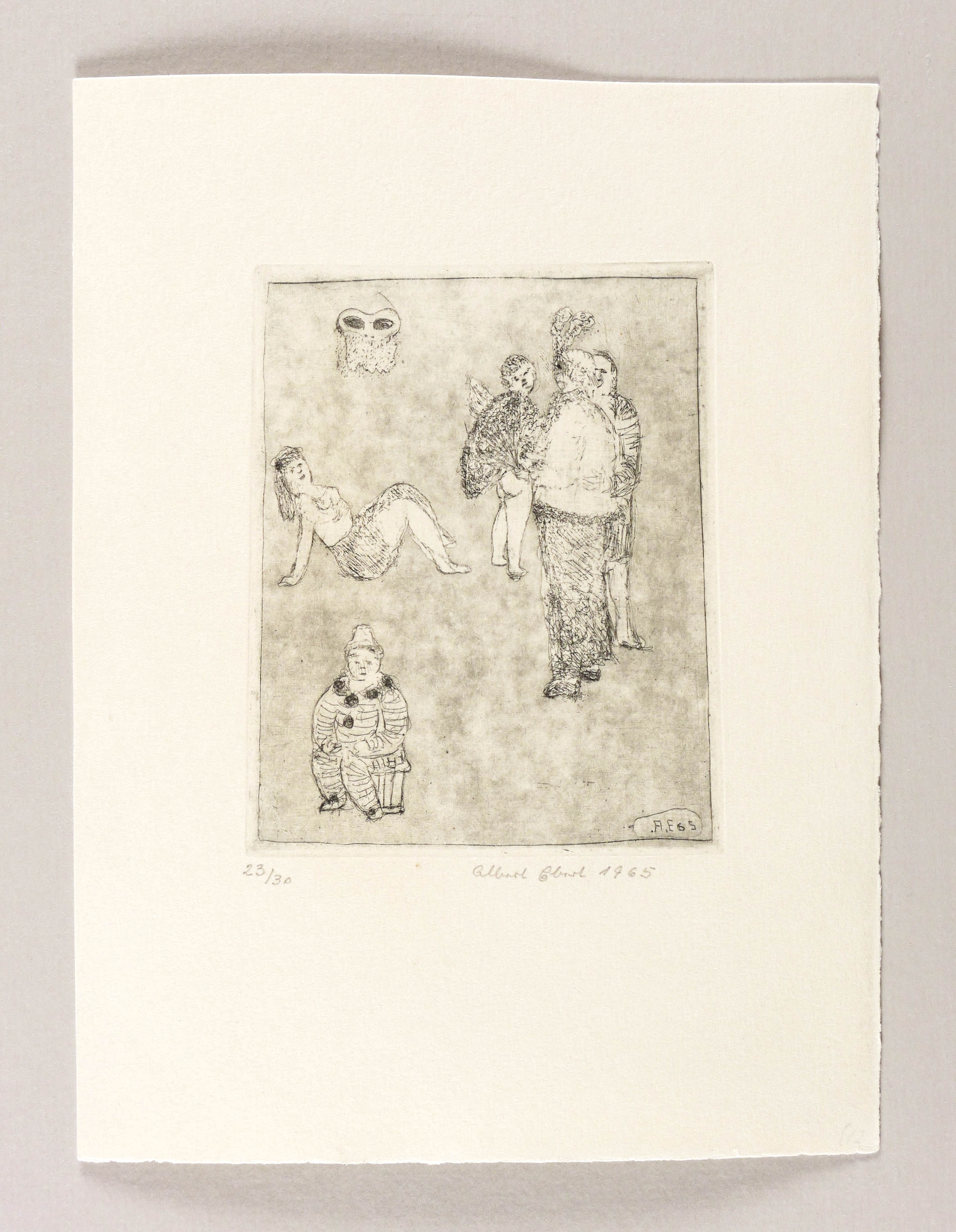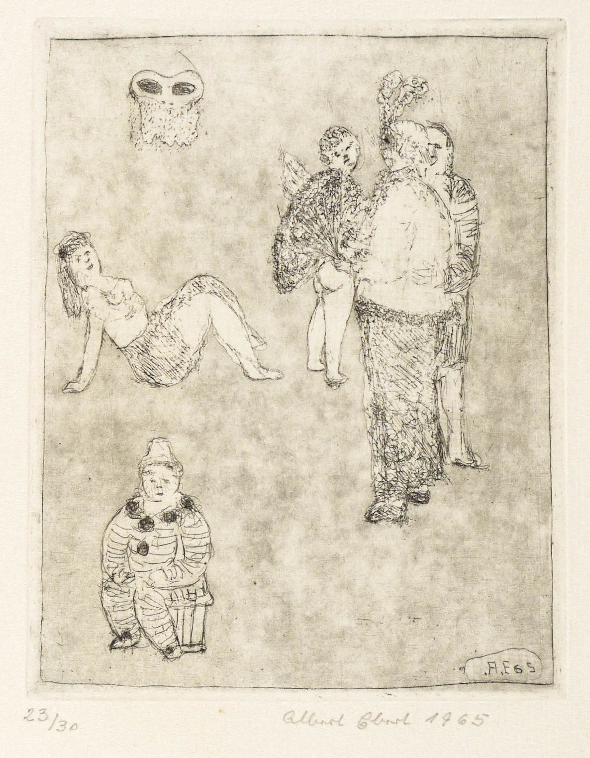 1965. Radierung / Kaltnadel, in Schwarz, mit Plattenton, auf festem gelblichem Velin. – Originale Künstlergrafik, von Albert Ebert. – Auflage Exemplar Nr. 23/30. – 12,8 x 10,2 cm (Darstellung / Einfassungslinie), 13,4 x 10,8 cm (Platte), 25 x 19 cm (Blatt).