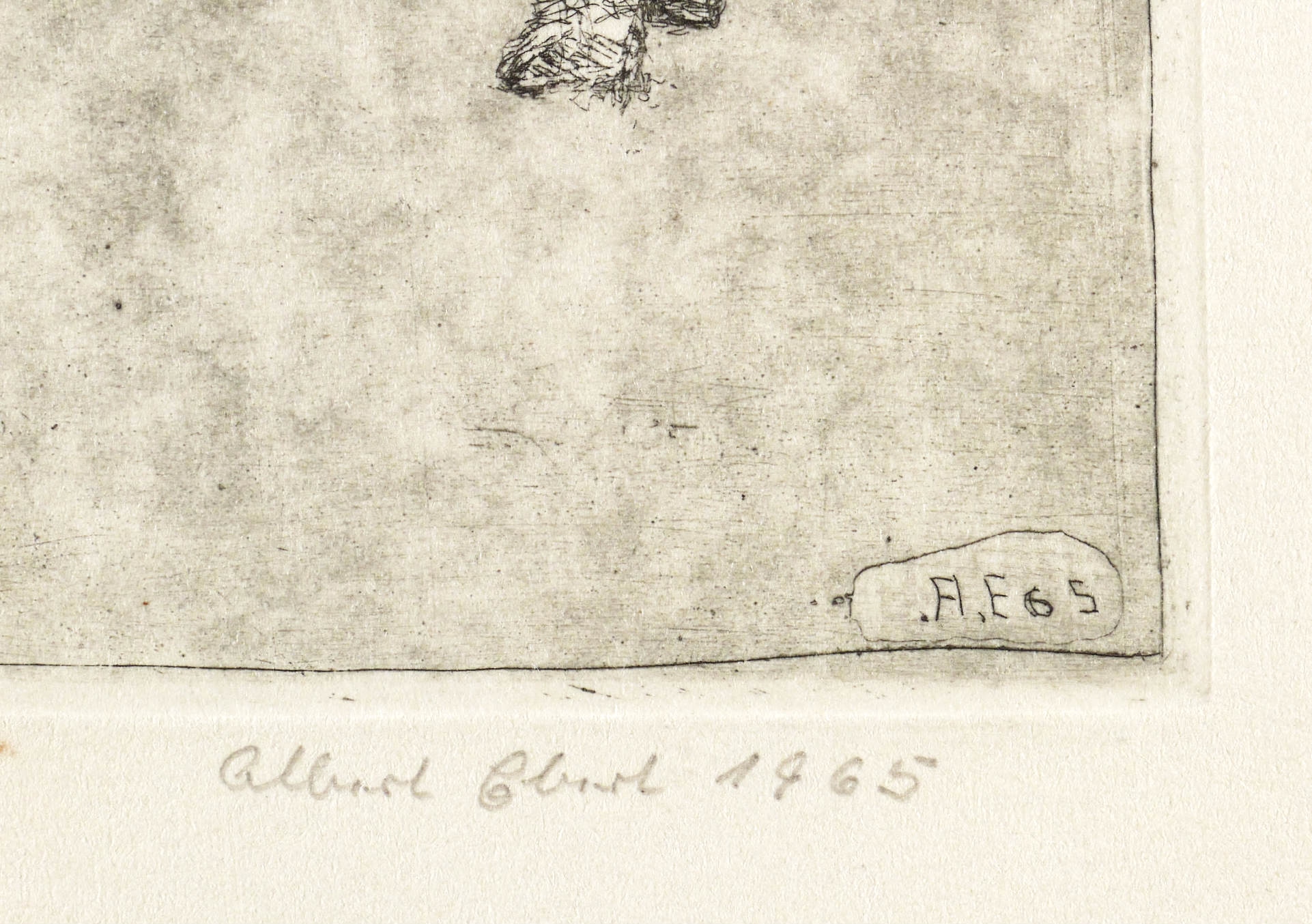 Brade-Stula R 43. – Rechts unten in Bleistift signiert und datiert: ″Albert Ebert 1965″. Links Auflagenbezeichnung. In der Platte rechts unten nochmals Signatur und Jahr: ″A.E. 65″. – Ein besonderes seltenes Blatt des Künstlers. – Originalrandiges unbeschnittenes Exemplar. Ohne Mängel. Sehr guter Zustand.
