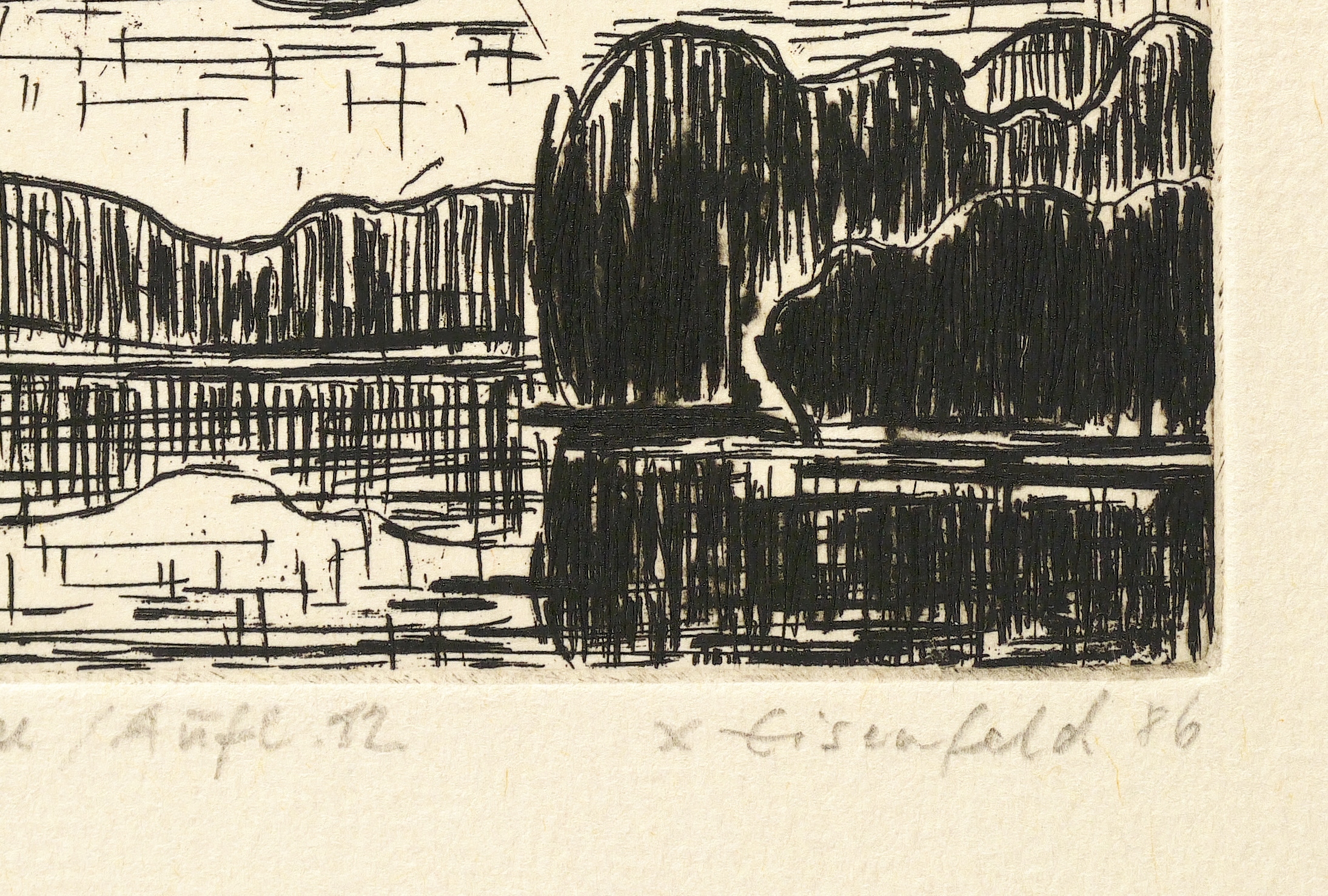 1986. Radierung / Strichätzung & Kaltnadel, in Schwarz, auf gelblichem Büttenpapier. – Originale Künstlergrafik, von Ulrich Eisenfeld. – Auflage 12 Exemplare. – 6,8 x 9,7 cm (Darstellung / Platte), 39,5 x 26,5 cm (Blatt).