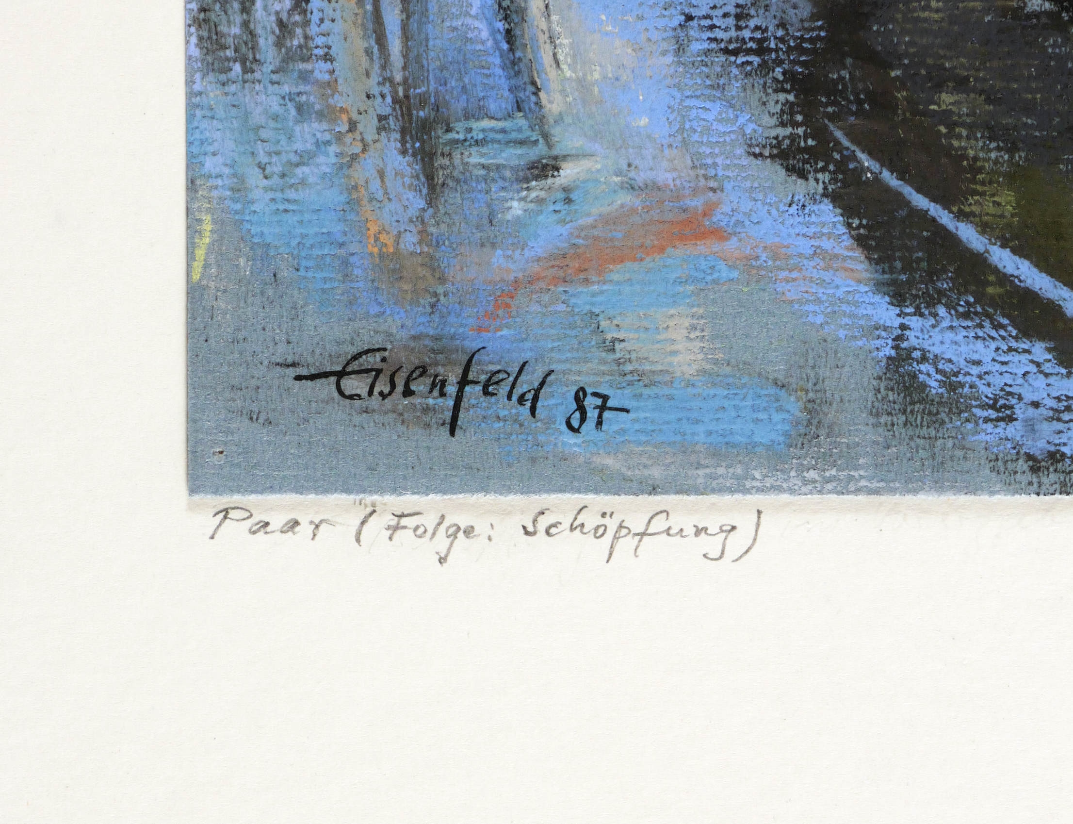 1987. Pastellkreide, über schwarzer Kreide, auf blaugrauem Karton. – Originale Künstlergrafik, von Ulrich Eisenfeld. – Unikat. – 33,6 x 50,0 cm (Darstellung / Blatt), 50 x 70 cm (Trägerkarton).