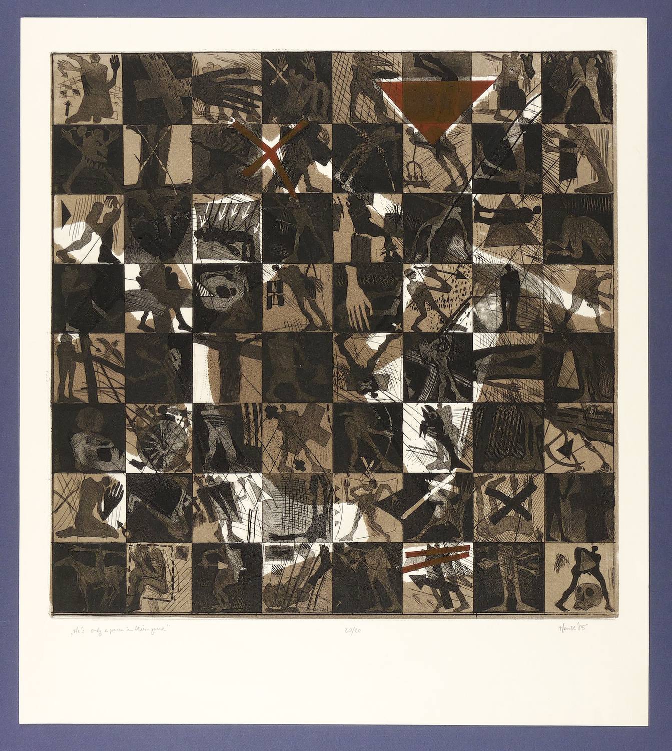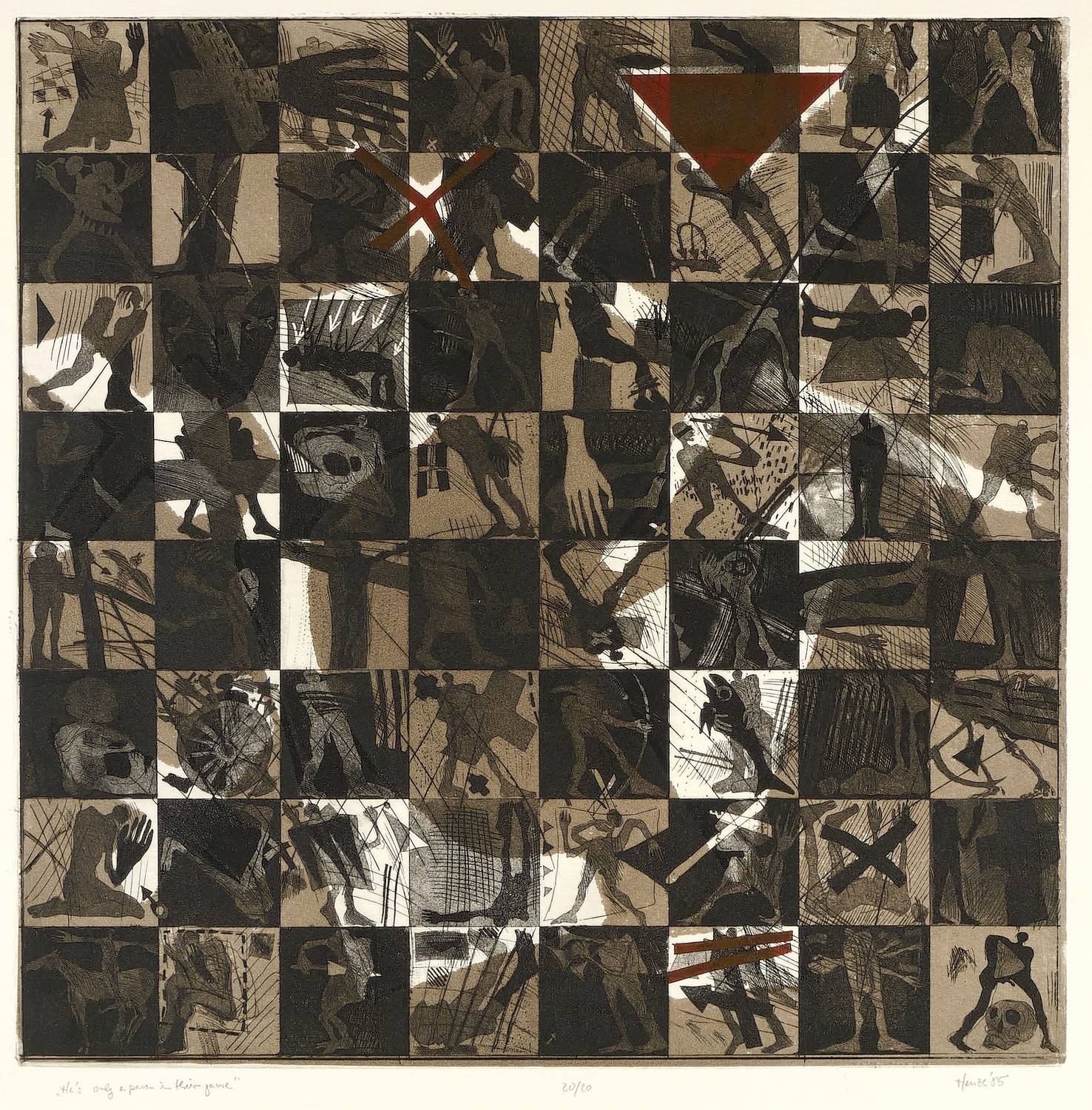 1985. Farbradierung / Farbaquatinta, mit Schablonendruck, auf weißem Büttenkarton. – Originale Künstlergrafik, von Rainer Henze. – Auflage Exemplar Nr. 20/20. – 50,1 x 50,0 cm (Darstellung / Platte), 62 x 55 cm (Blatt).