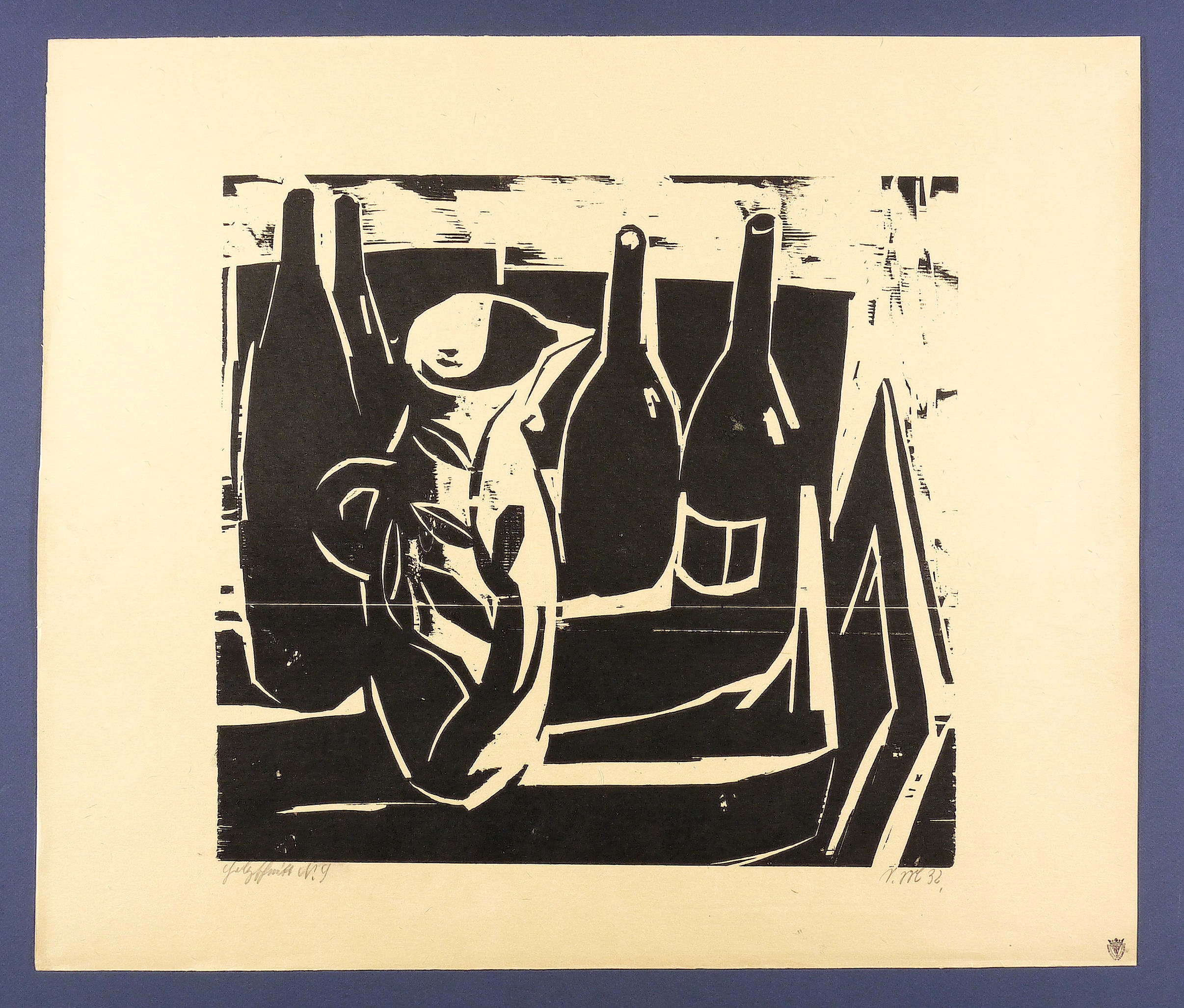 Rechts unten in Bleistift signiert: ″S.M. 32.″ Links eigenhändig bezeichnet: ″Holzschnitt N. 9″. In der rechten unteren Ecke Sammlerstempel Hanns Conon v.d. Gabelentz mit Wappen. – Der Mäzen und spätere Sammlungsdirektor des Lindenau-Museums in Altenburg Hanns Conon v.d. Gabelentz (1892-1977) ist bekannt für sein Förderung von Holzschnitt-Künstlern wie Conrad Felixmüller und Frans Masereel. – Papier altersbedingt etwas gedunkelt. Im Rand leichte Lagerspuren. Insgesamt gut erhalten.