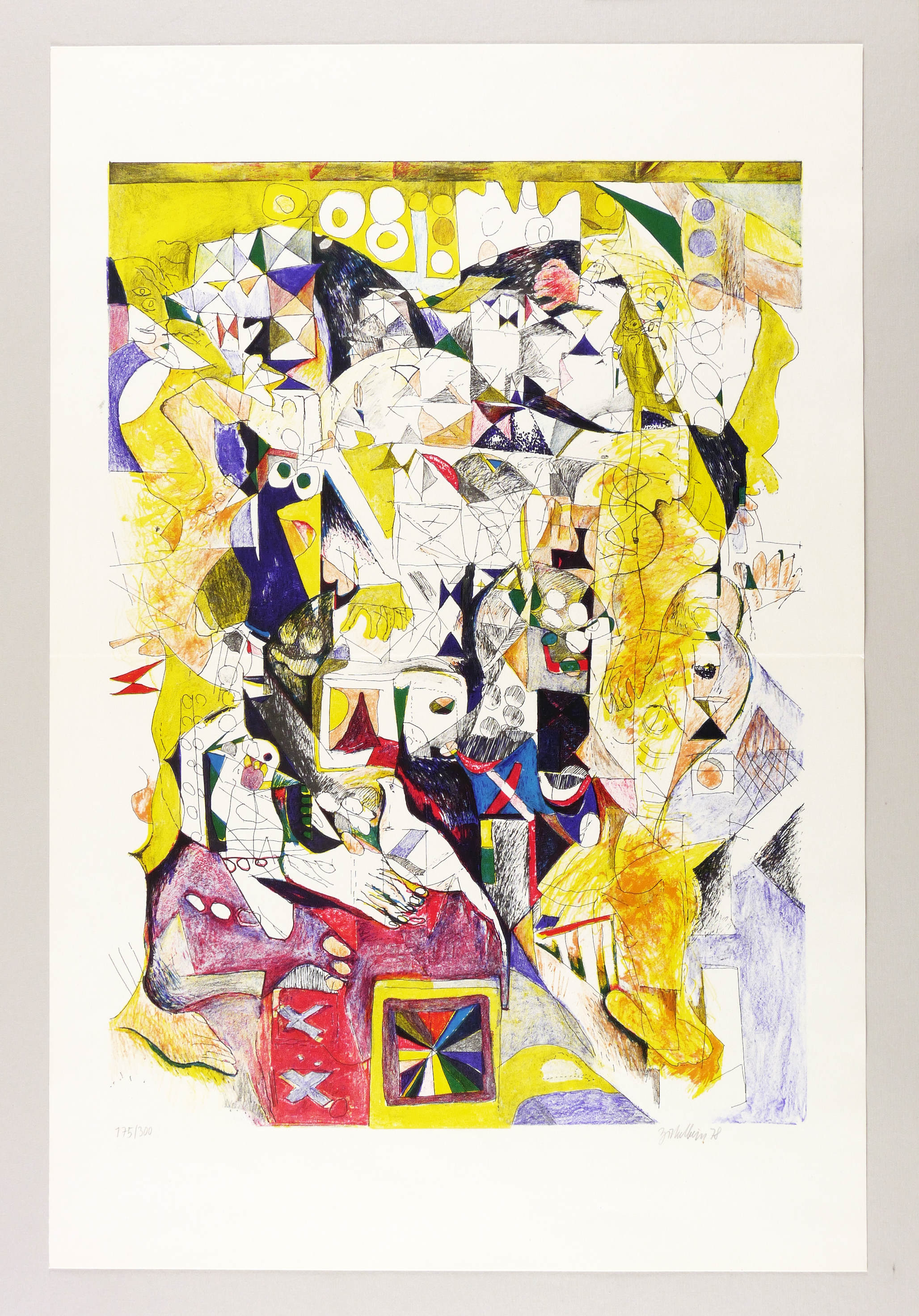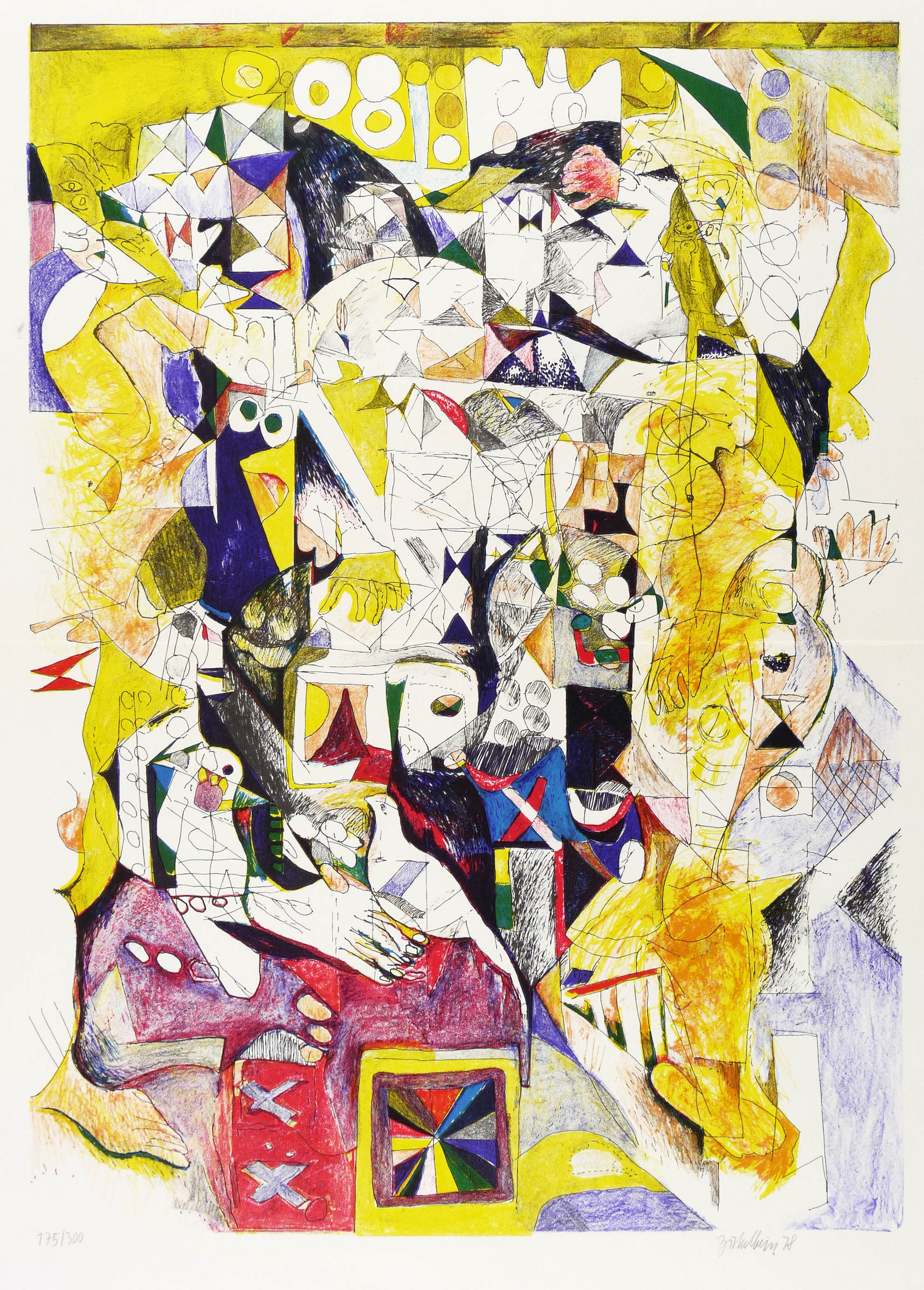 1978. Farbzinkografie / Kreide- & Pinselzinkografie, in 6 Farben, auf glattem weißem Karton. – Originale Künstlergrafik, von Horst Zickelbein. – Auflage Exemplar Nr. 175/300. – 56,7 x 40,5 cm (Darstellung / Druckbild), 72 x 48 cm (Blatt).