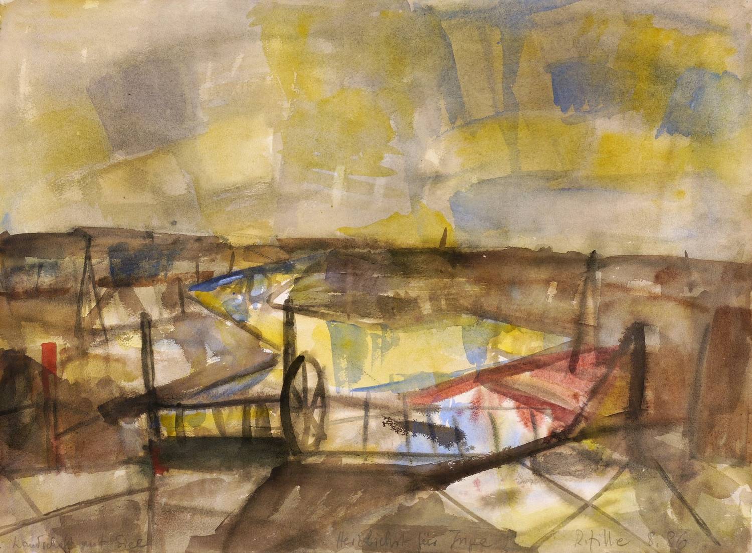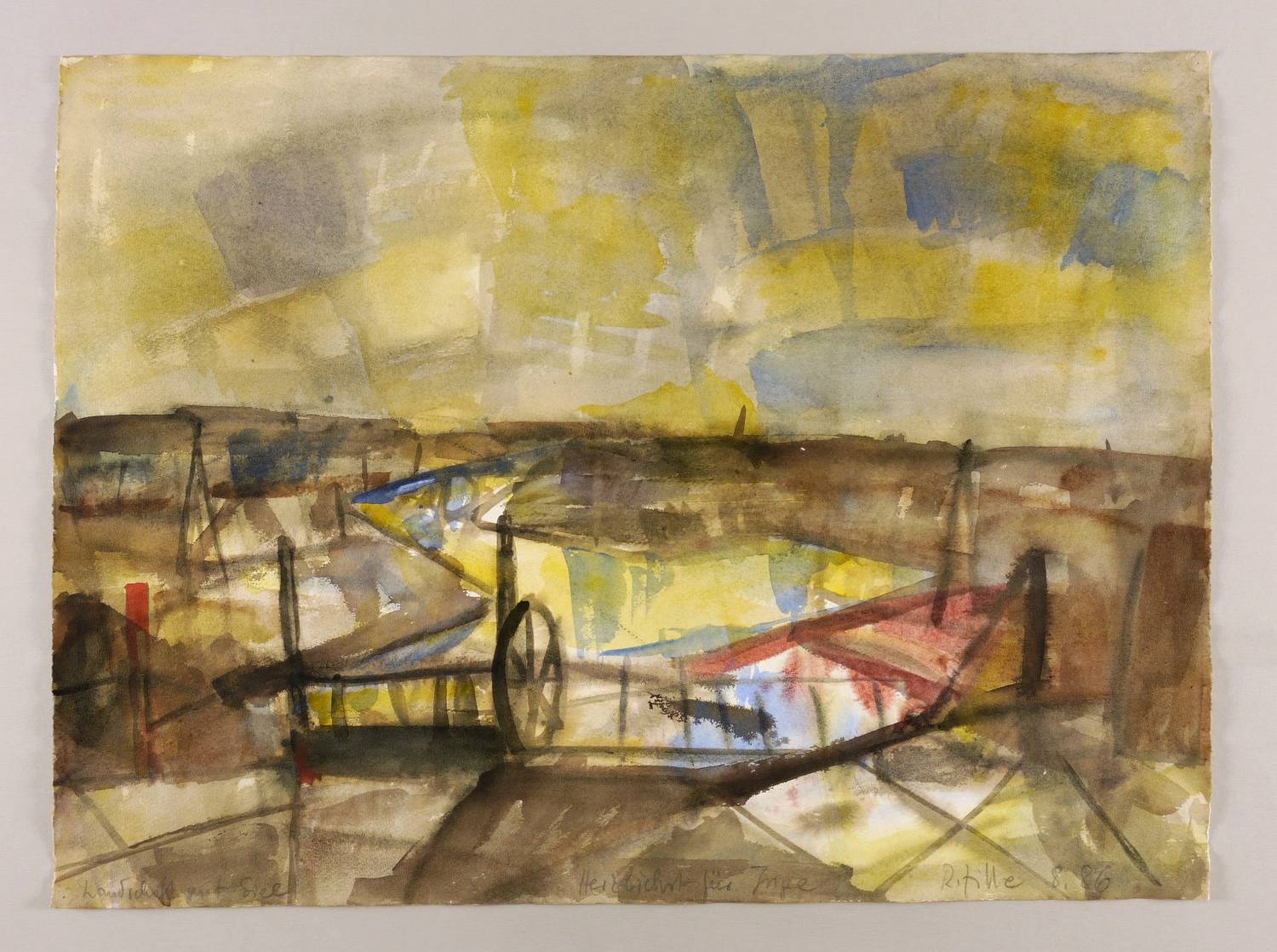 Rechts unten in Bleistift signiert und datiert: ″R. Zille 8.86″. Links Titel: ″Landschaft mit Siel″. Mittig Widmung. – Provenienz: Sammlung Gerlint und Gert Söder, Dresden. – Sehr guter Zustand.