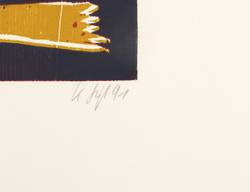 1991. Farbholzschnitt, in 3 Farben, auf weißem Werkdruck. – Originale Künstlergrafik, von Klaus Süß. – Auflage Exemplar Nr. 75/95. – 59,4 x 37,3 cm (Darstellung / Druckbild), 79 x 57 cm (Blatt).