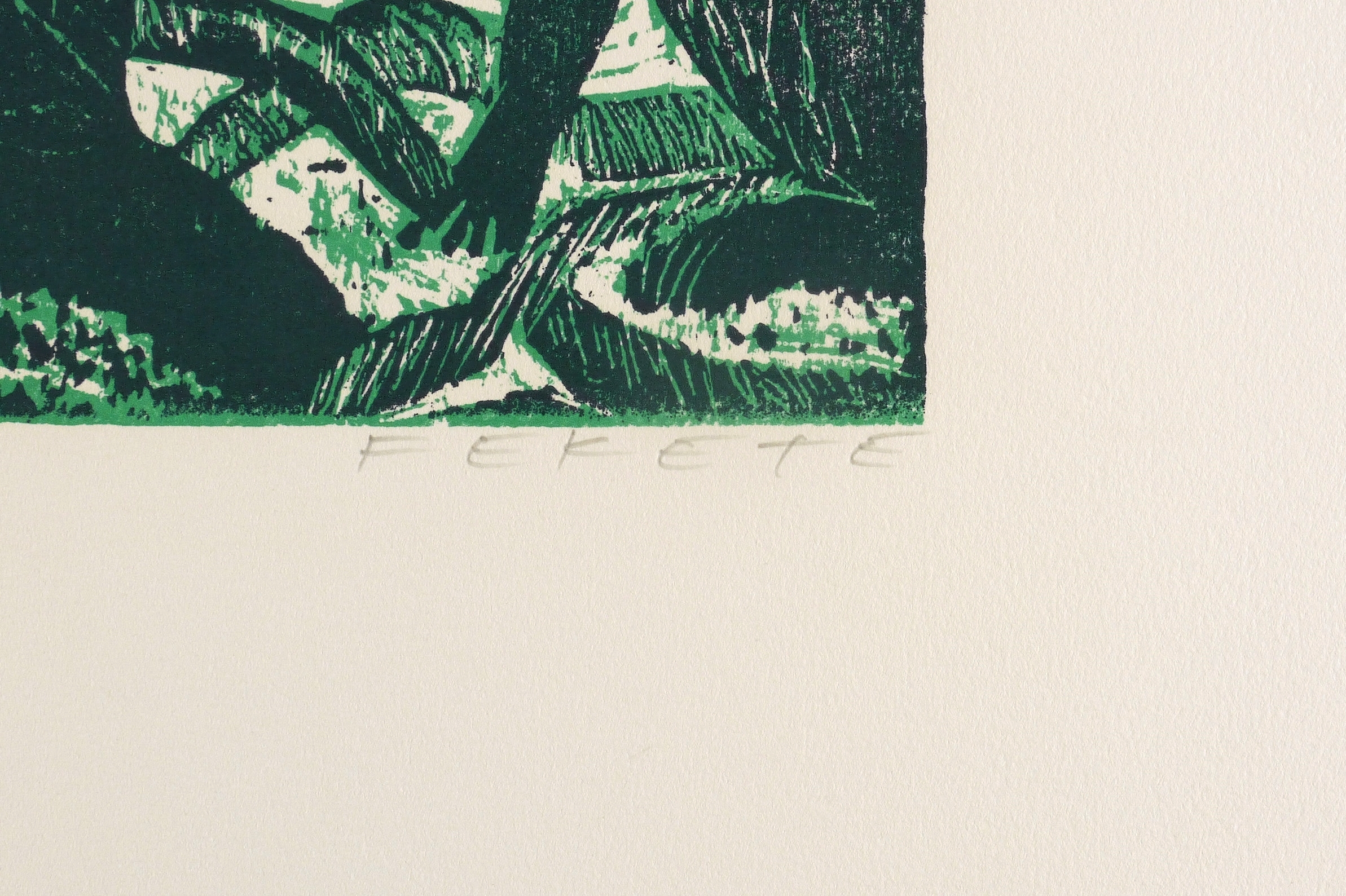 1991. Farbholzschnitt, in Grün & Schwarz, auf kräftigem hellchamois Johannot-Velin. – Originale Künstlergrafik, von Esteban Fekete. – Künstlerexemplar (e.a.). – 43,3 x 34,7 cm (Darstellung / Druckstock), 77 x 57 cm (Blatt).
