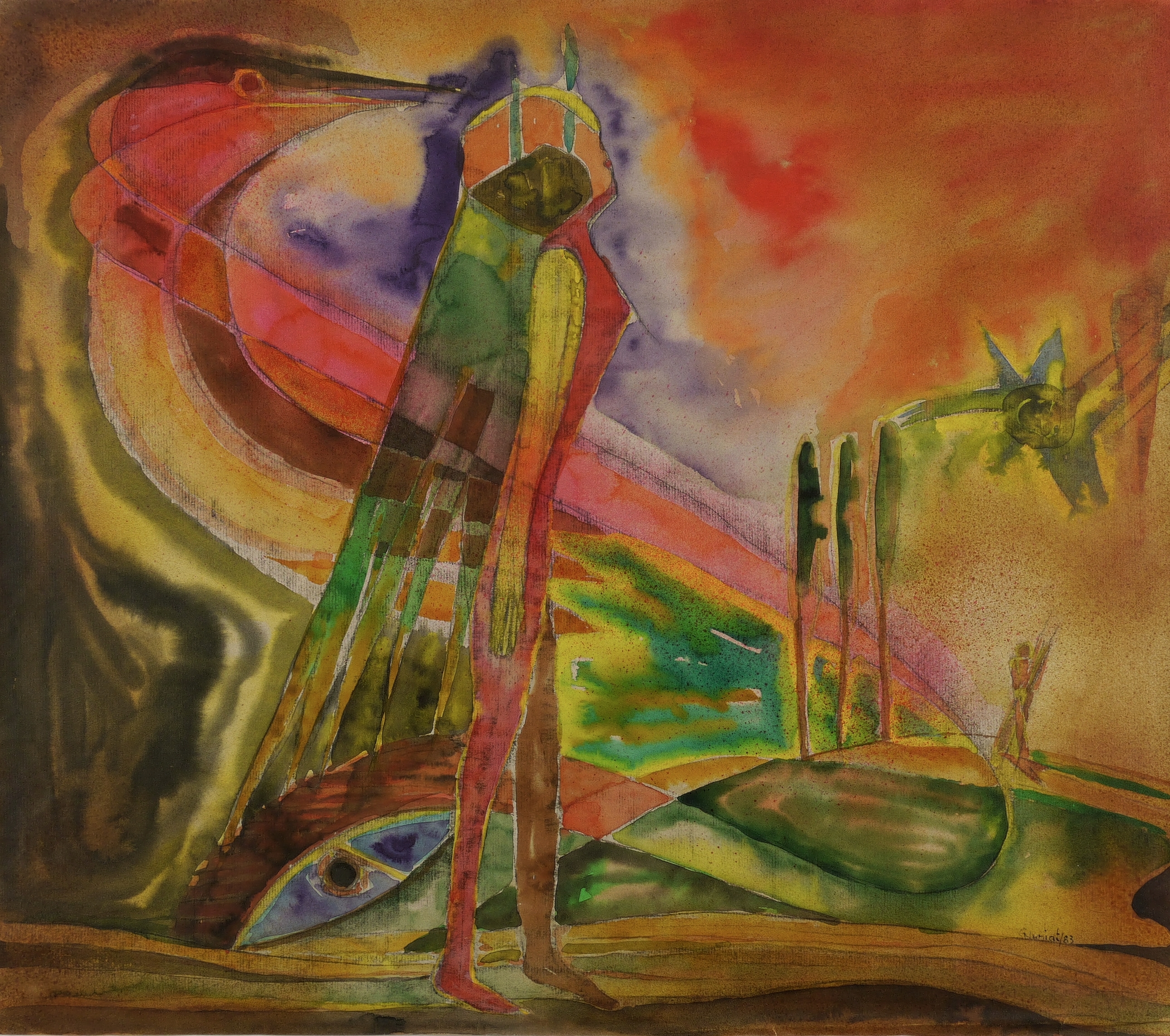 1983. Mischtechnik / Aquarell & Farbkreide, über Graphit, auf getöntem Maschinenbütten. – Originale Künstlergrafik, von Günther Huniat. – Unikat. – 58,8 x 66,3 cm (Darstellung / Blatt).
