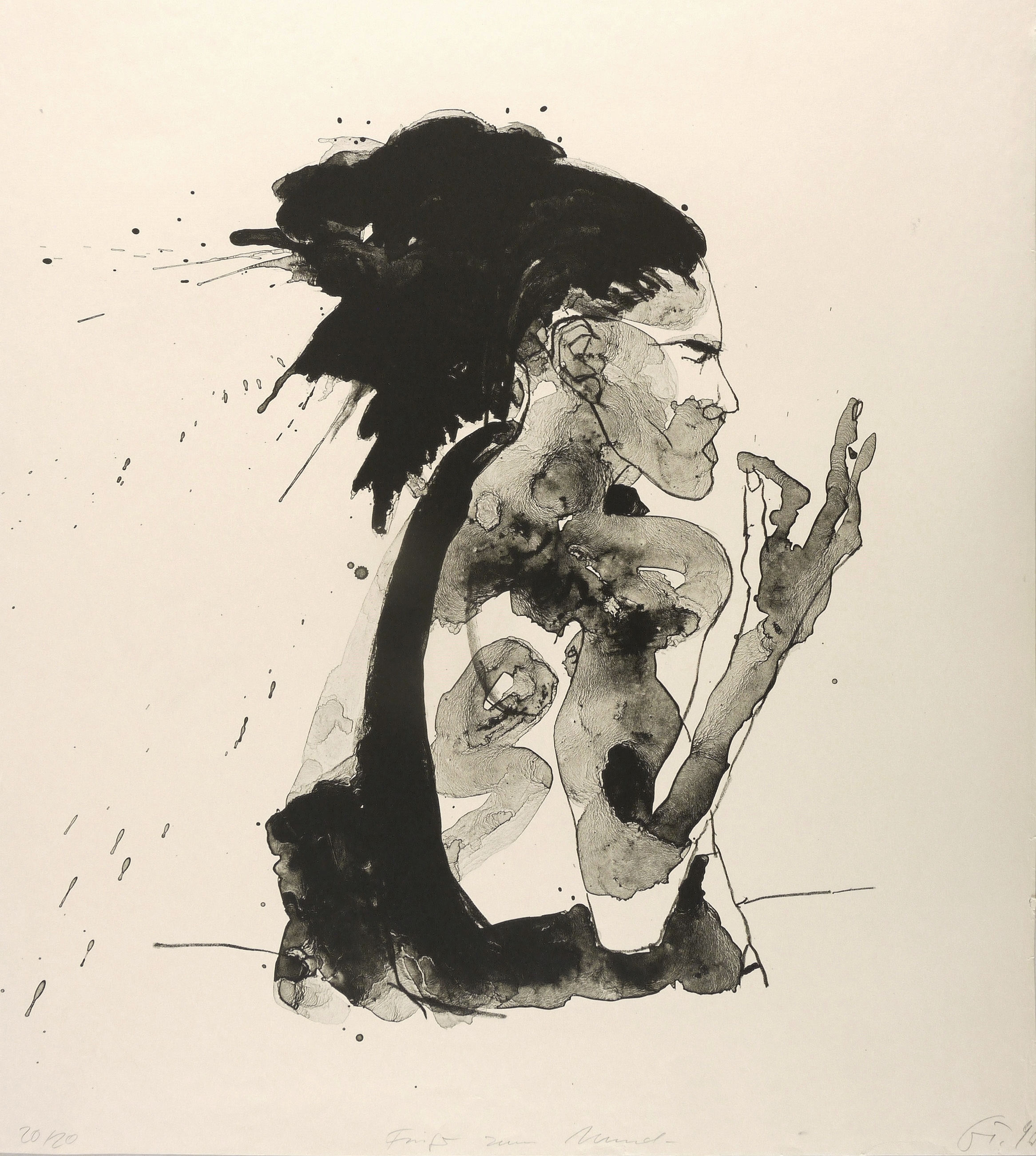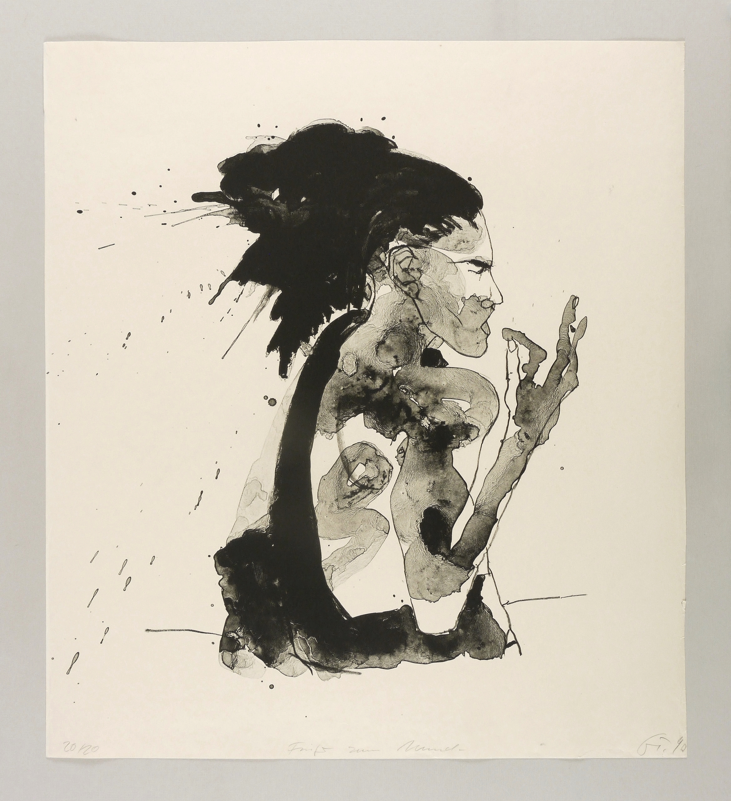 Rechts unten in Bleistift signiert und datiert: ″GT 90″. Links Auflagenbezeichnung: ″20/20″. Mittig Titel: ″Finger zum Mund″. – Umlaufend Randmängel. Mäßig guter Zustand.