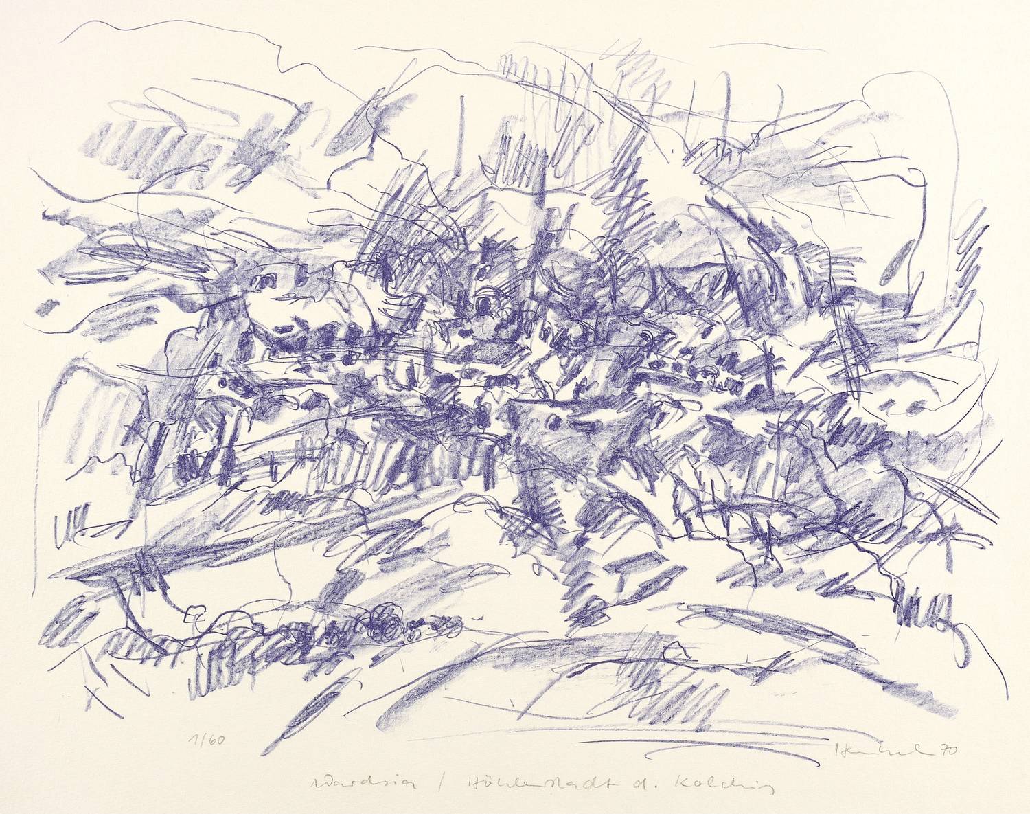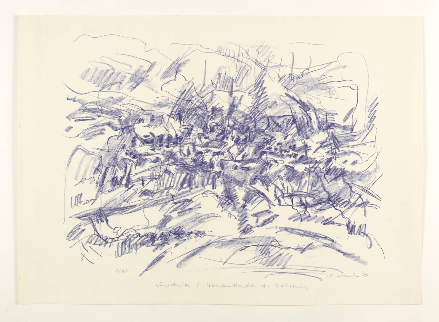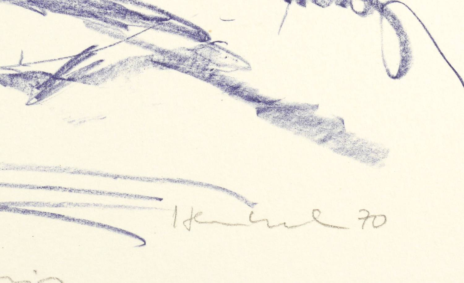 1970. Lithografie / Kreidelithografie, in Indigo-Blau, auf hellem Karton. – Originale Künstlergrafik, von Friedrich B. Henkel. – Auflage Exemplar Nr. 1/60. – 28,3 x 37,7 cm (Darstellung / Druckbild), 34 x 47 cm (Blatt).