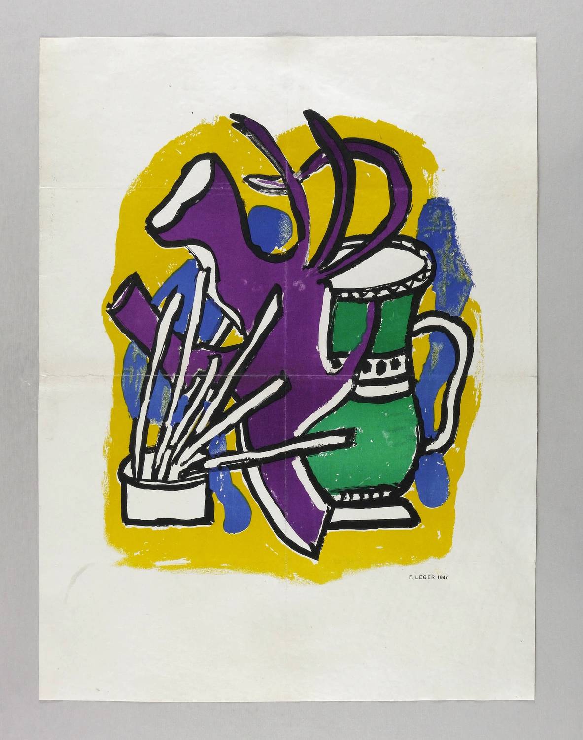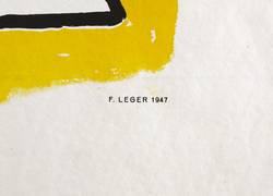 Nicht handsigniert. Rechts unten typografisch signiert und datiert: ″F. LEGER 1947″. Ohne den Textdruck des Plakats ober- und unterhalb der Darstellung. – Wohl Probedruck (wegen der fehlenden typografischen Beschriftung) für das originale Künstlerplakat in mehrfarbiger Lithografie nach einem Aquarell von 1947. Zur Ausstellung ″Die Meister französischer Malerei der Gegenwart / Bonnard - Braque - Chagall - Gris - Leger - Matisse - Picasso - Rouault″ 1947 im Friedrichsbau in Freiburg (Breisgau). Im Ausstellungskatalog explizit beschrieben: ″Auf dem Umschlag ist das von Fernand Léger für das Plakat der Ausstellung überlassene Aquarell (1947) wiedergegeben.″ (Jardot, Maurice & Kurt Martin, Die Meister französischer Malerei der Gegenwart, Baden-Baden 1948, S. 57). - Druck der Imprimerie Nationale G. Waldkirch. – Als Blatt vierfach gefaltet gewesen. Daher rührende Knickfalten weitgehend geglättet, aber mit leichtem Farbverlust an den Bruchkanten. Etwas mangelhafter bis mäßig guter Zustand.