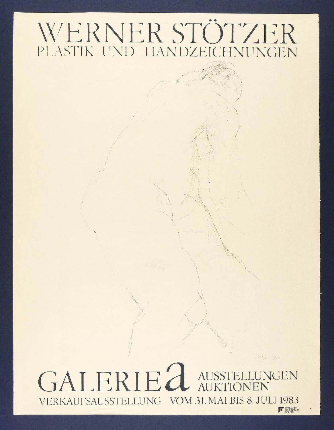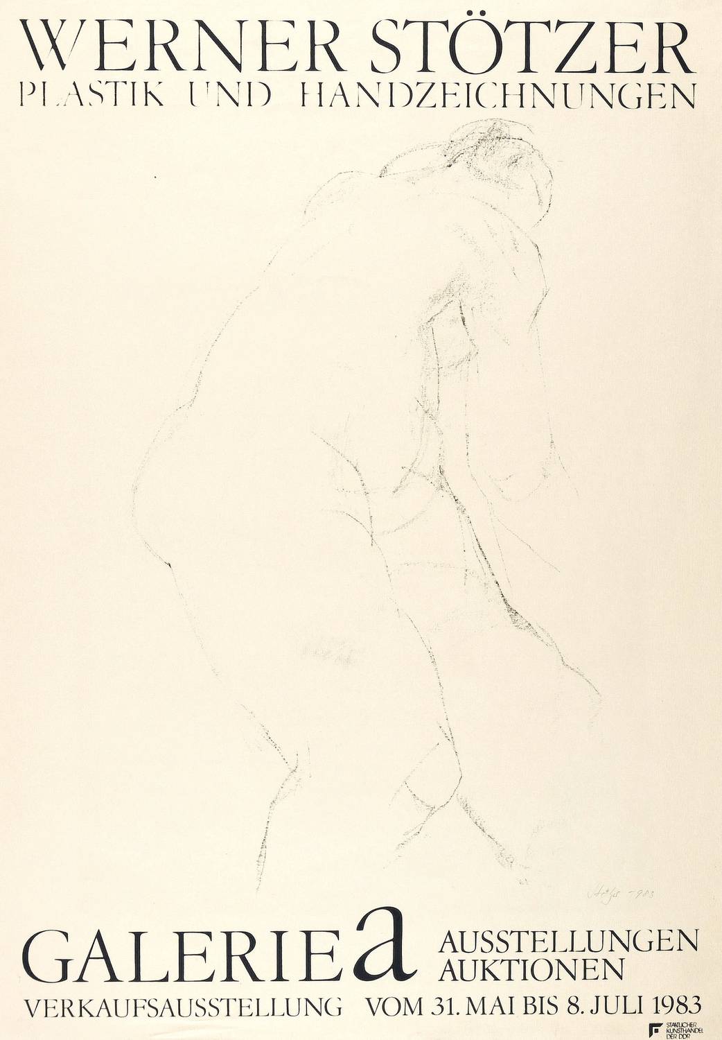 Rechts unten in Bleistift signiert und datiert. Ober- und unterhalb typografisch bezeichnet. Rechts unten Stempel Staatlicher Kunsthandel der DDR. – Originalgrafisches Künstlerplakat zur Ausstellung ″Werner Stötzer. Plastik und Handzeichnungen″ in der Galerie a in Berlin 1983. – Leichte Randmängel, Bestoßungen und Knickspuren. Insgesamt mäßig guter Zustand.