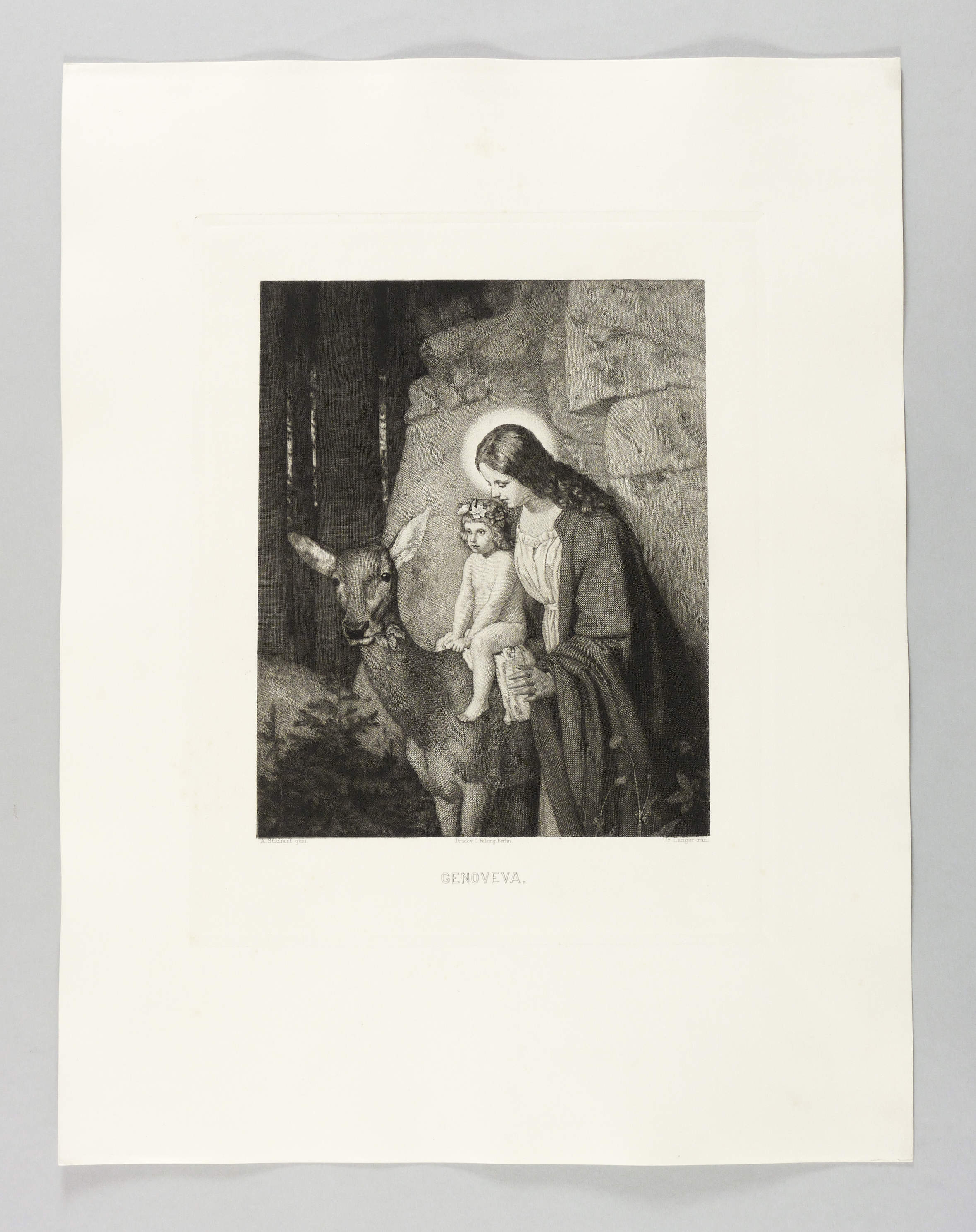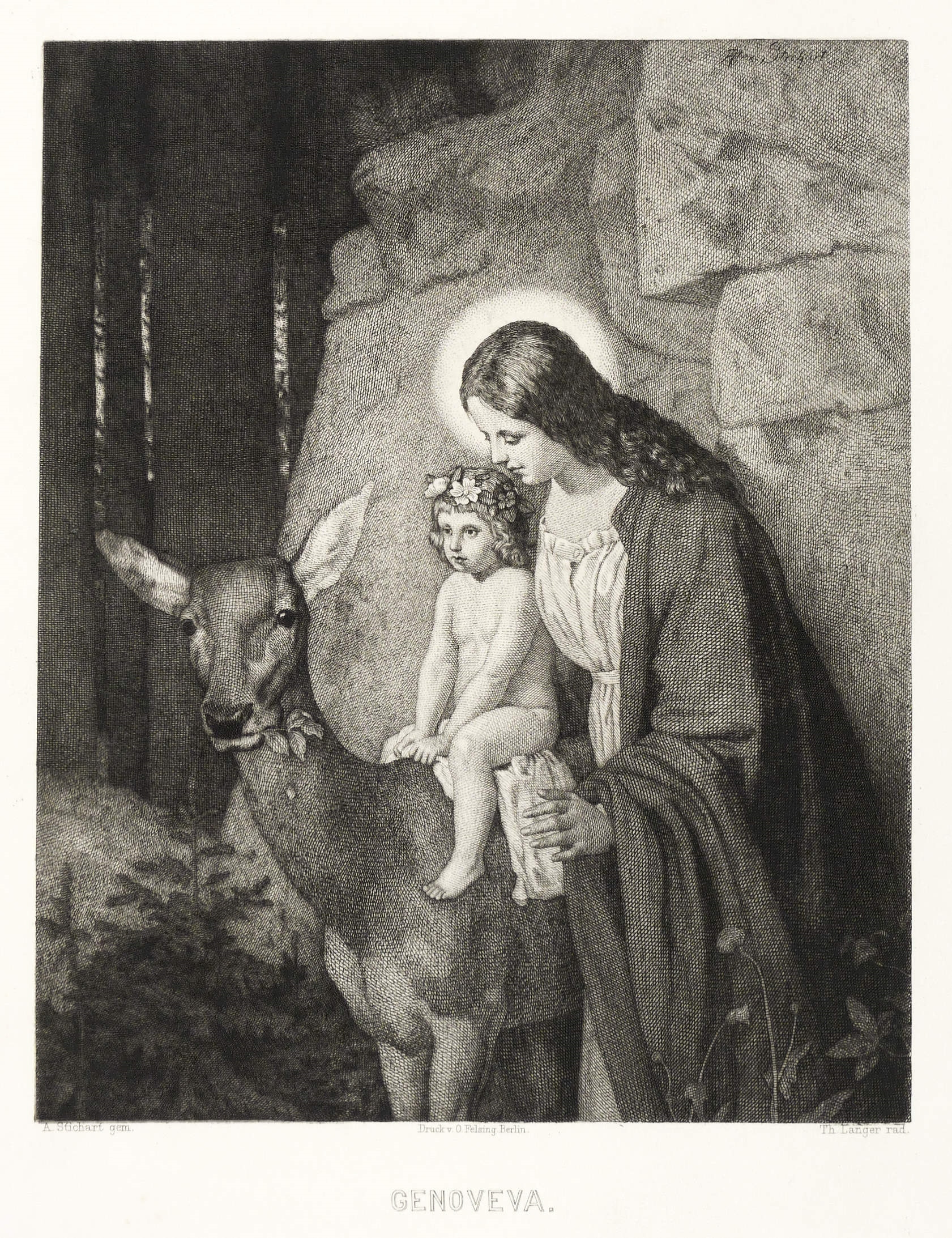 Aus: Vereinsgeschenk des Sächsischen Kunstvereins auf das Jahr .. (Dresden: Sächsischer Kunstverein 1896), Bd. 13. – In der Platte rechts unten gestochene Signatur: "Th. Langer. rad." In der Darstellung rechts oben Signatur des wiedergegebenen Gemäldes: "Alex. Stichart". Mittig Druckeradresse von Otto Felsing, Berlin. Darunter Titel: "GENOVEVA." – Originalrandiges Exemplar. Sehr guter Zustand.