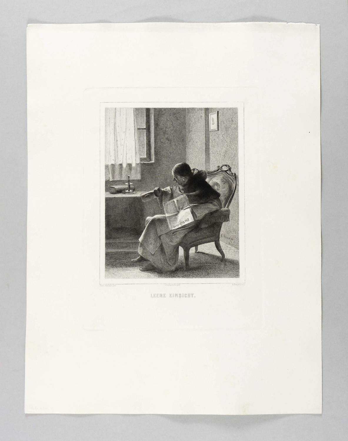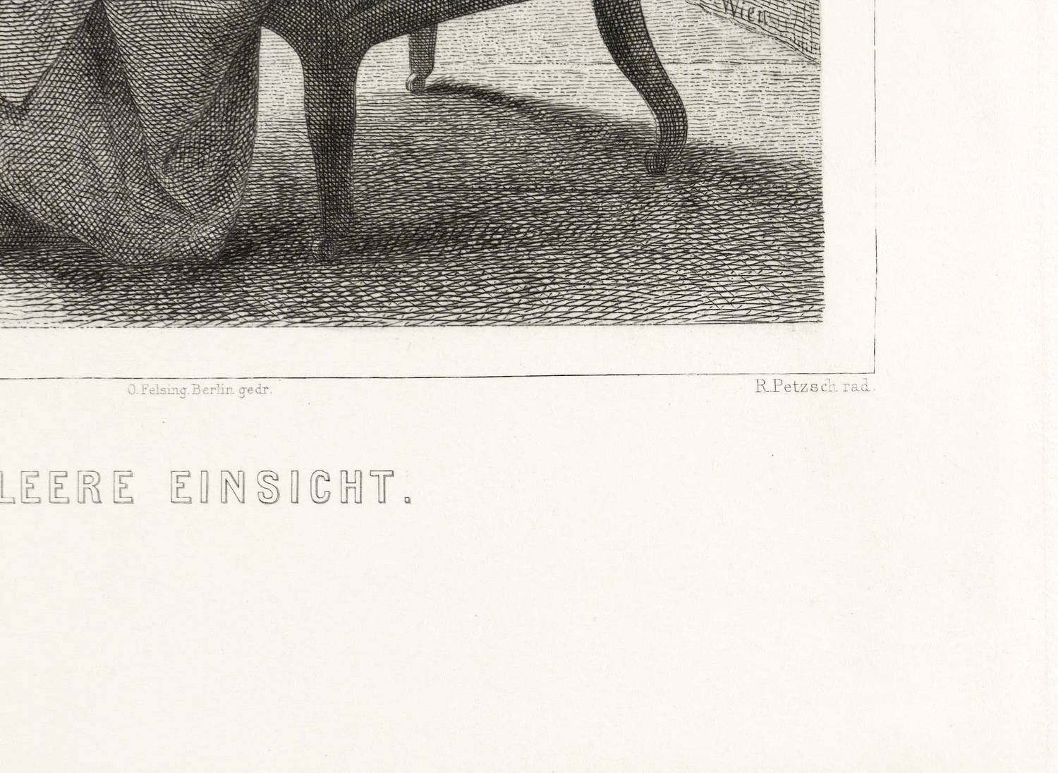 Aus: Vereinsgeschenk des Sächsischen Kunstvereins auf das Jahr ... (Dresden: Sächsischer Kunstverein 1891), Bd. 10. – In der Platte rechts unten gestochene Signatur: "R. Petzsch rad." In der Darstellung rechts unten Signatur des wiedergegebenen Gemäldes: "E. Strecker Wien". Mittig Druckeradresse von Otto Felsing, Berlin. Darunter Titel: "LEERE EINSICHT". – Originalrandiges Exemplar. Sehr guter Zustand.