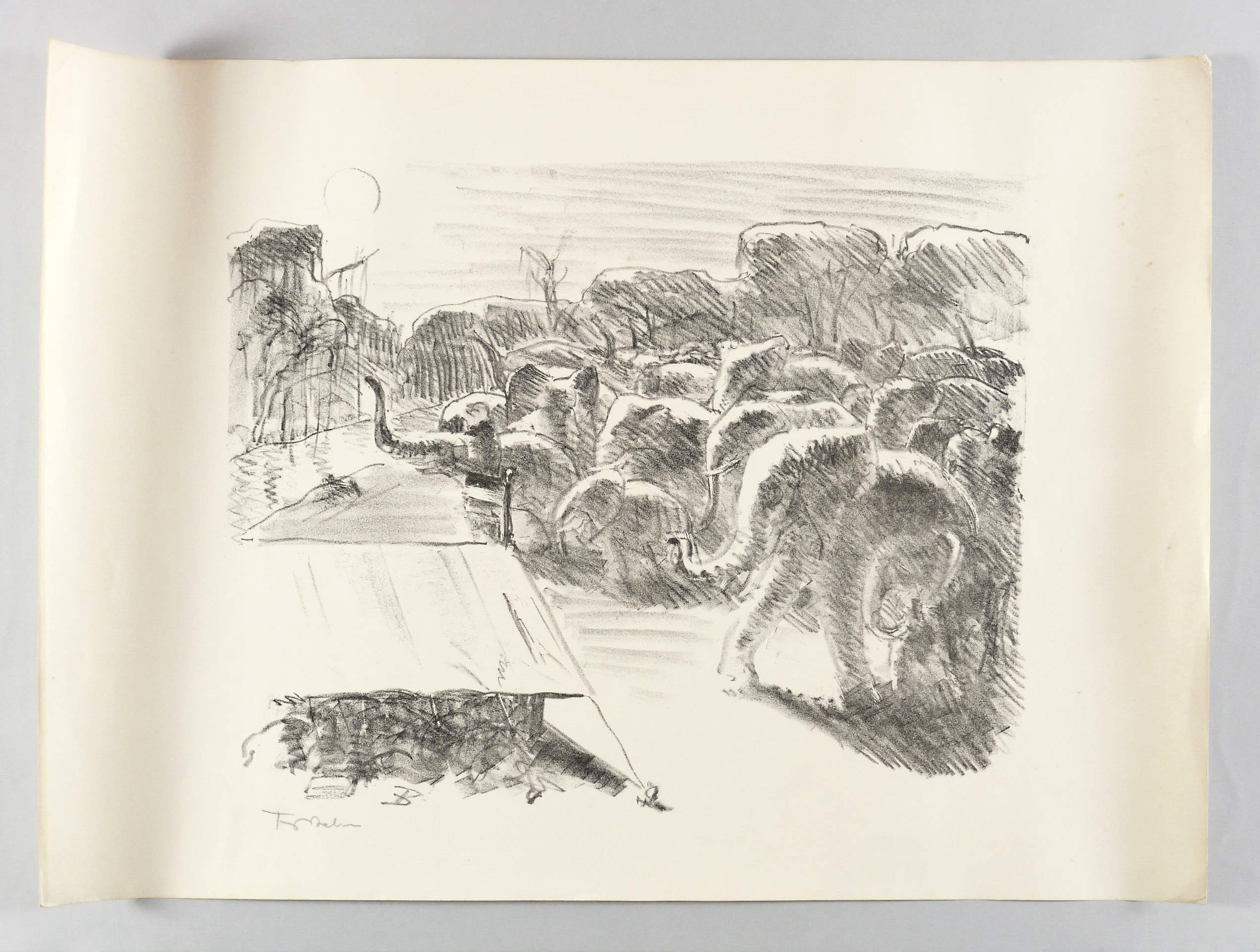Aus: Fritz Behn, Afrikanische Visionen. 14 Lithographien von Fritz Behn (München: Piper 1914). – Links unten in Bleistift signiert: ″Fr Behn″. Darüber im Stein nochmals monogrammiert. – Originalrandiges unbeschnittenes Exemplar. Papier gegilbt und im Rand etwas knickspurig. Insgesamt guter Zustand.