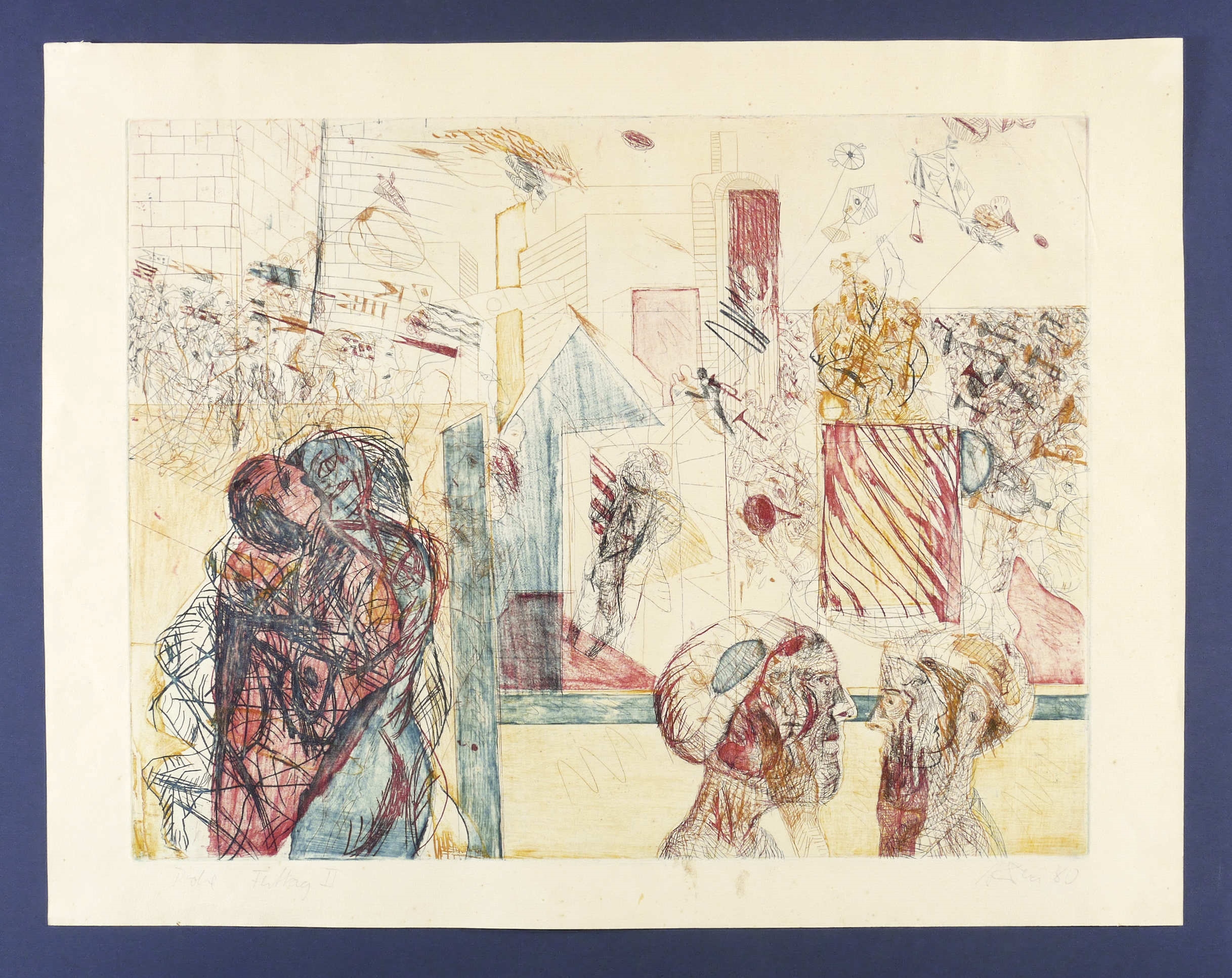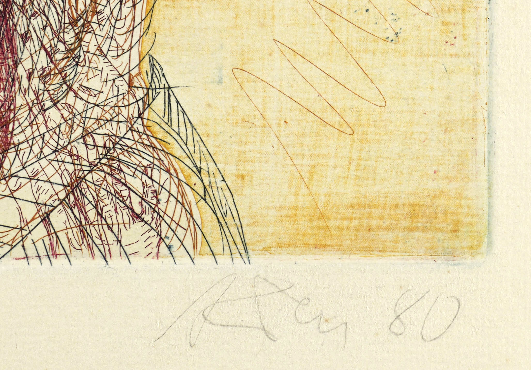 1980. Farbradierung / Strichätzung, in Ocker, Rot, Blau & Schwarz, auf gelblichem Karton. – Originale Künstlergrafik, von Andreas Dress. – Probedruck. – 49,5 x 64,4 cm (Darstellung / Platte), 59 x 76 cm (Blatt).