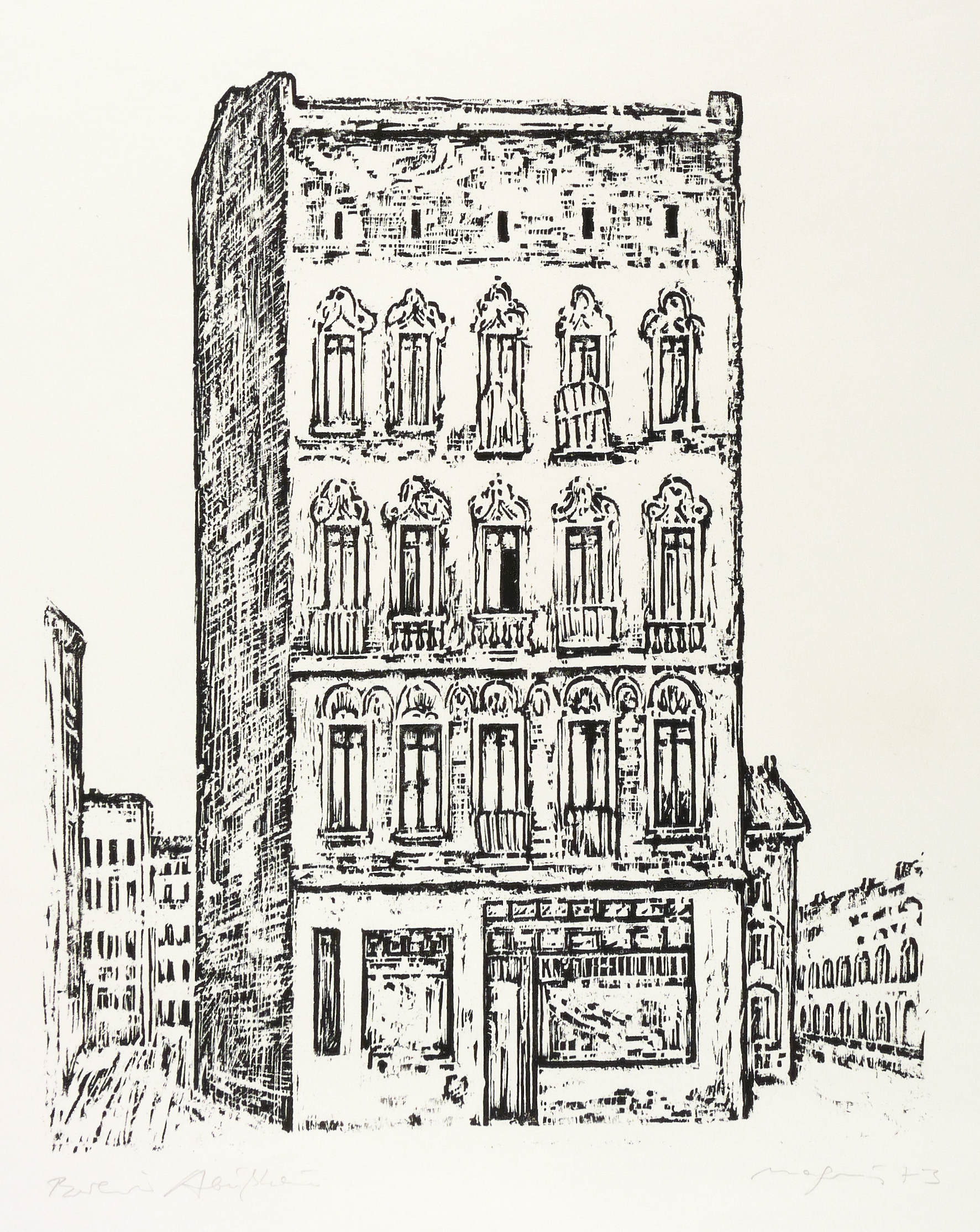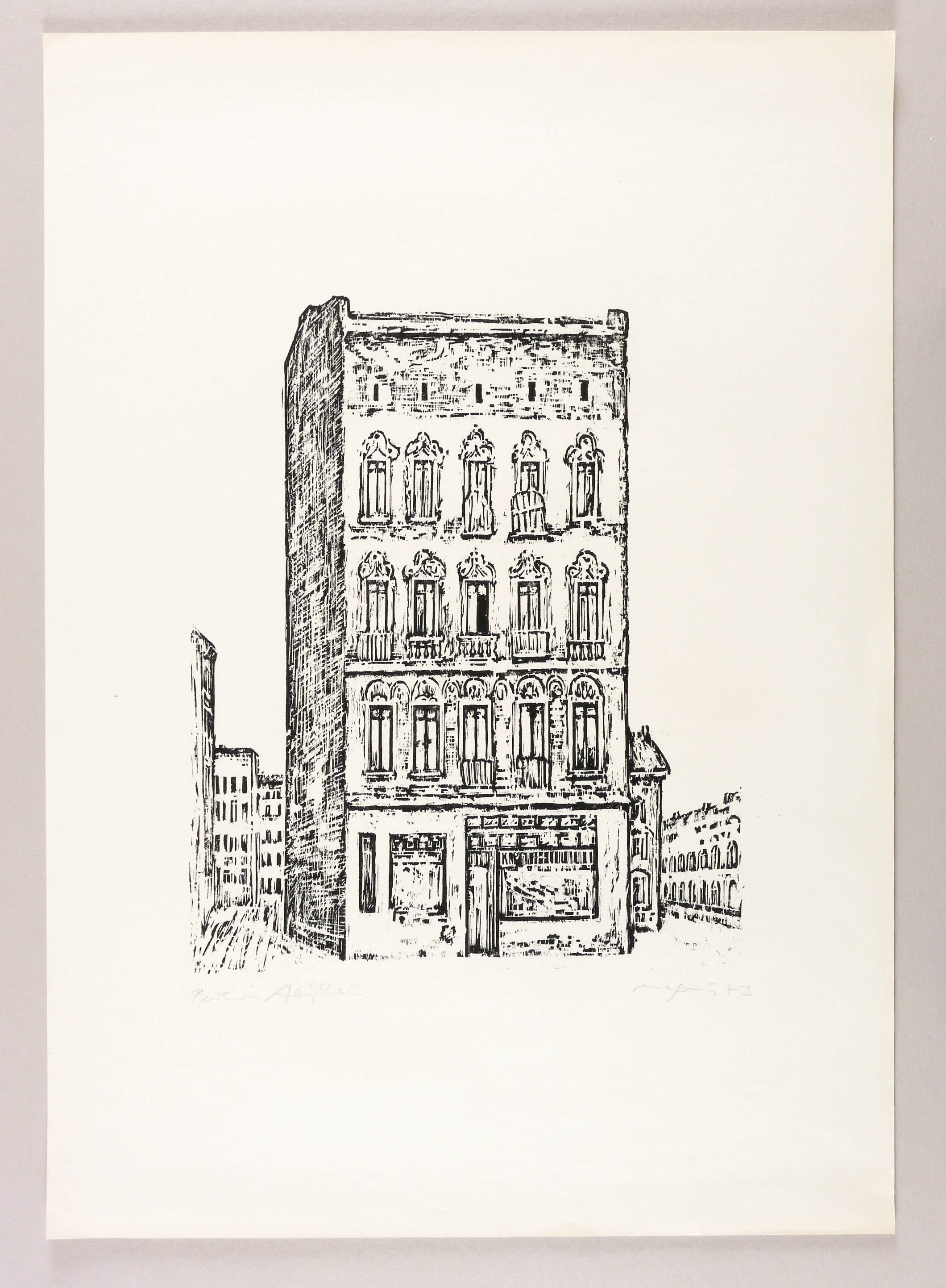 Rechts unten in Bleistift signiert und datiert: ″Magnus 73″. Links Titel: ″Berliner Abrißhaus″. Verso Stempel und Nummer der Plauener Grafikgemeinschaft. – Unscheinbare Lagerspuren. Insgesamt sehr gut erhalten.