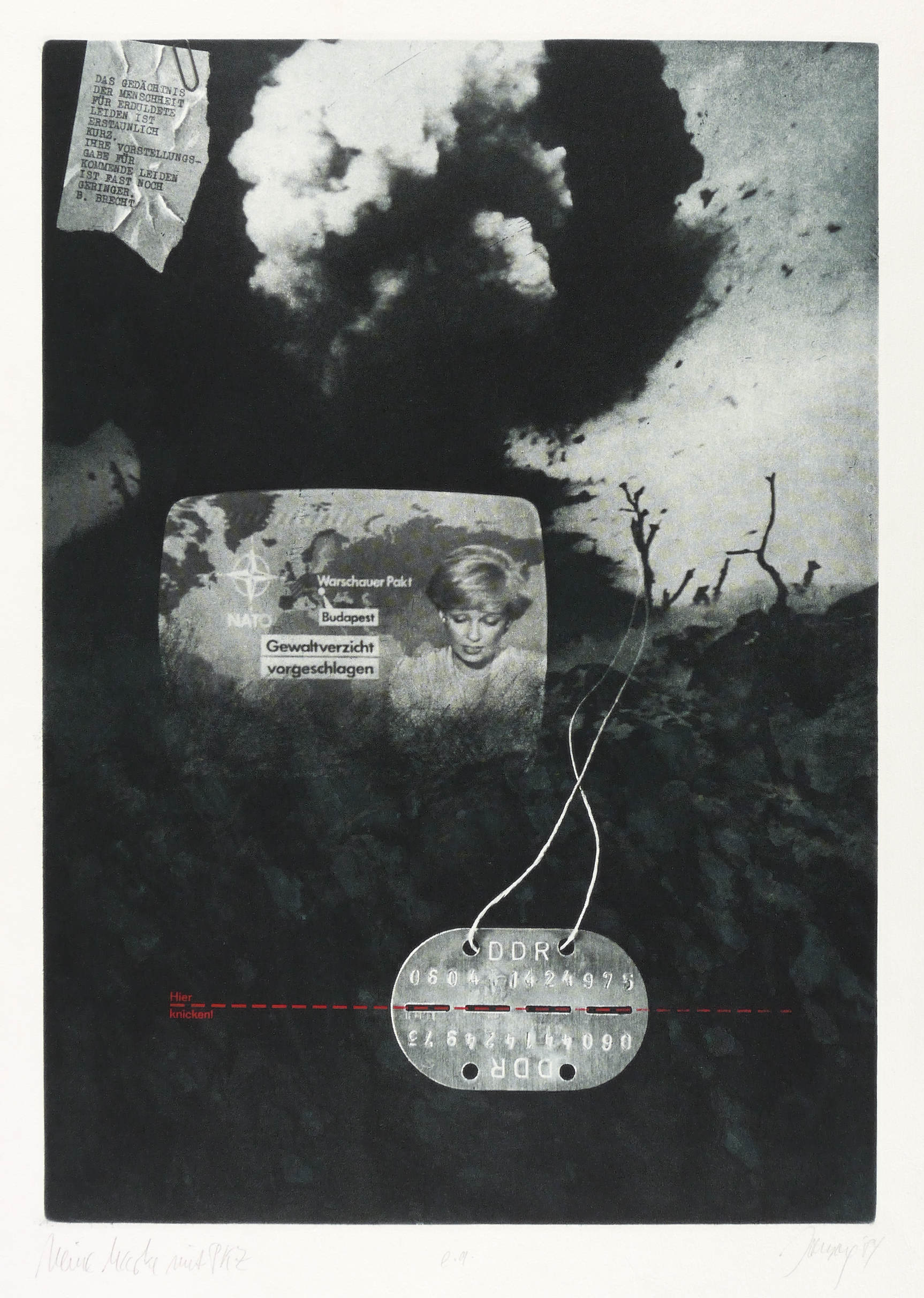Rechts unten in Bleistift signiert und datiert: ″Jansong 84″. Links Titel: ″Meine Marke mit PKZ″. Mittig Auflagenbezeichnung: ″e.a.″ – Die dargestellte Marke ist eine Erkennungsmarke der Nationalen Volksarmee (NVA), die Soldaten in der DDR tragen mussten. Sie dient eigentlich der Identifizierung gefallener Soldaten. Darin eingestanzt die Personenkennzahl (PKZ), mittig die perforierte Sollbruchstelle. – Breiter Papierrand mit leichten Lagerspuren. Insgesamt guter Zustand.