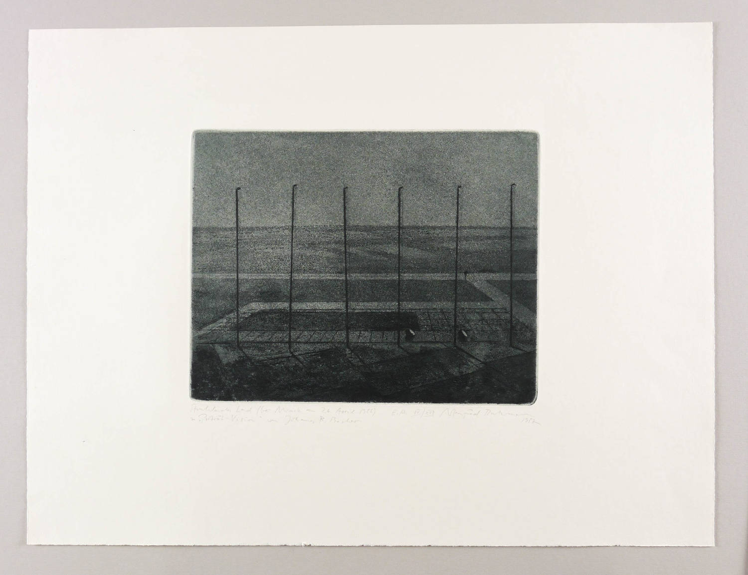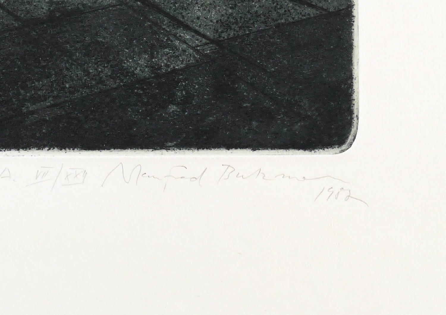 1987. Radierung / Aquatinta & Strichätzung, in Schwarzblau, auf chamois Velin. – Originale Künstlergrafik, von Manfred Butzmann. – Künstlerexemplar Nr. VII/XXII. – 25,5 x 32,3 cm (Darstellung / Platte), 49 x 64 cm (Blatt).